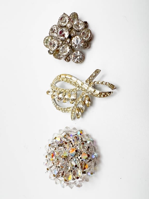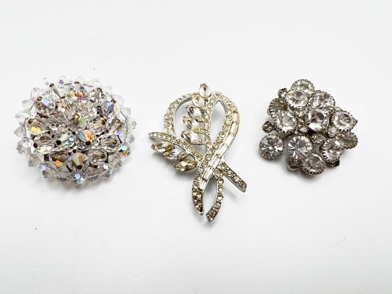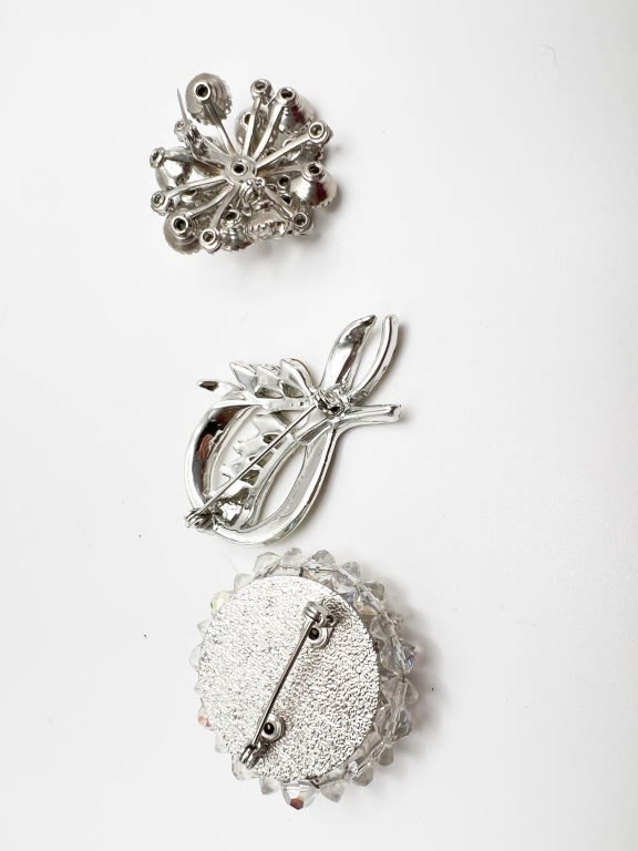 RHINESTONE VINTAGE BROOCH TRIO ON SILVER TONE