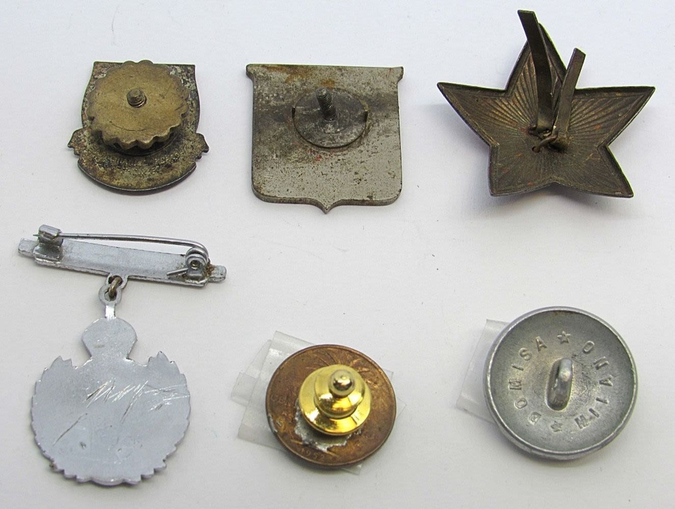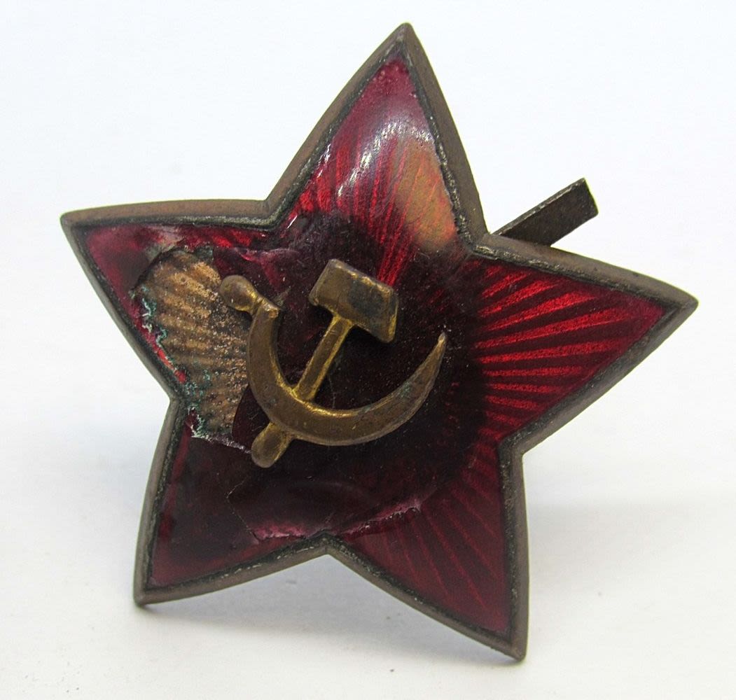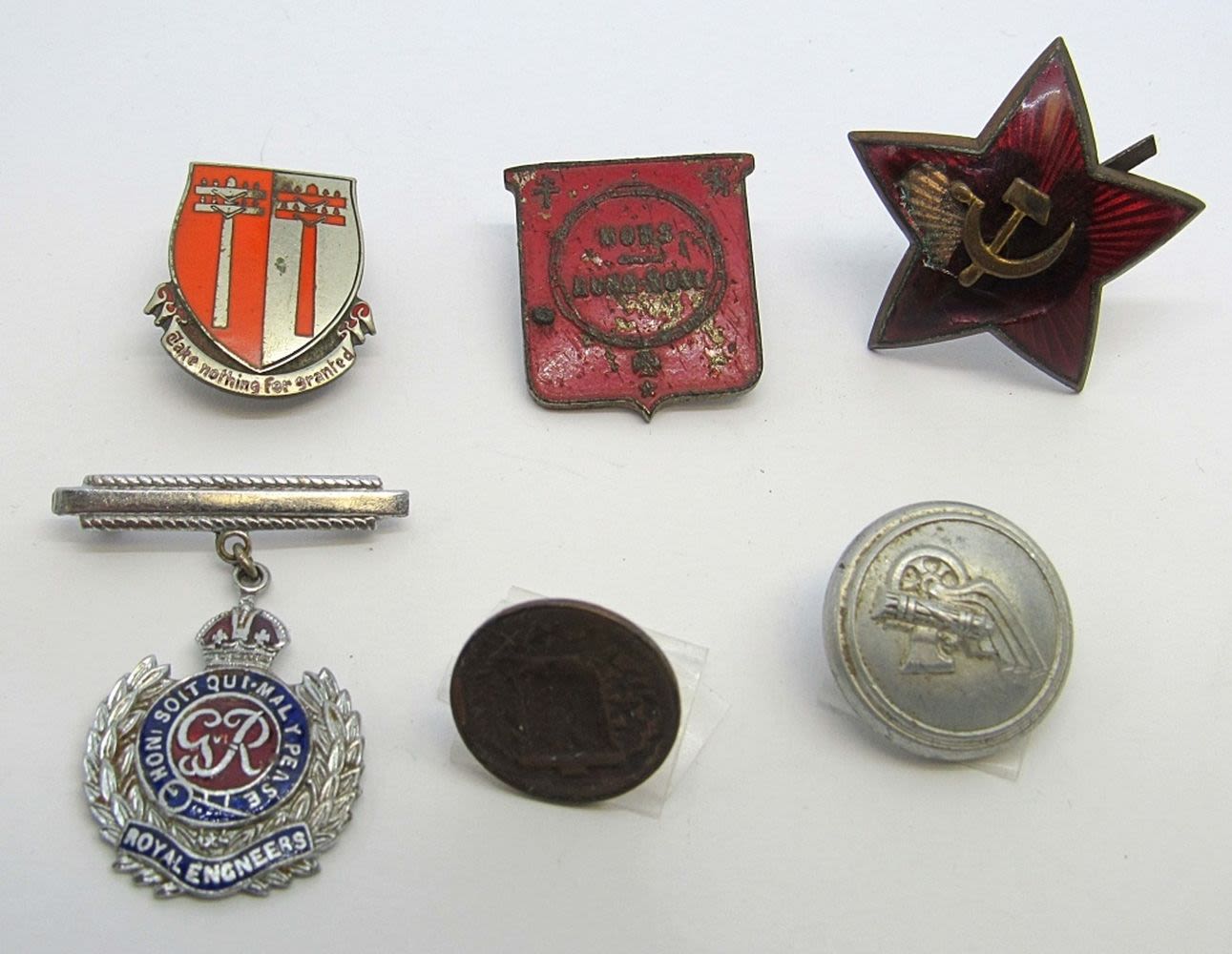 GRANITED; RUSSIAN STAR HAT PIN with chip; ROYAL ENGINEERS PIN, BUTTON with WING INSIGNIA, SCREW BACK RED FOREIGN PIN & FOREIGN COIN MADE INTO PIN