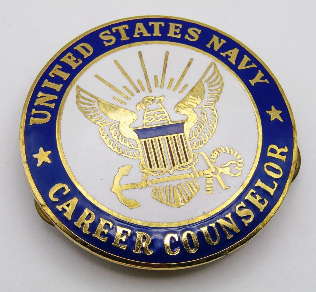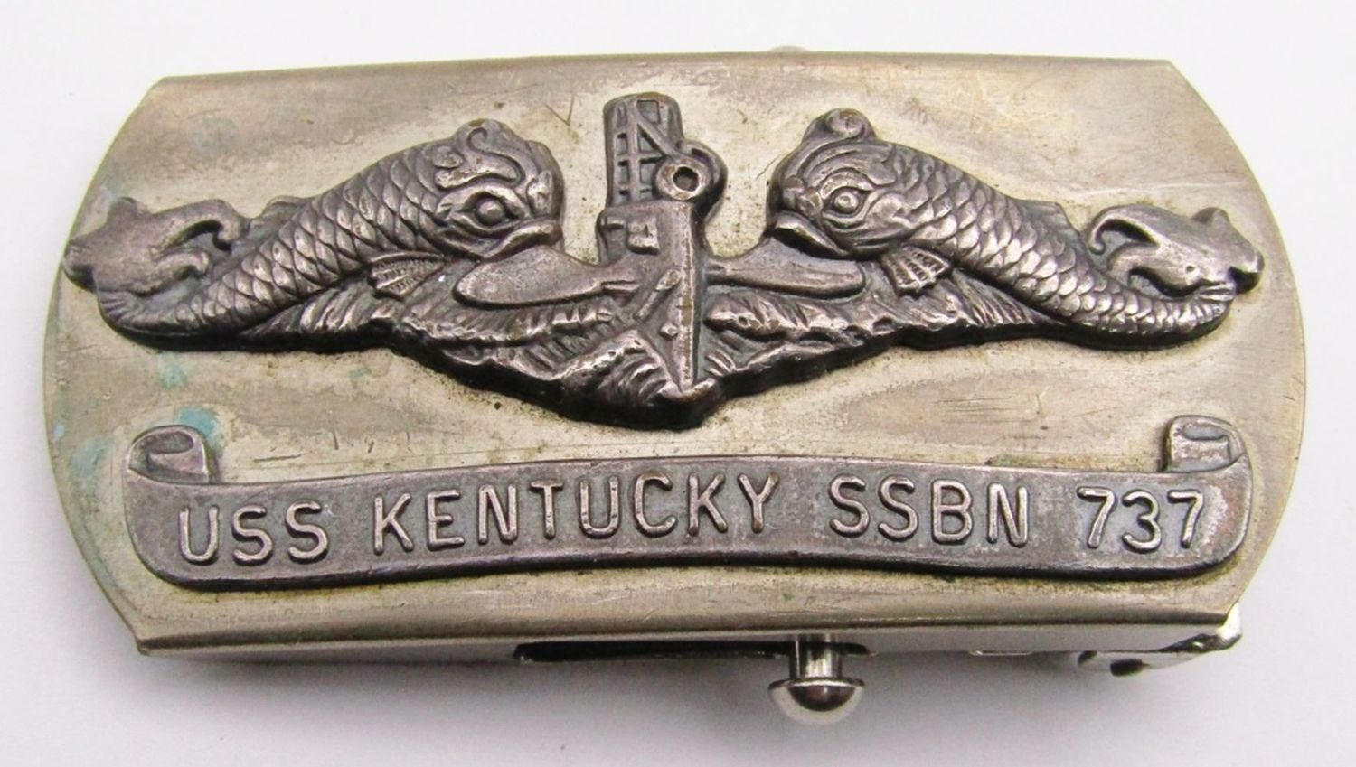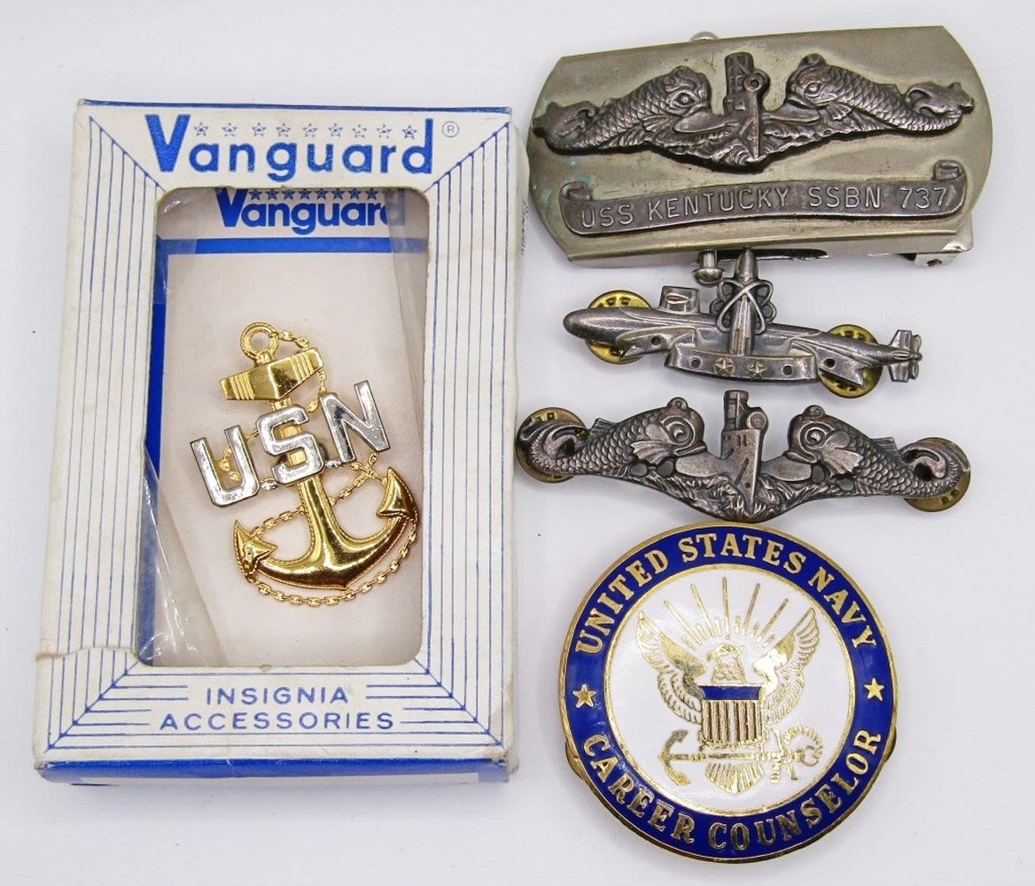 USS KENTUCKY SSBN 737 VINTAGE BUCKLE; (2) NAVY SUBMARINE METAL PINS, NAVY CAREER COUNSELOR LARGE HAT PIN, U.S.N. ANCHOR ACCESSORIE in BOX