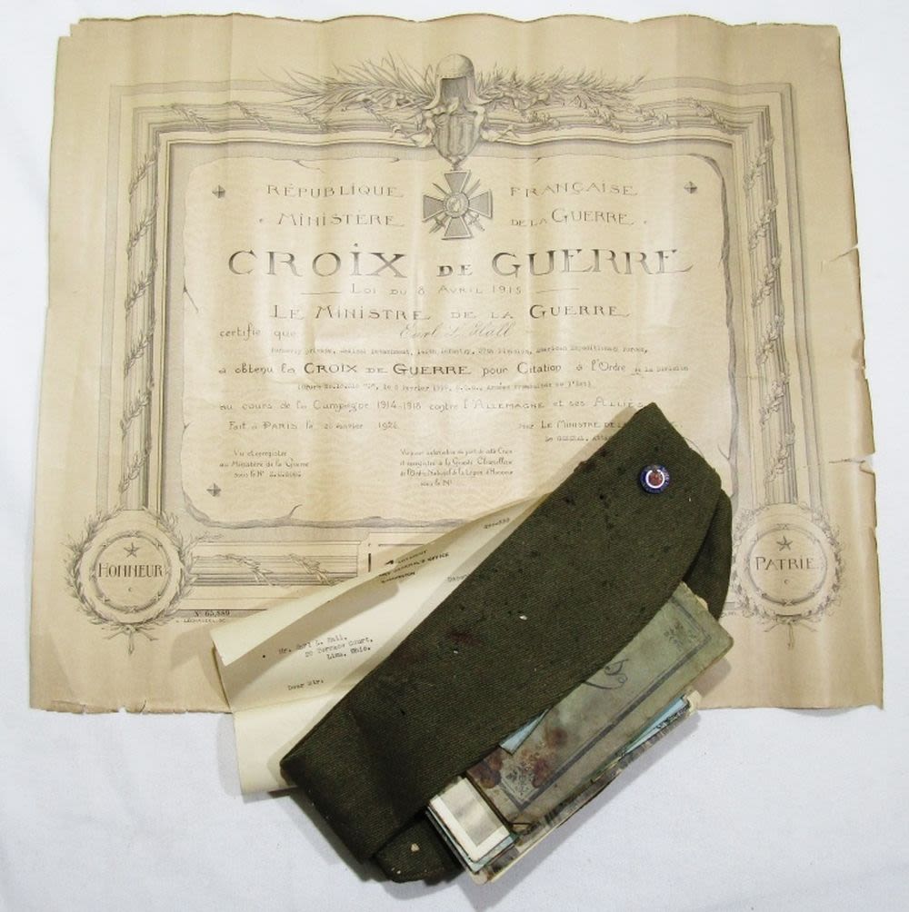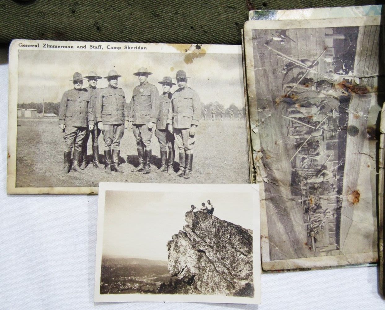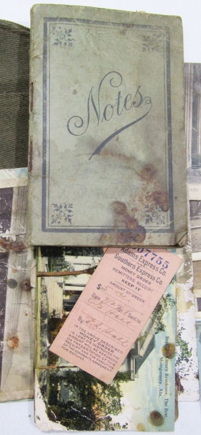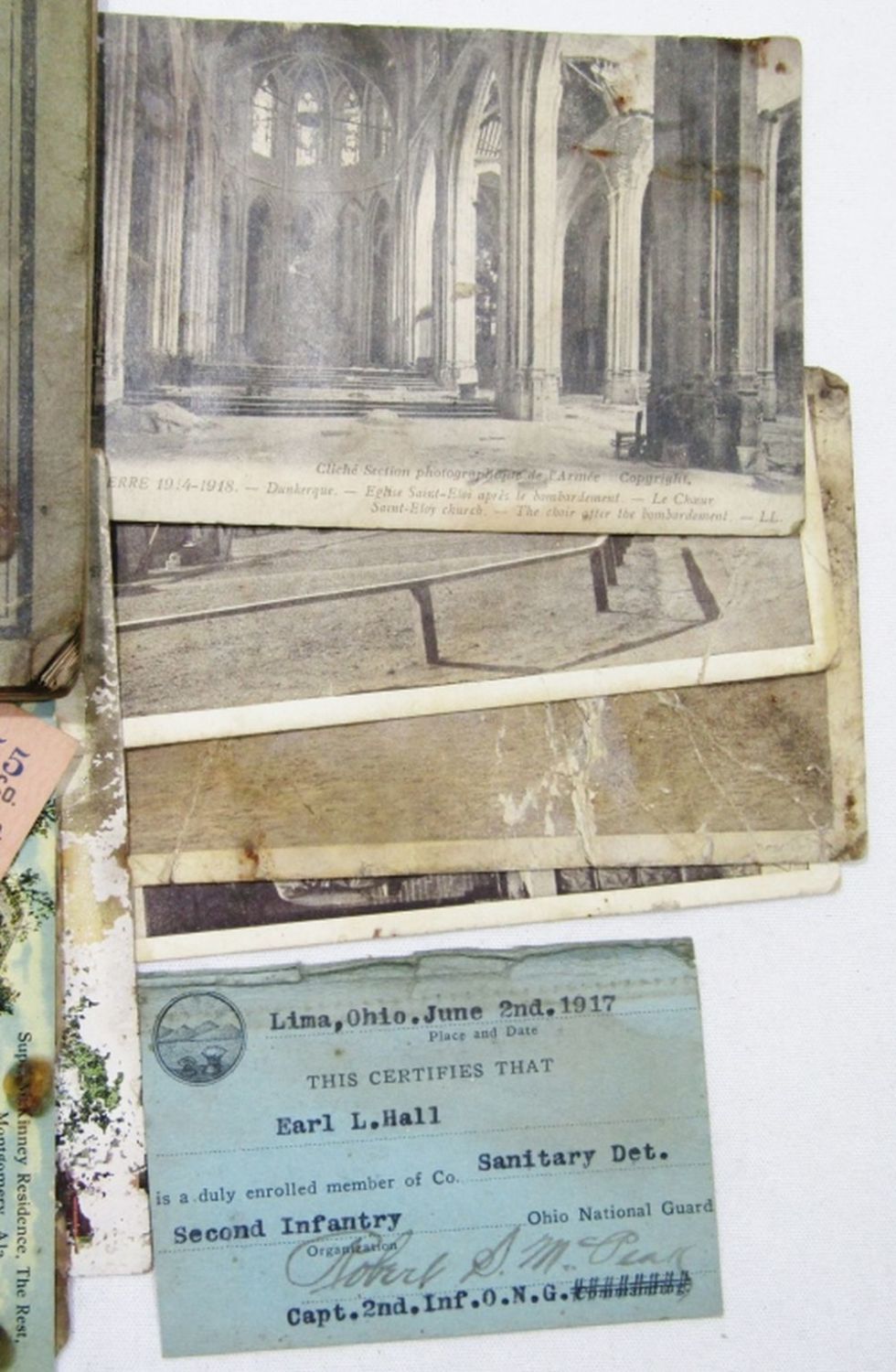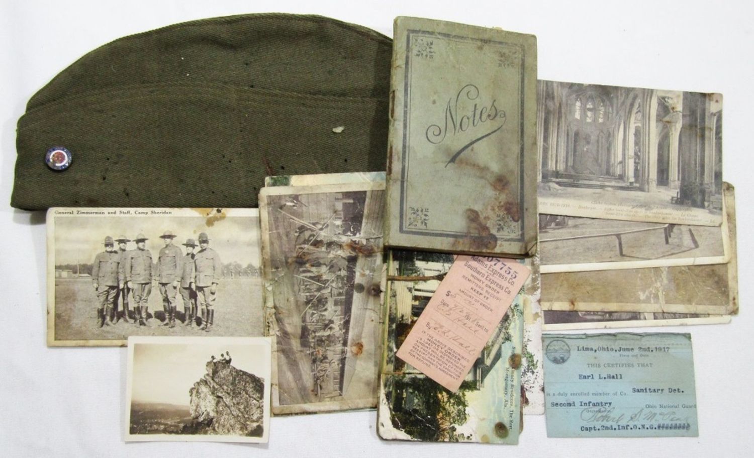 with LETTER DATED 1926 from WAR DEPT, CAMP SHERIDAN POST CARDS rough condition, BOOKLET with NOTES & ADDRESSES, 1917 NATIONAL GUARD CERT, VETERANS HAT with PIN & MORE