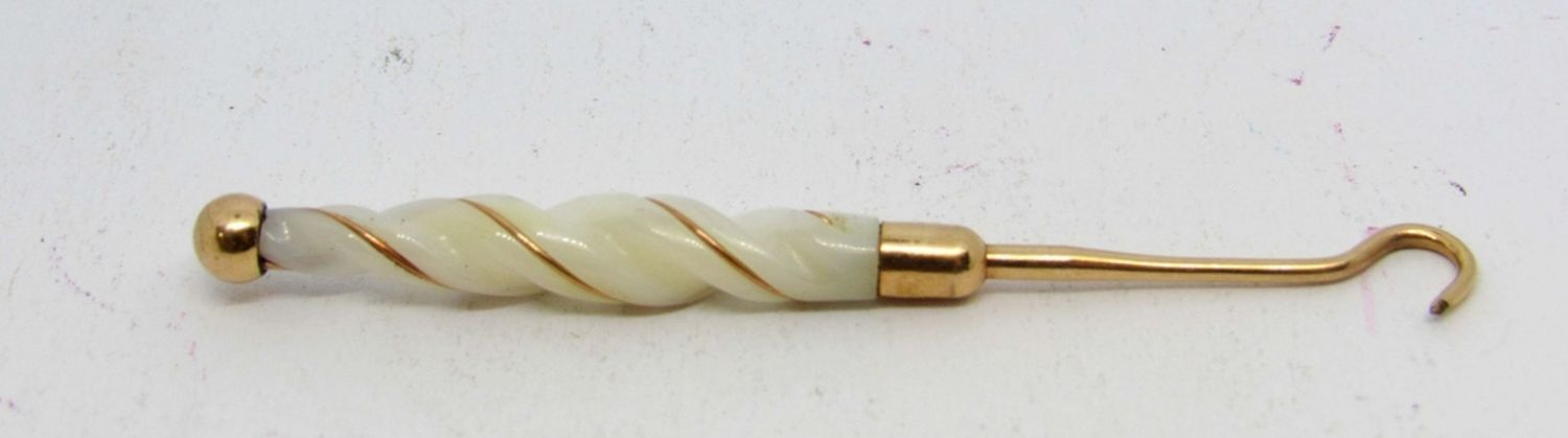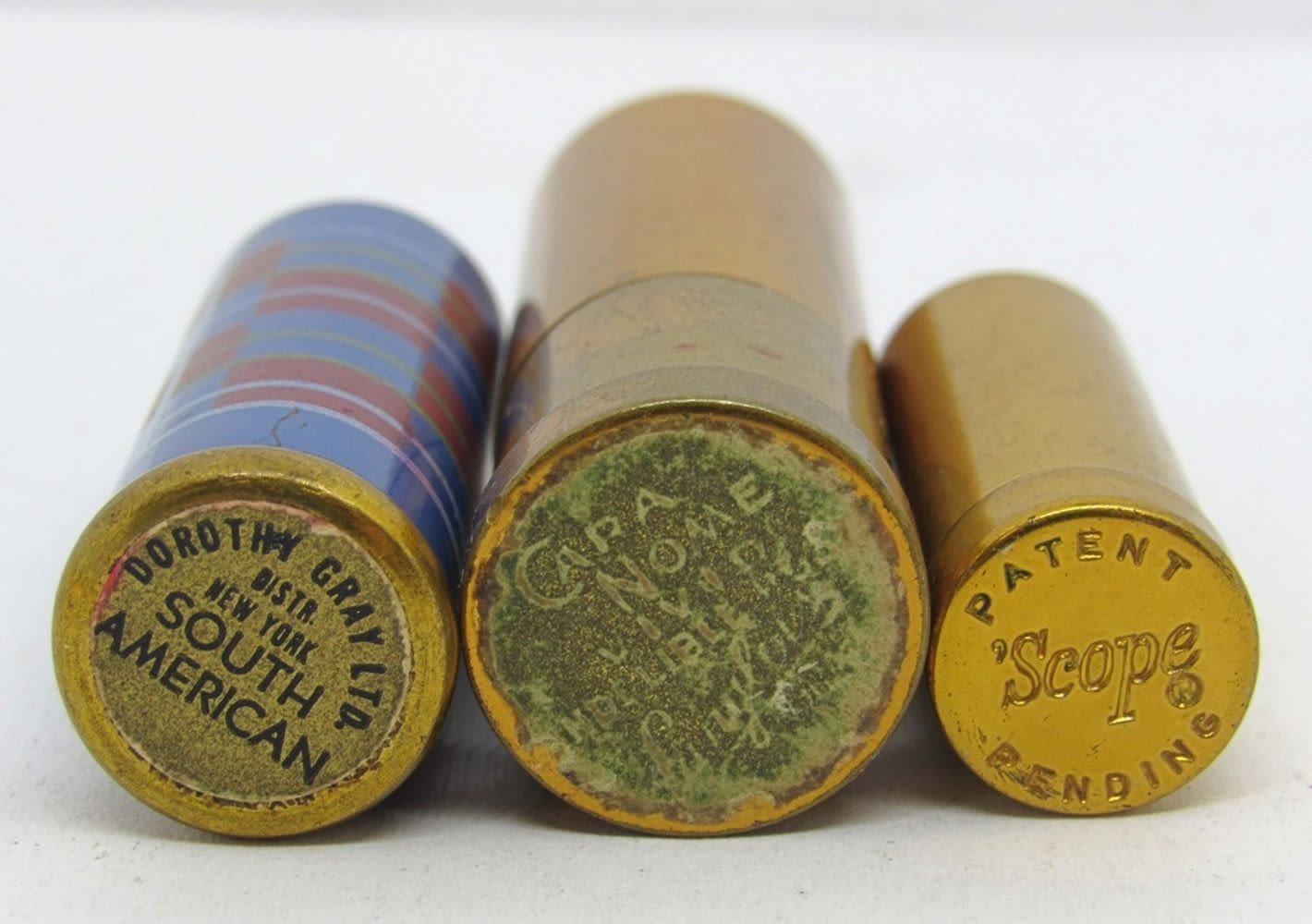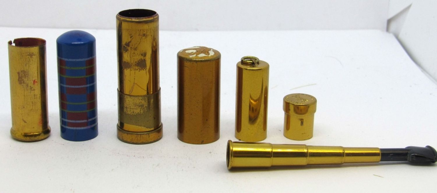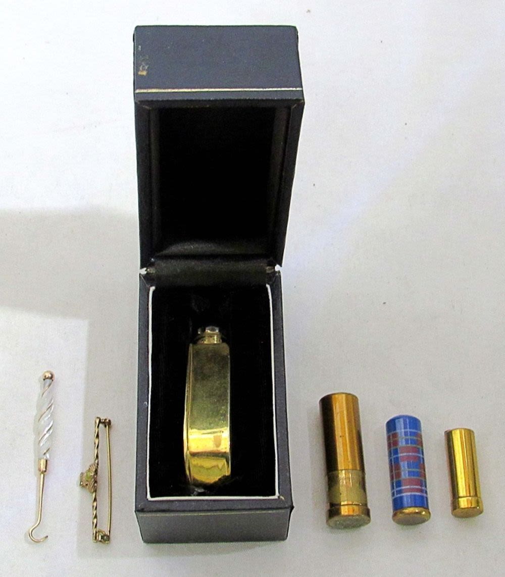 Art Deco Marcel Franck Gold Filigree “Week-End” Perfume Atomizer, (2) LIPSTICK CASES – CARA NOME & DOROTHY GRAY, CIGARETTE SCOPE GOLD TONE, PEARL HANDLE BUTTON HOOK, VINTAGE PIN w/FROG