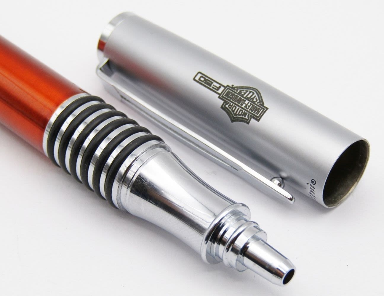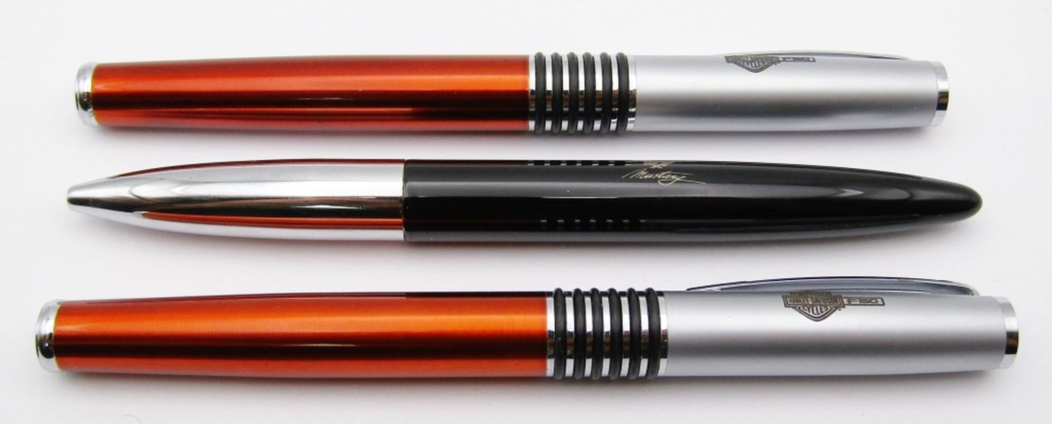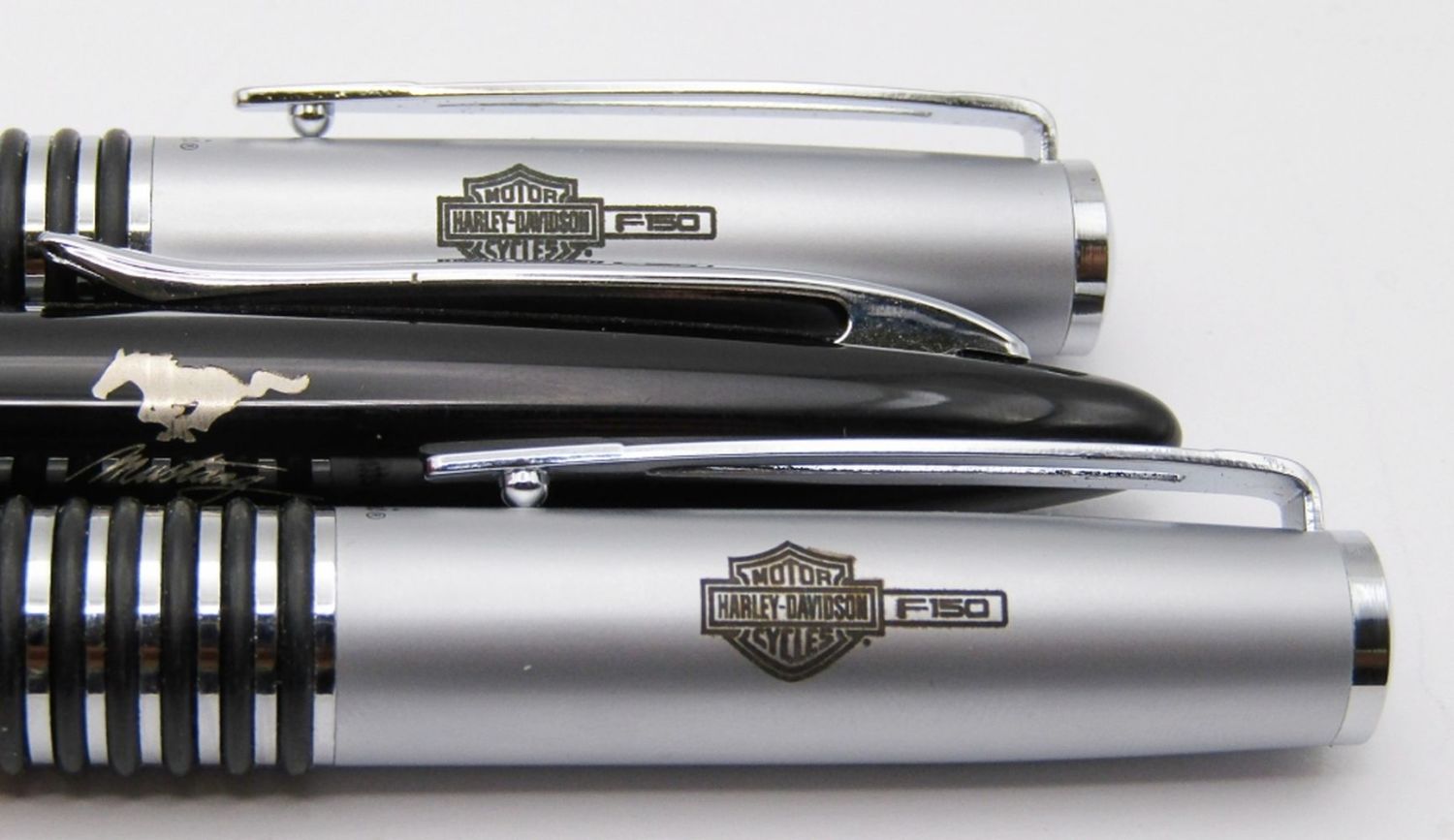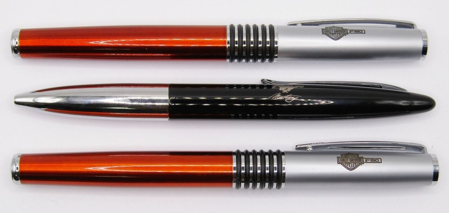 2 ARE ORANGE WITH HARLEY DAVIDSON F150 ENGRAVED ON THE CAP & 1 OF THESE DOES NOT HAVE A PEN FILLER INSIDE, JUST THE BODY OF THE PEN; 1 IS ENGRAVED WITH ‘MUSTANG’ ON THE PEN; GOOD CONDITONS!