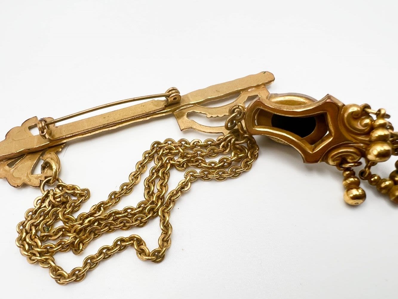 KEY CHAIN AND LOCK BROOCH WITH LARGE BLACK DANGLE STONE AND CHAIN