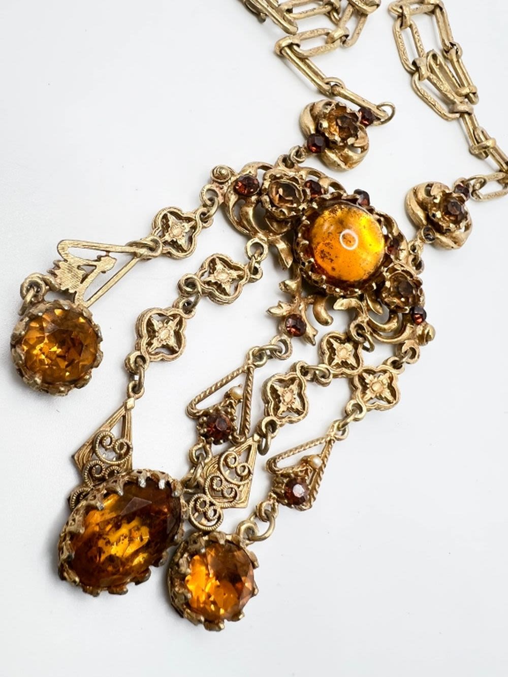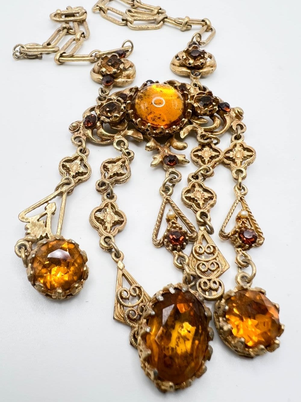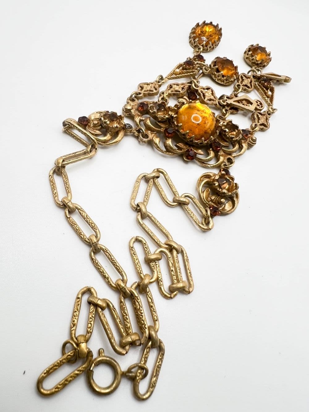 VINTAGE LUPE SIGNED HEAVY NECKLACE, DOG TOOTH PRONGS, MANY LARGE FACET CUT AMBER STONES DANGLING SURROUND A LARGE AMBER OVAL CENTER STONE