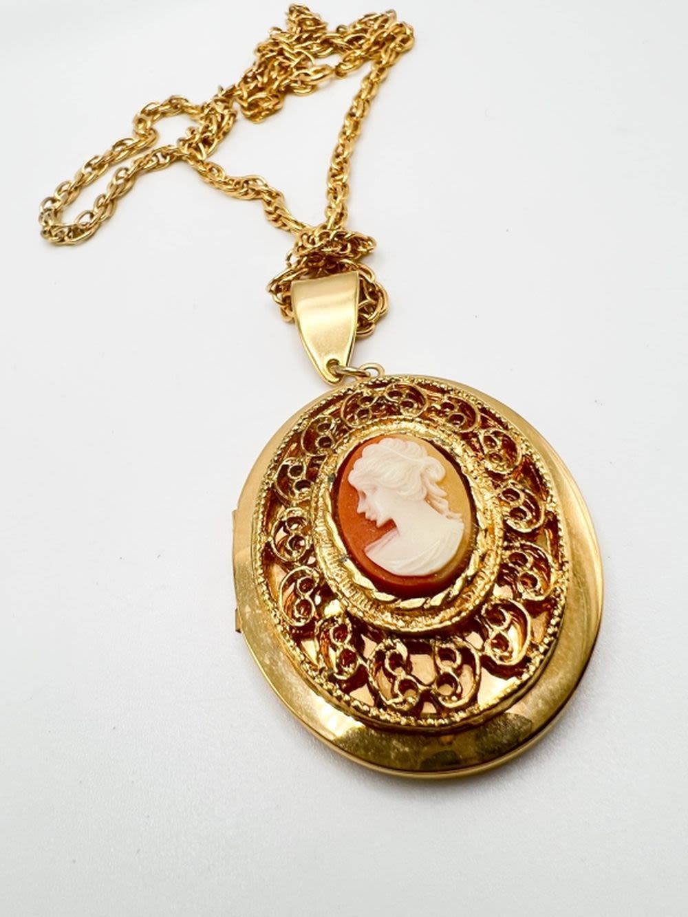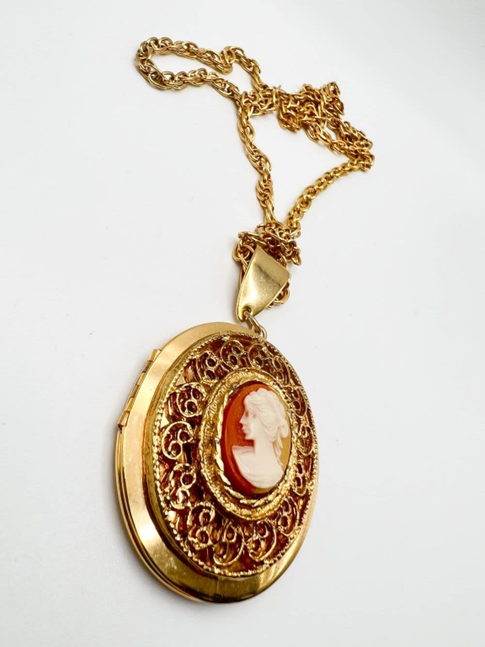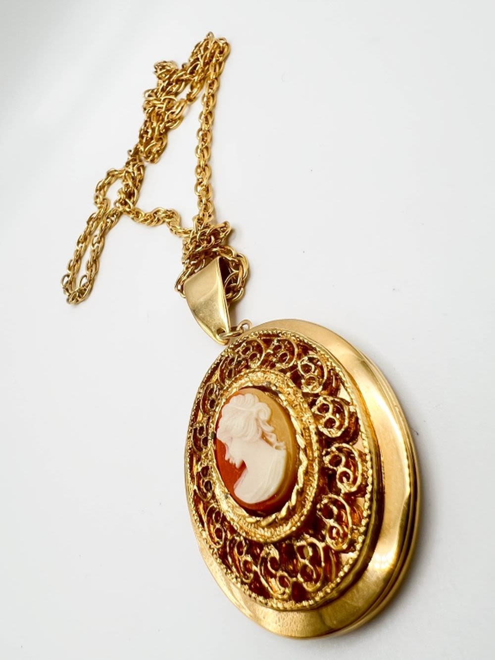 HUGE CAMEO NECKLACE, WITH SCROLLWORK TYPE SURROUND ON LONG GOLD TONE CHAIN