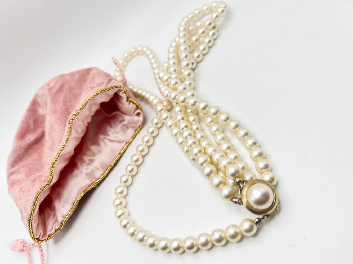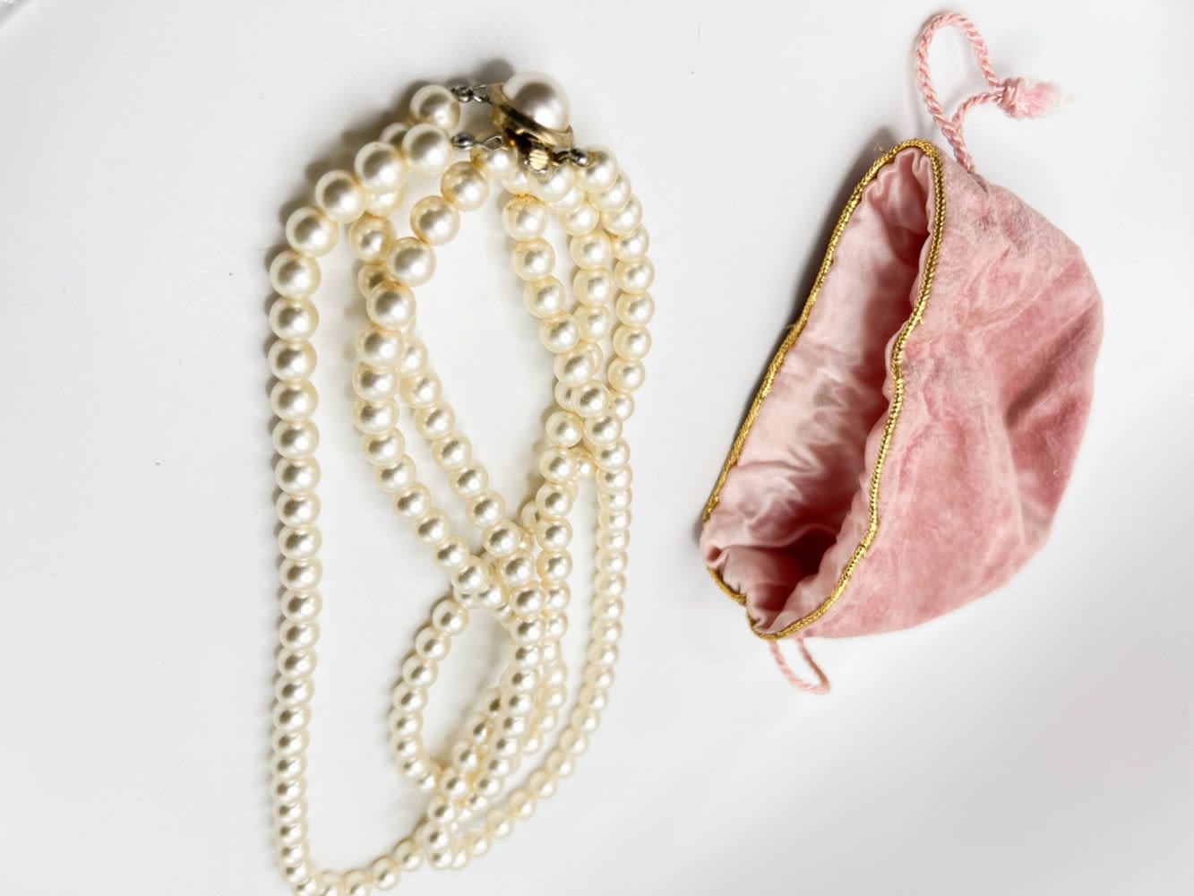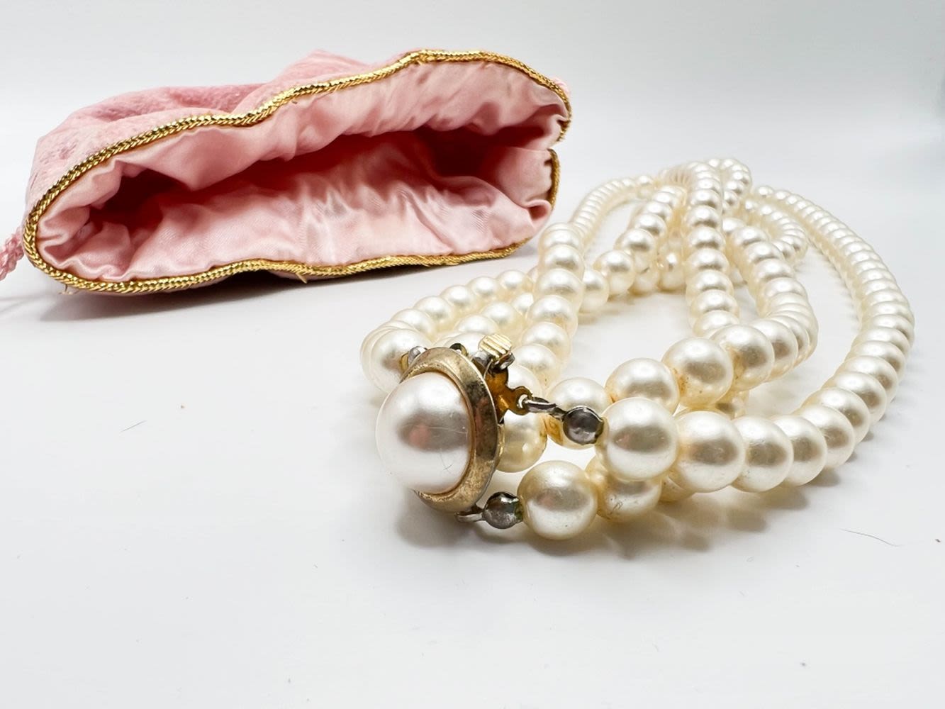 BEAUTIFUL FAUX PEARLS NECKLACE WITH LOVELY CLASP AND VELVET DRAWSTRING BAG, VINTAGE ITEMS