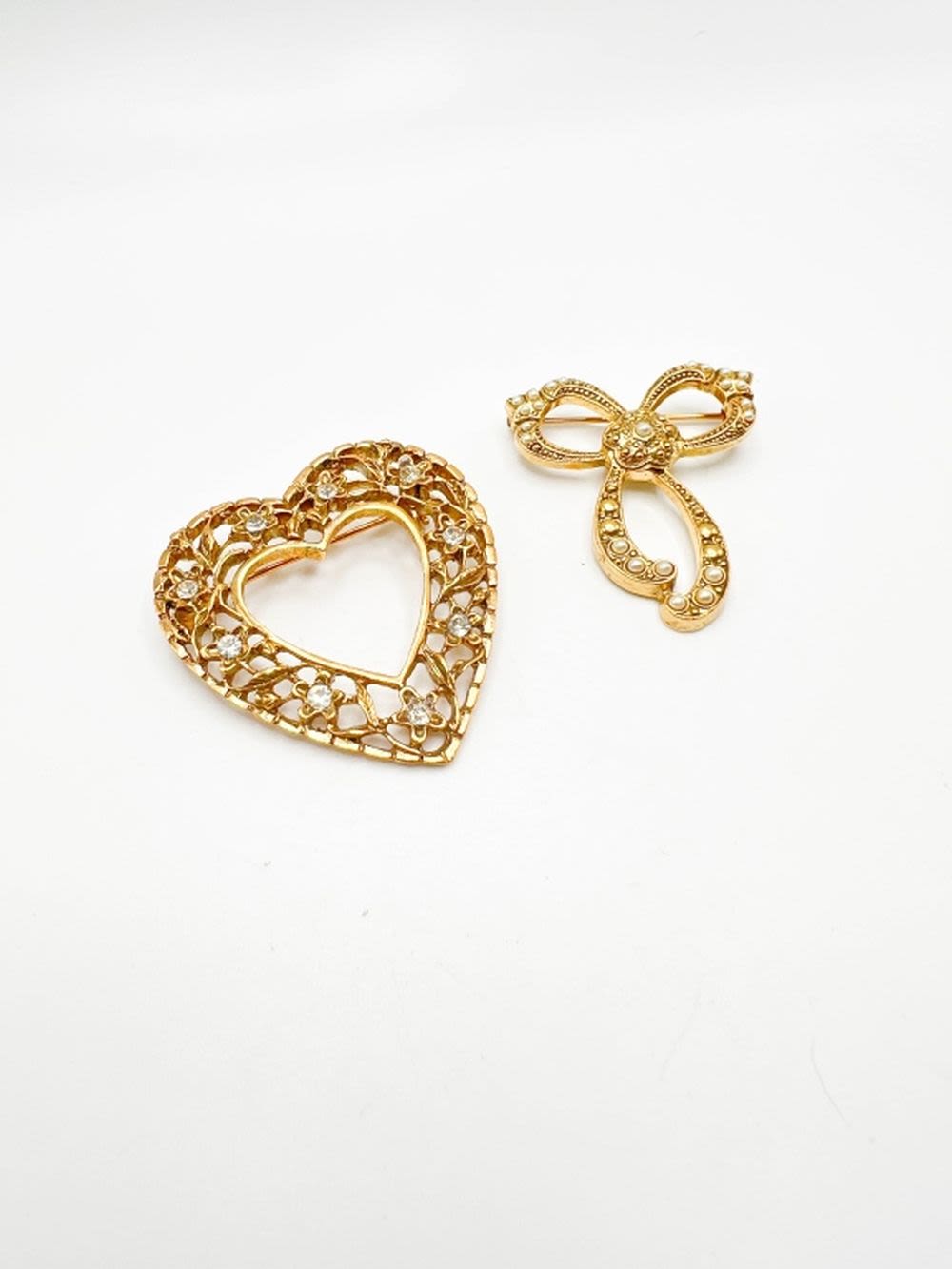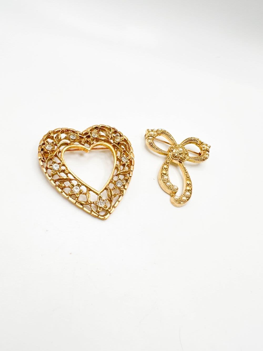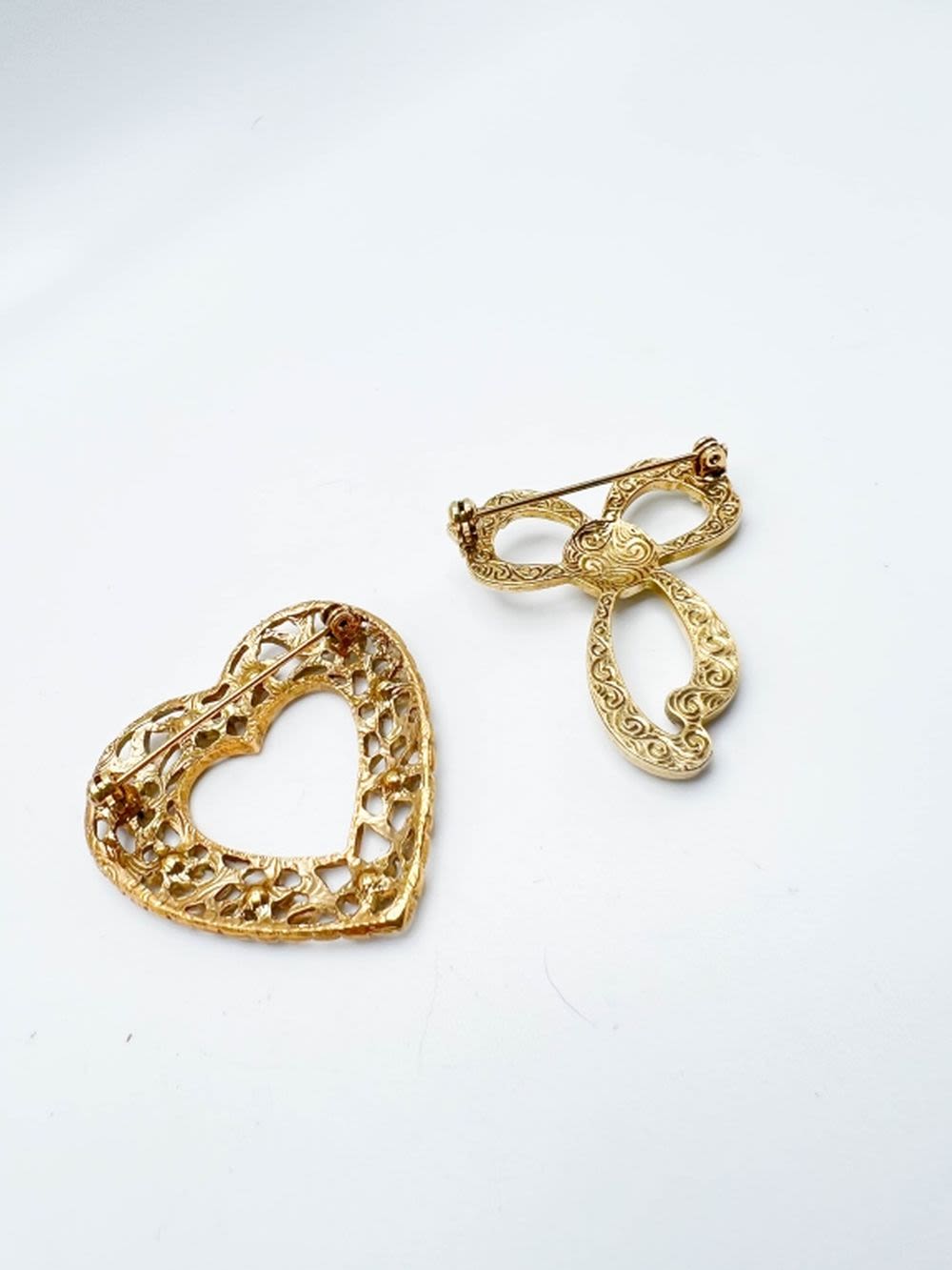 DELICATE BROOCHES HEART AND BOW IN GOLD TONE
