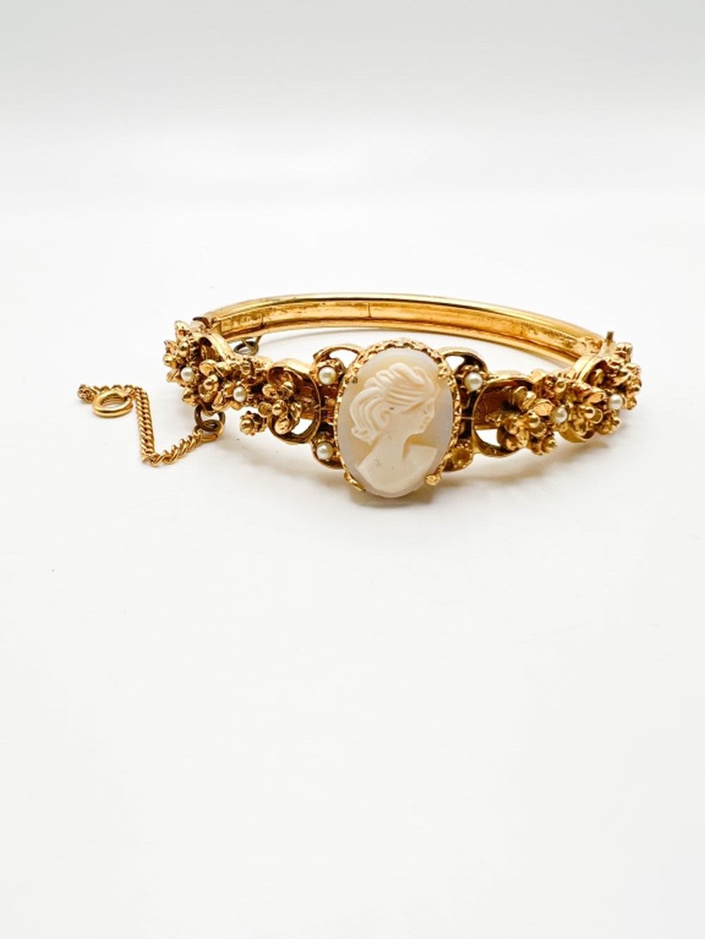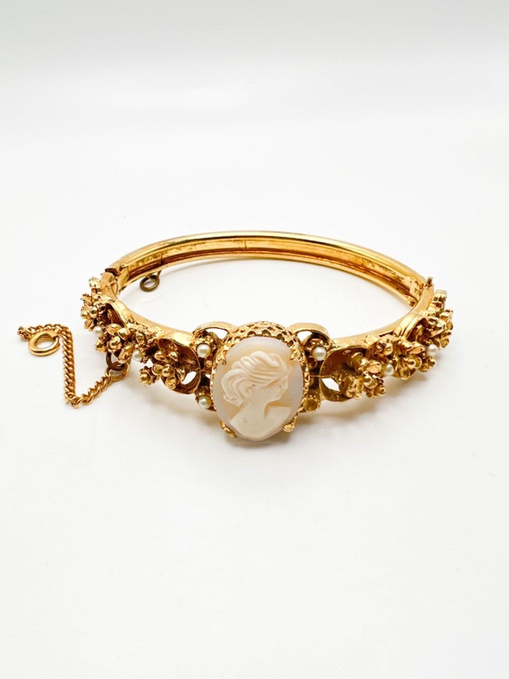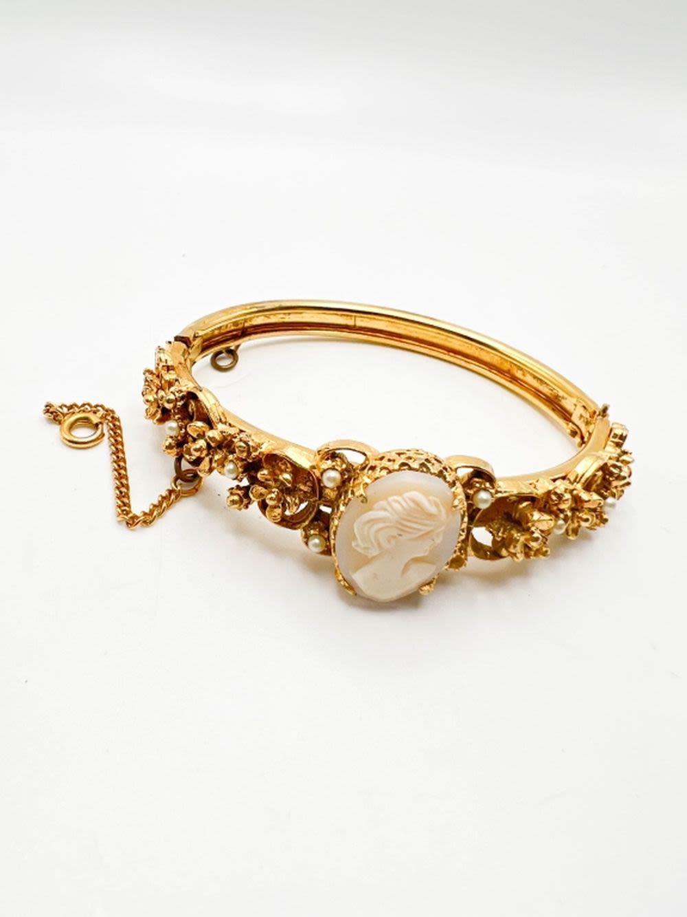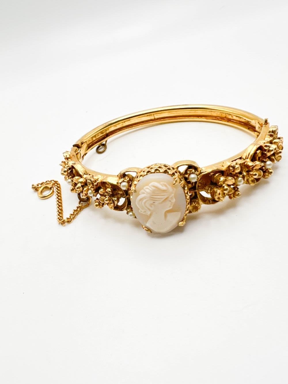 FLORENZA SIGNED BRACELET IN GOLD TONE WITH STUNNING WHITE AND SOFT GRAY CAMEO WITH HEAVY DETAIL