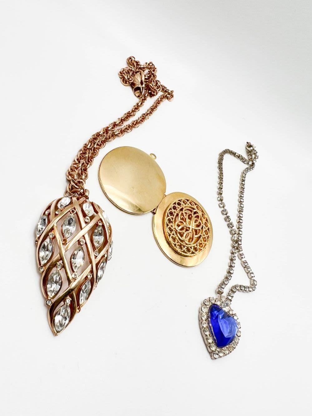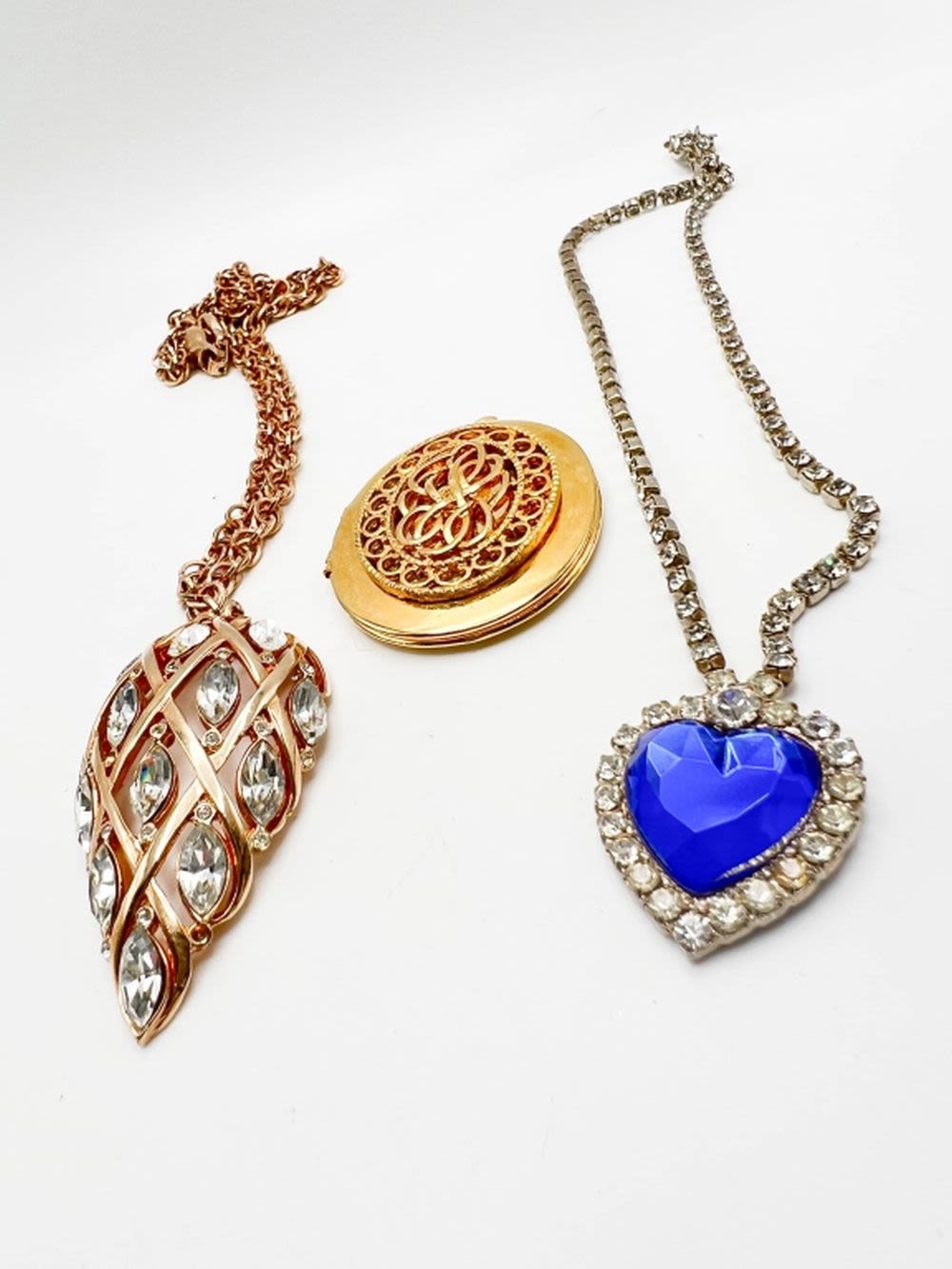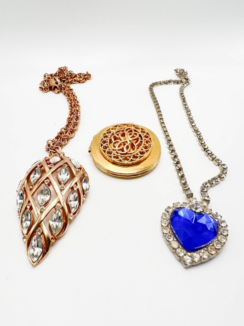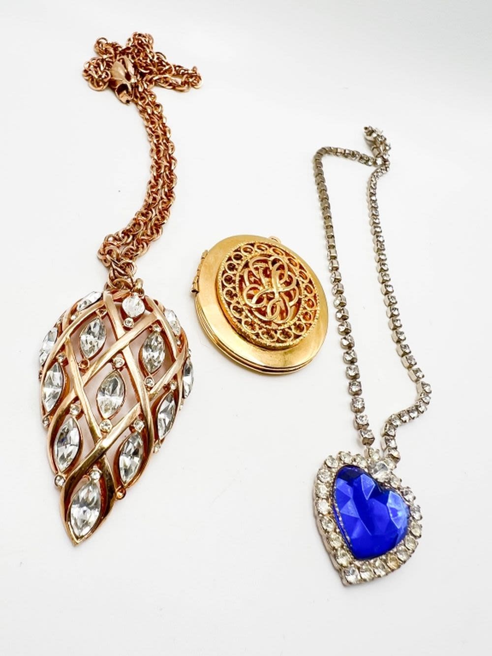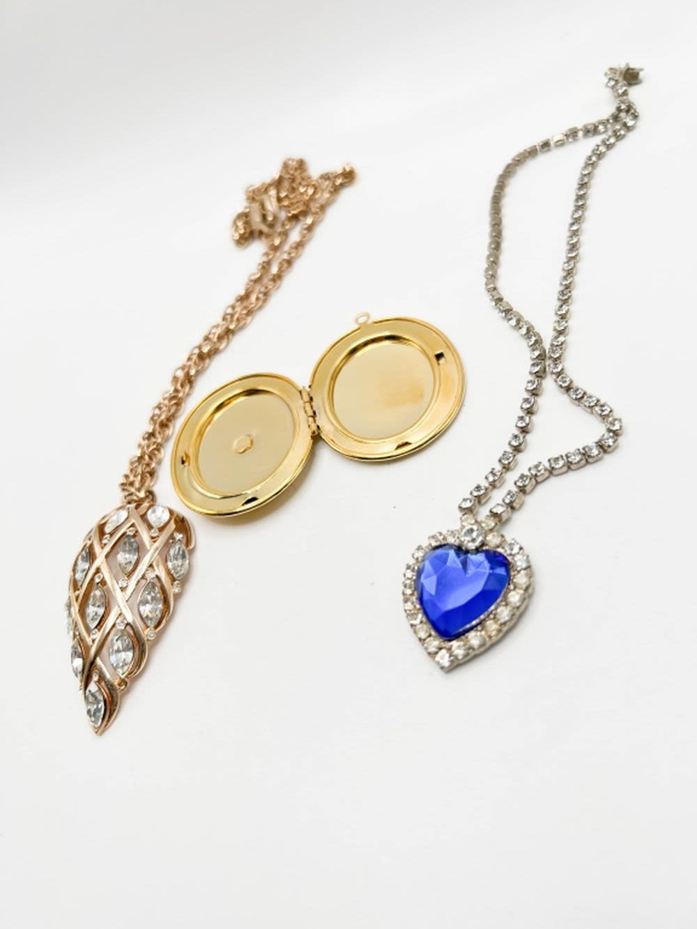 FABULOUS NECKLACES , WHITE STONES INTERTWINED WITH GOLD TONE , CIRCLE LOCKET, BLUE STONE SURROUNED BY WHITE STONE NECKLACE IN SILVERTONES