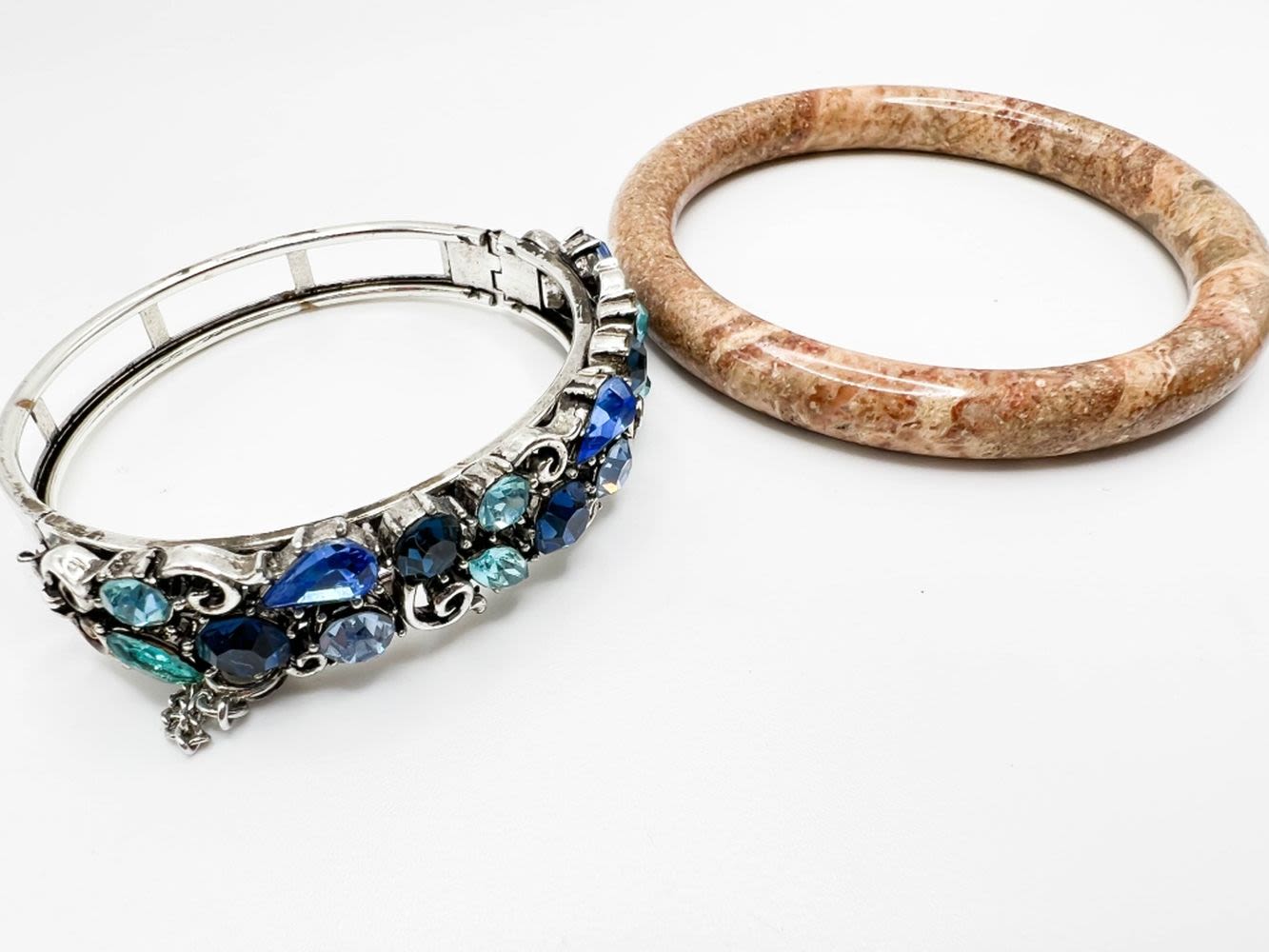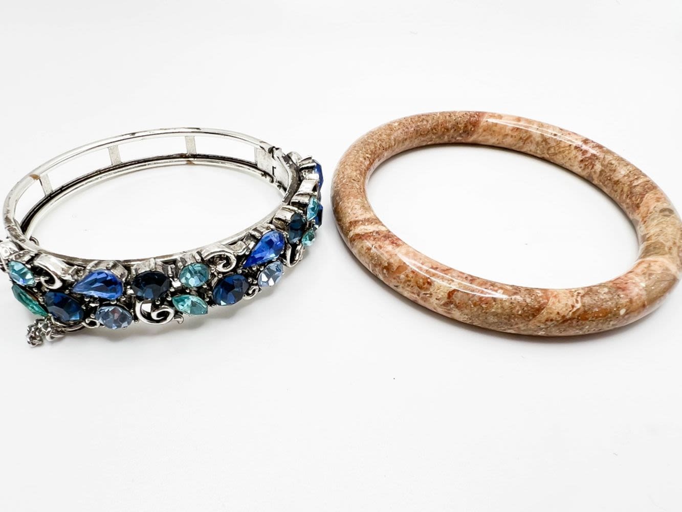 SILVERTONE BRACELET WITH BLUE STONES, HEAVY TAN STONE BRACELET