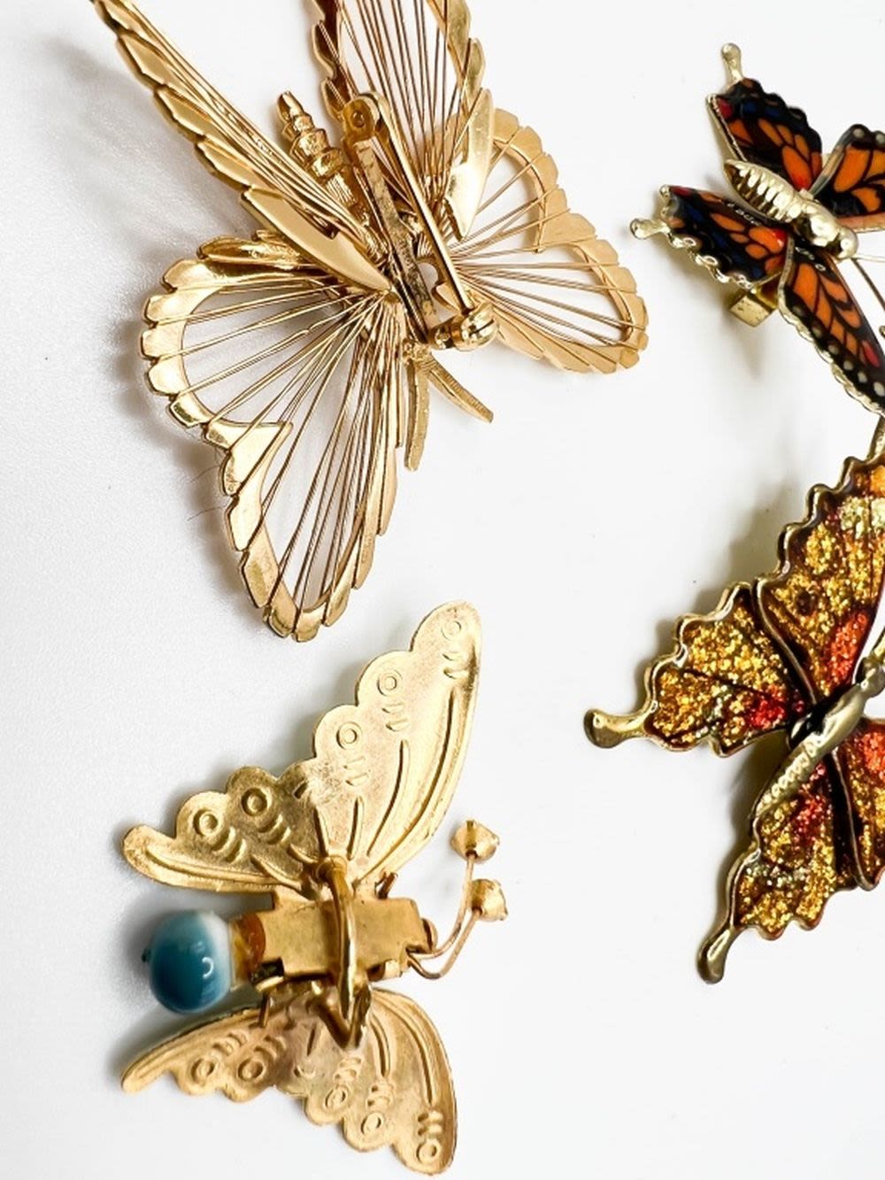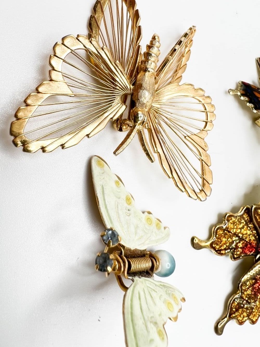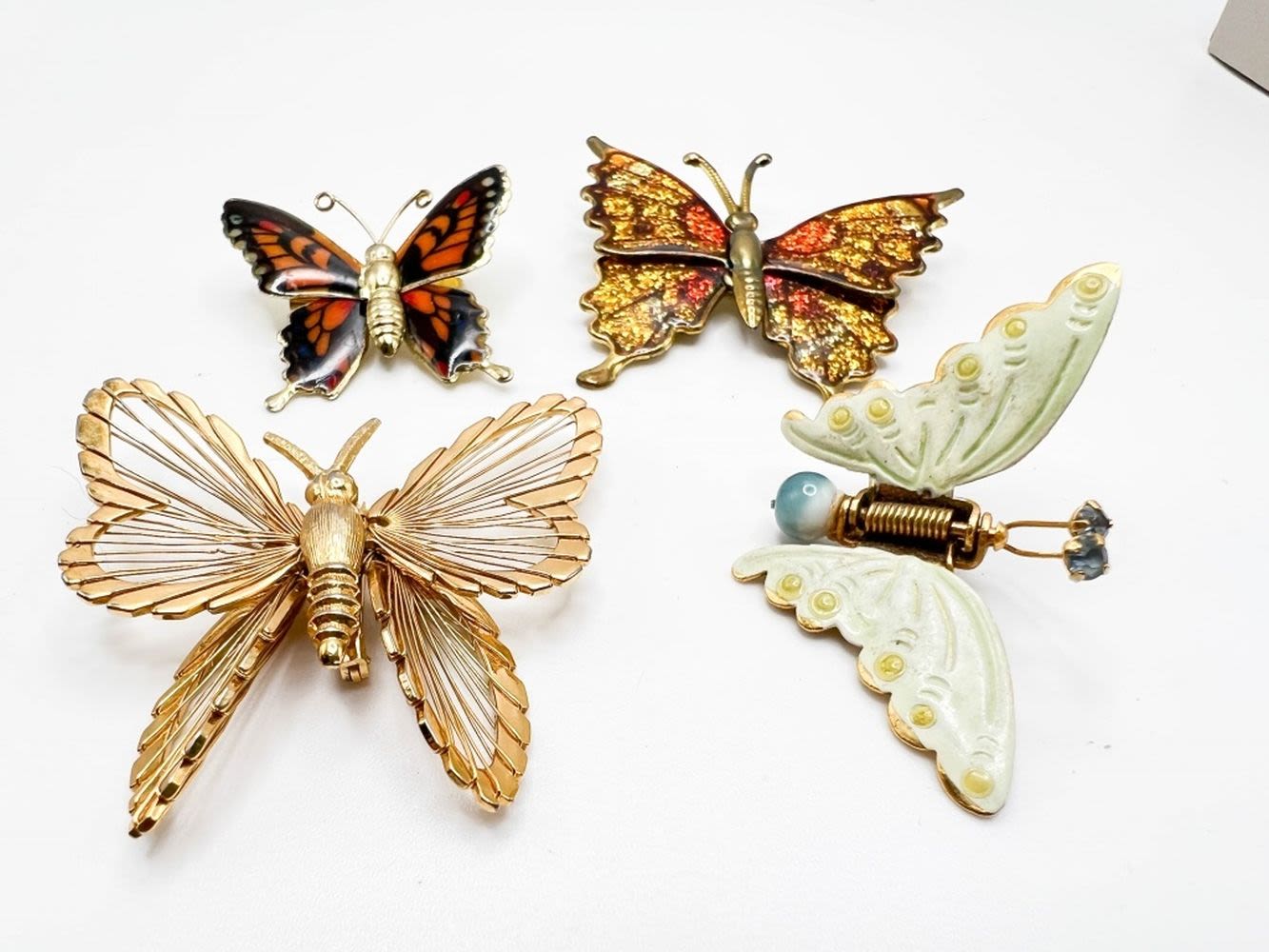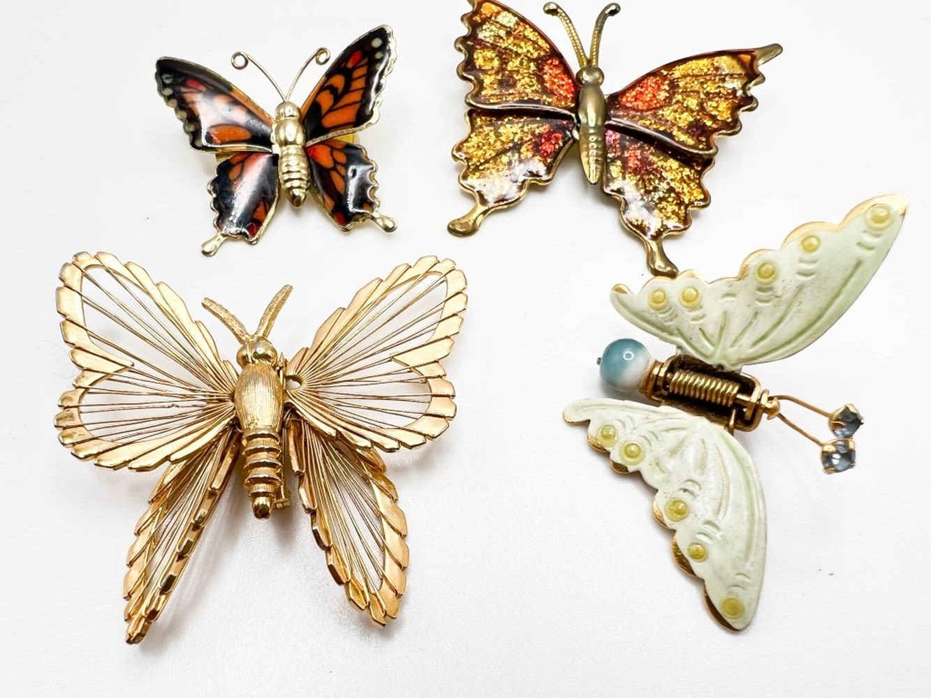 BUTTERFLYS FLUTTER BY ! 1 MONET SIGNED GOLD TONE, 1 PASTEL GREEN SPRING HINGED WINGS WITH BLUE TAIL BALL, TWO COLOR BUTTERFLY