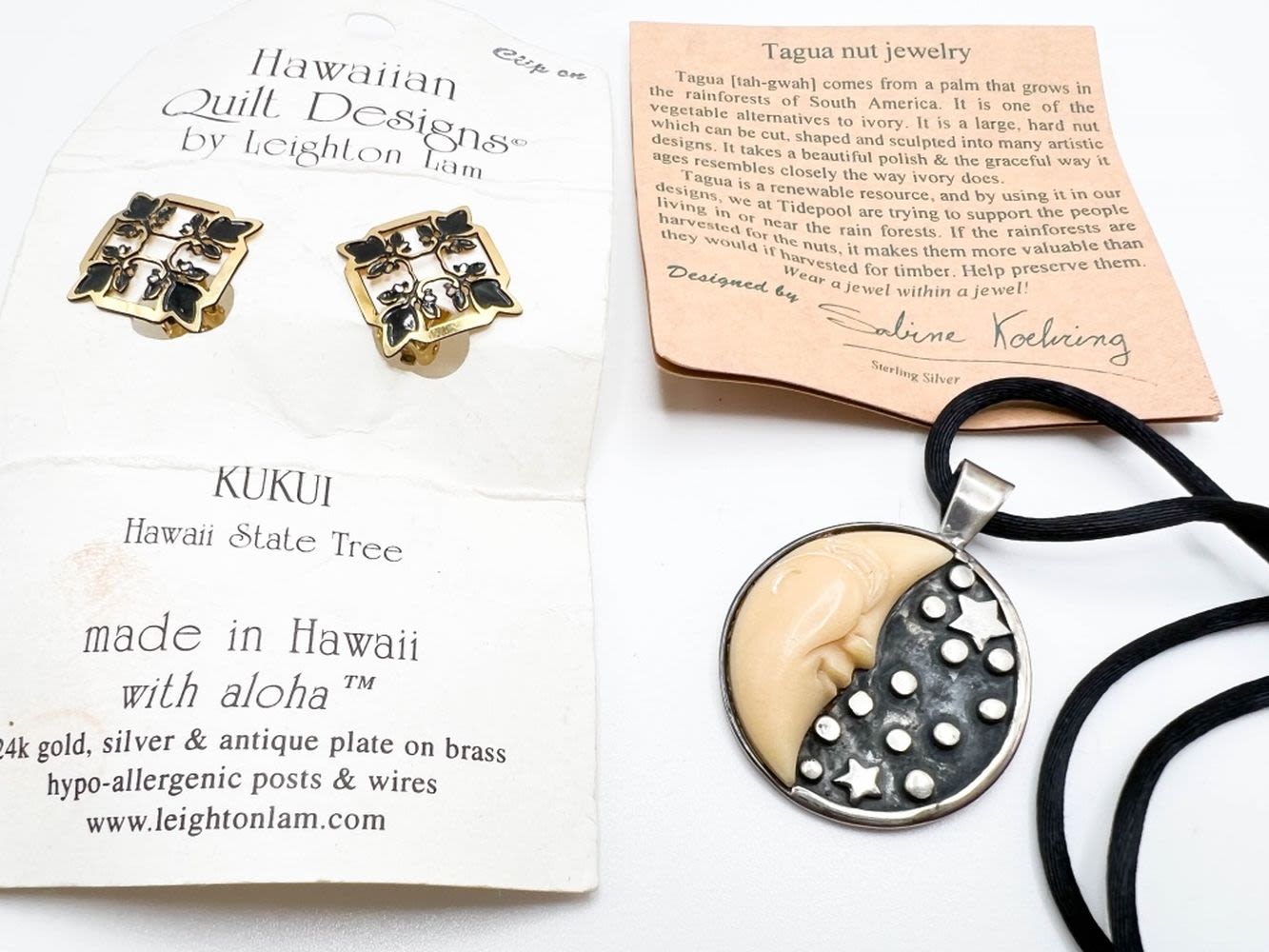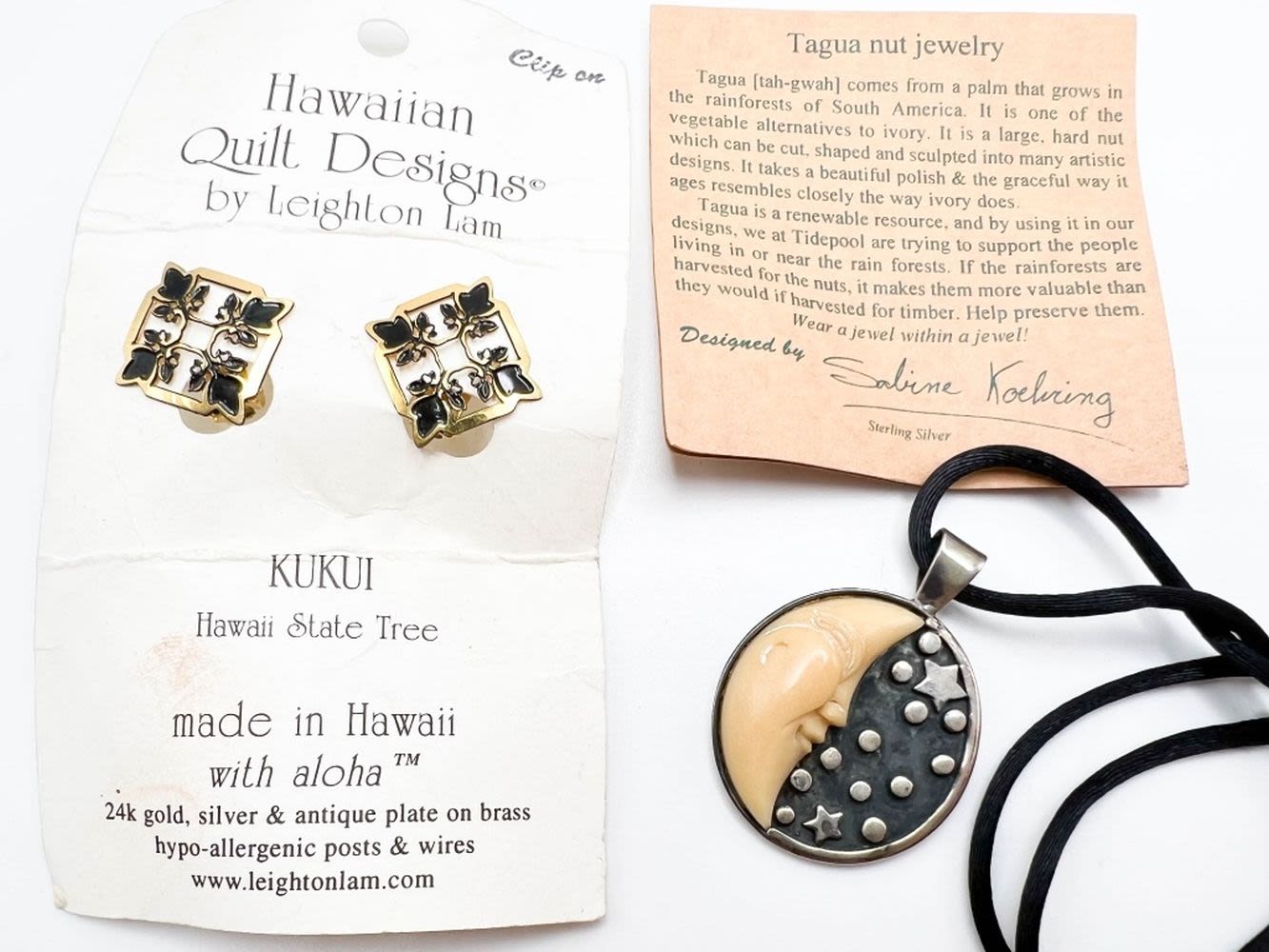HAWAIIAN QUILT DESIGN EARRINGS, TAGUA NUT NECKLACE LOT