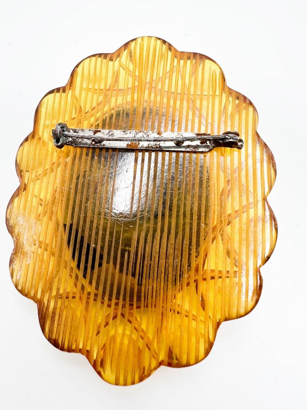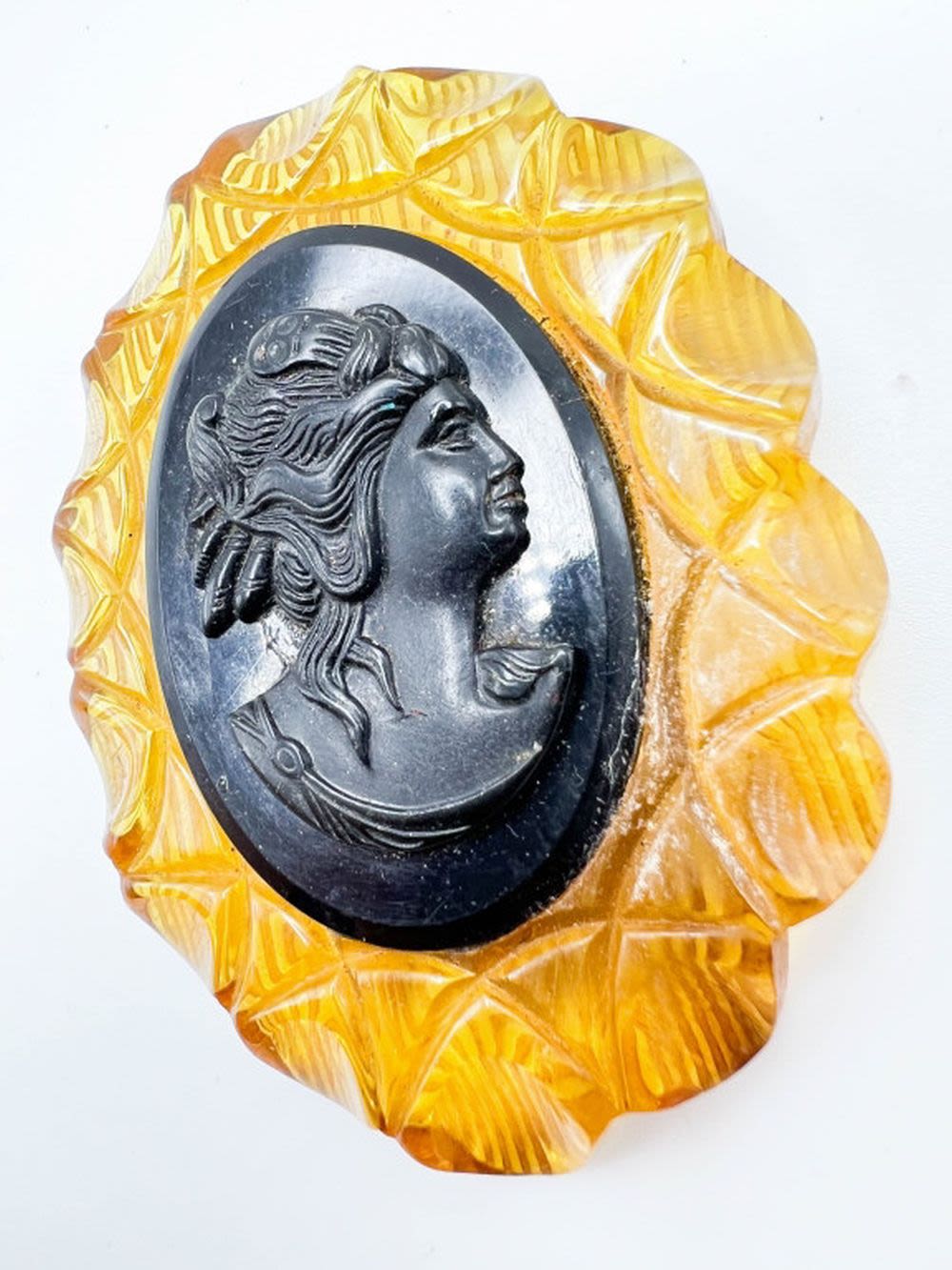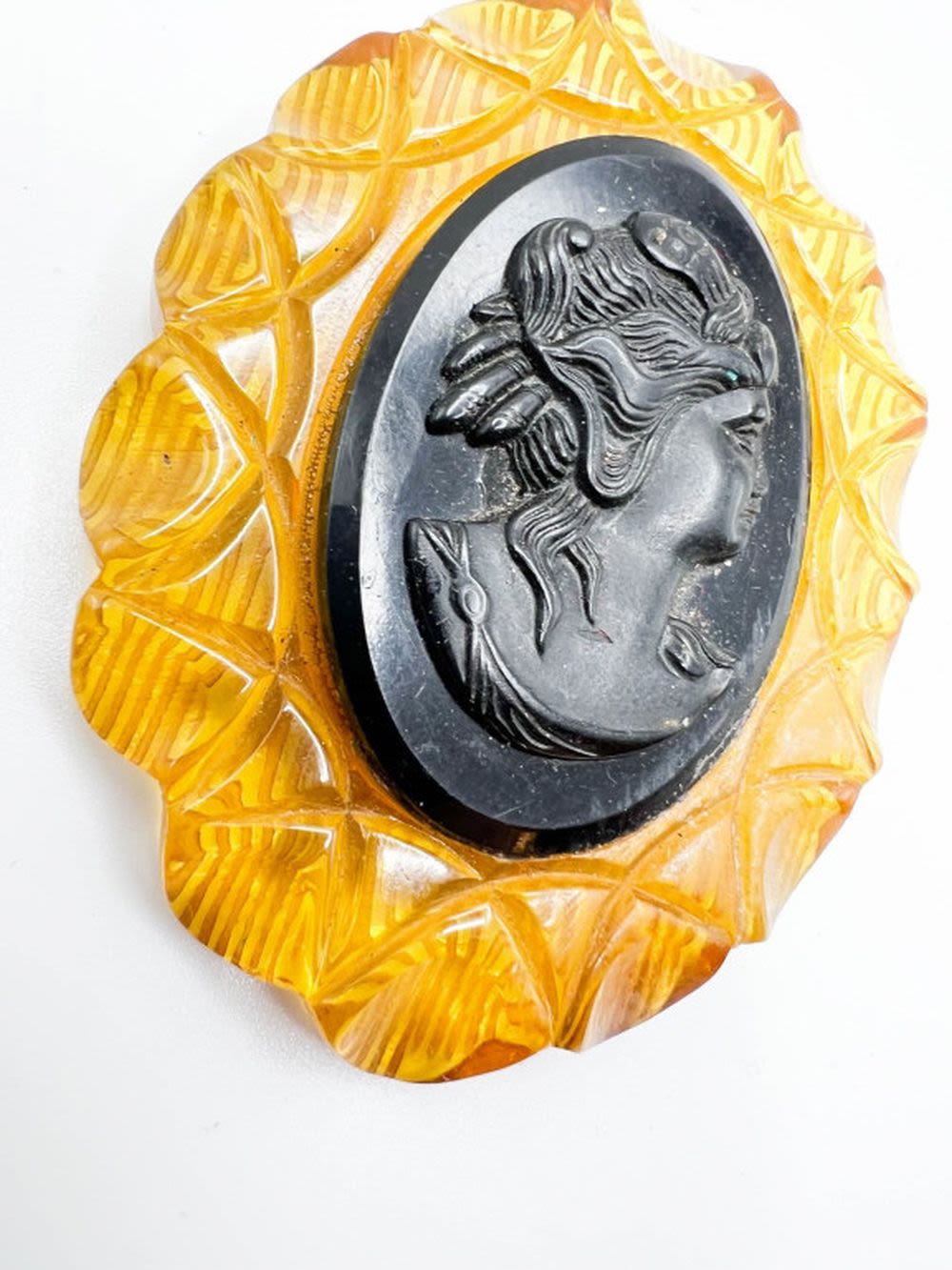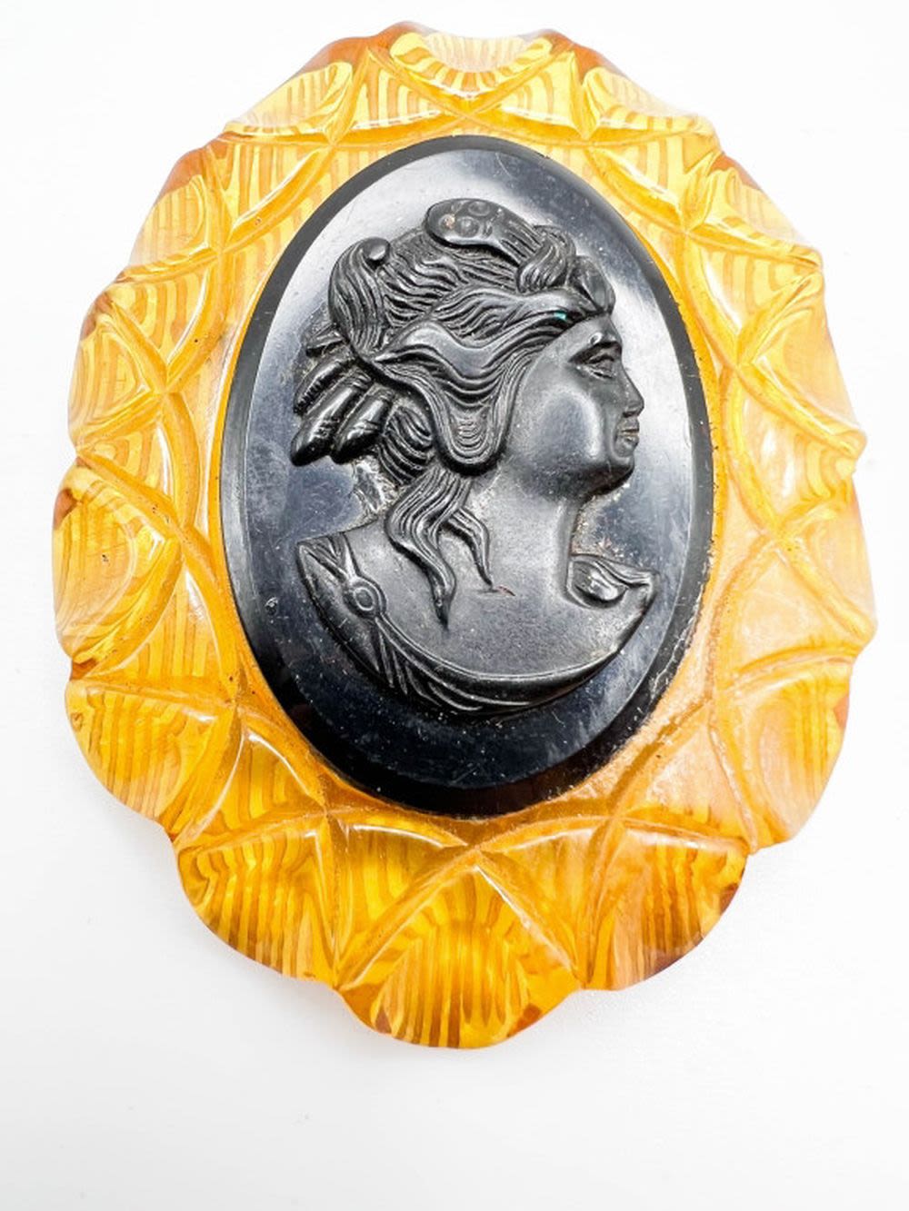 OVERSIZE VINTAGE CAMEO BROOCH IN BLACK AND LIGHT AMBER GOLD COLOR