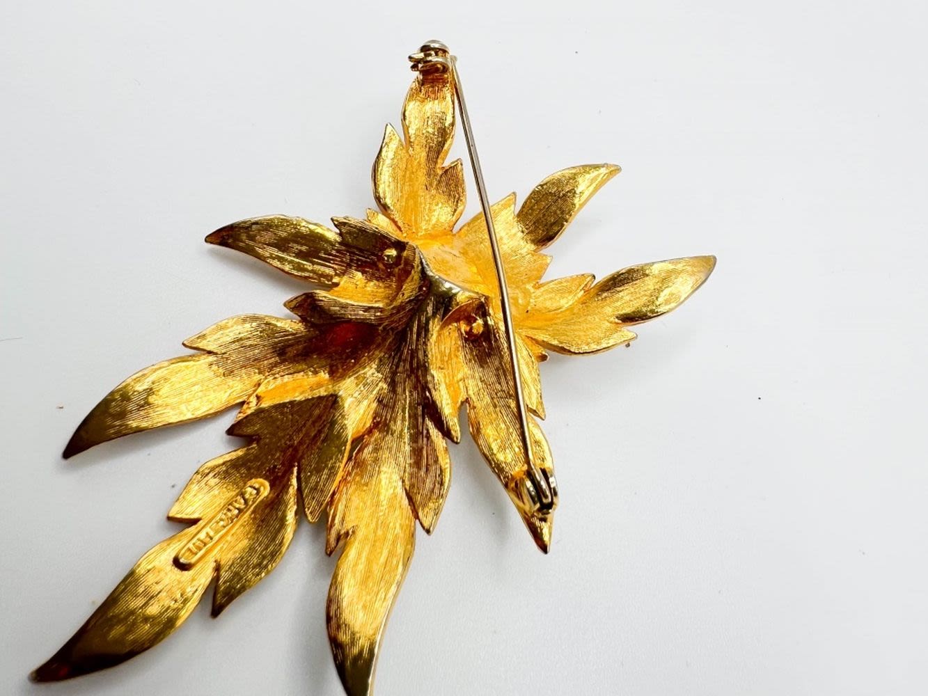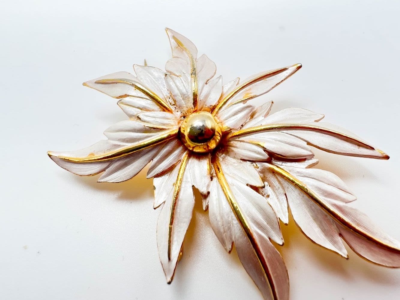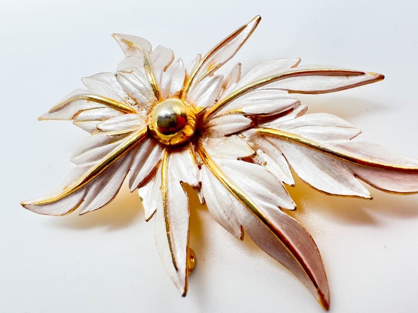 PARK LANE LEAF BROOCH IN PALE CREAM ENAMEL AND GOLD TONES WITH FAUX PEARL CENTER