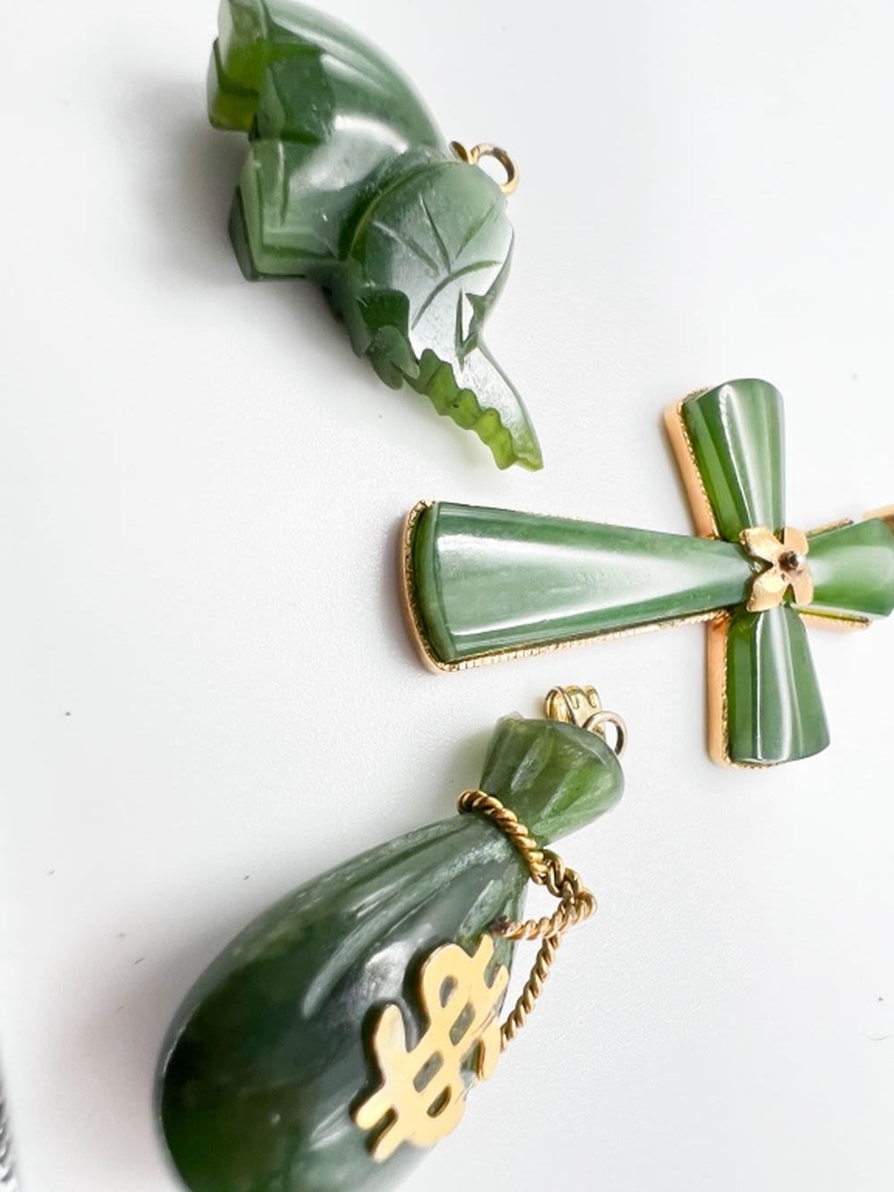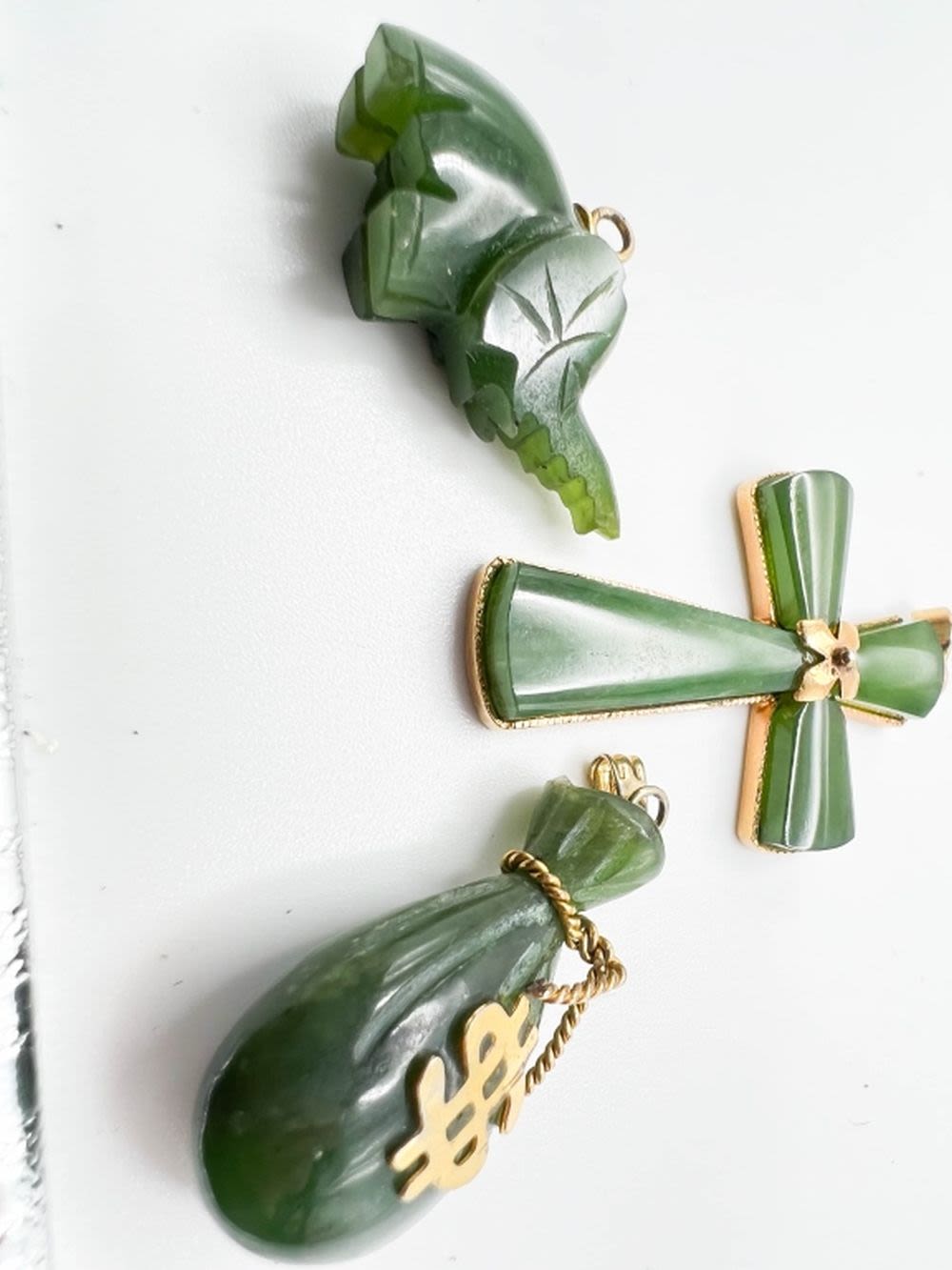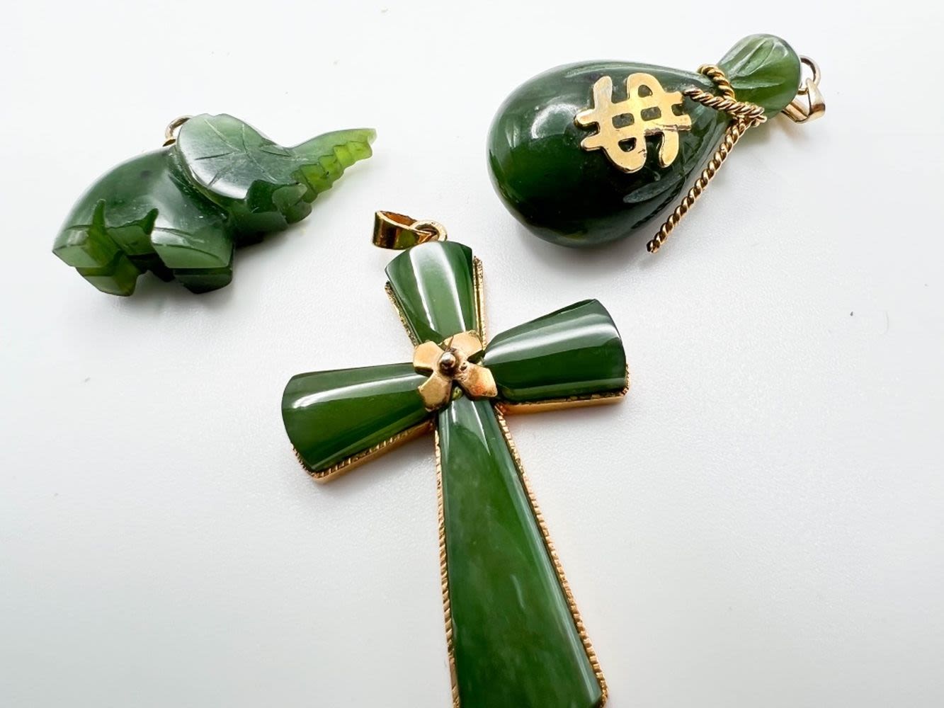 3 GREEN JADE PENDANTS, ELEPHANT, CROSS, MONEY BAGS WITH GOLD TONE TRIMS