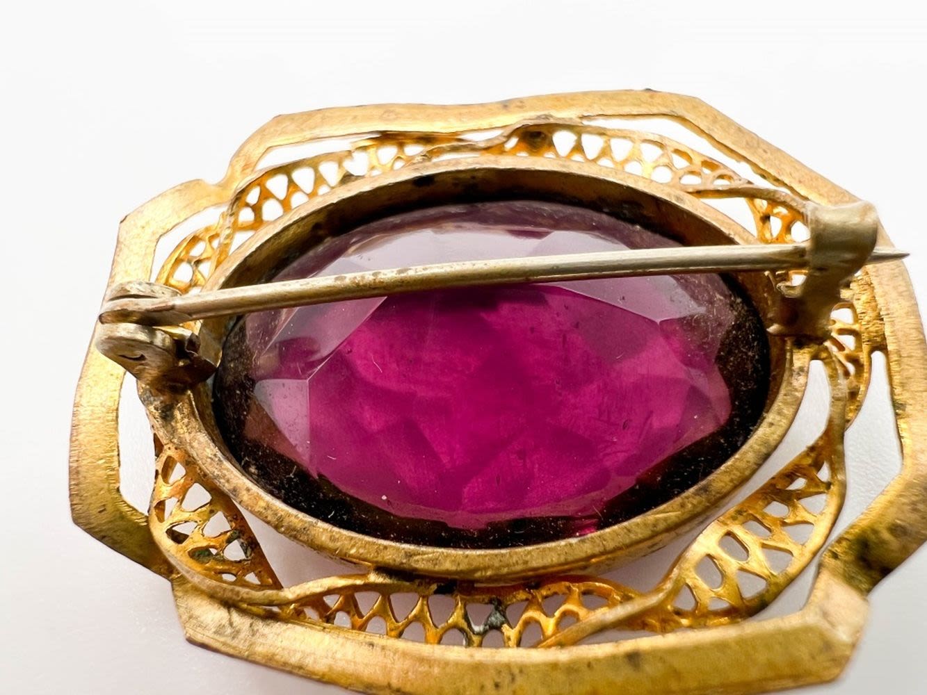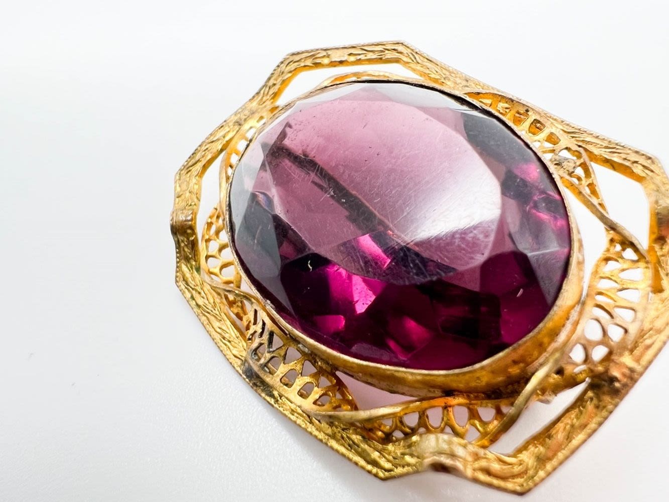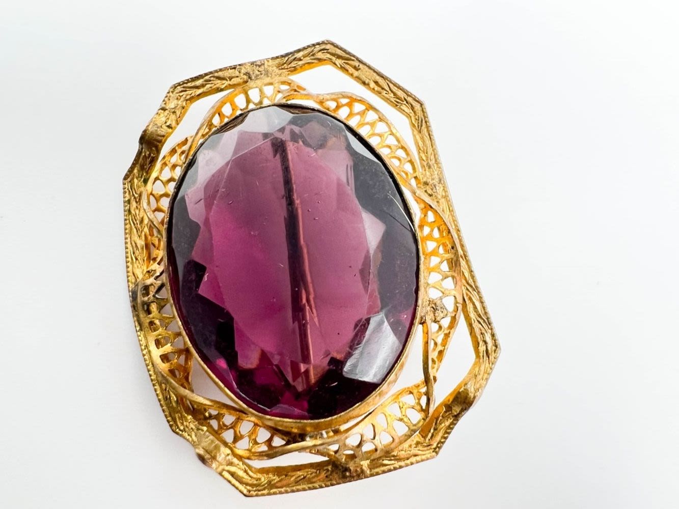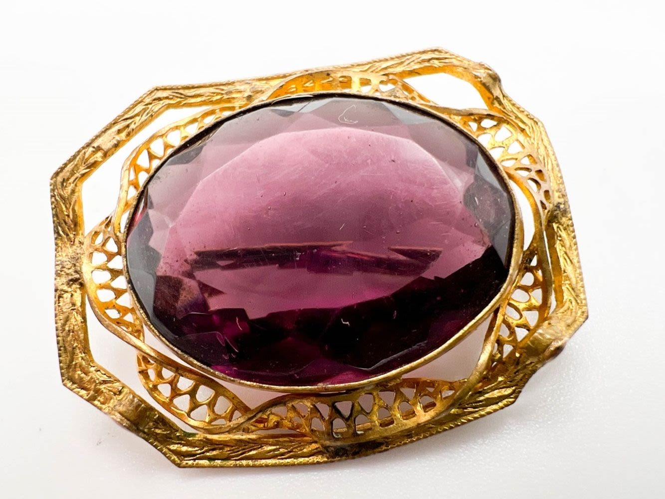 C CLASP FACETED AMETHYST STONE BROOCH WITH SCROLL WORK FRAME , GORGEOUS