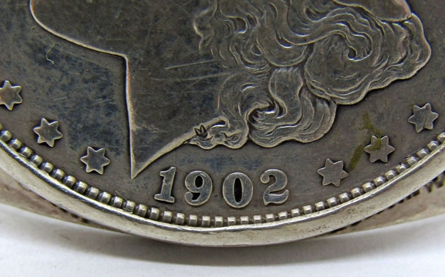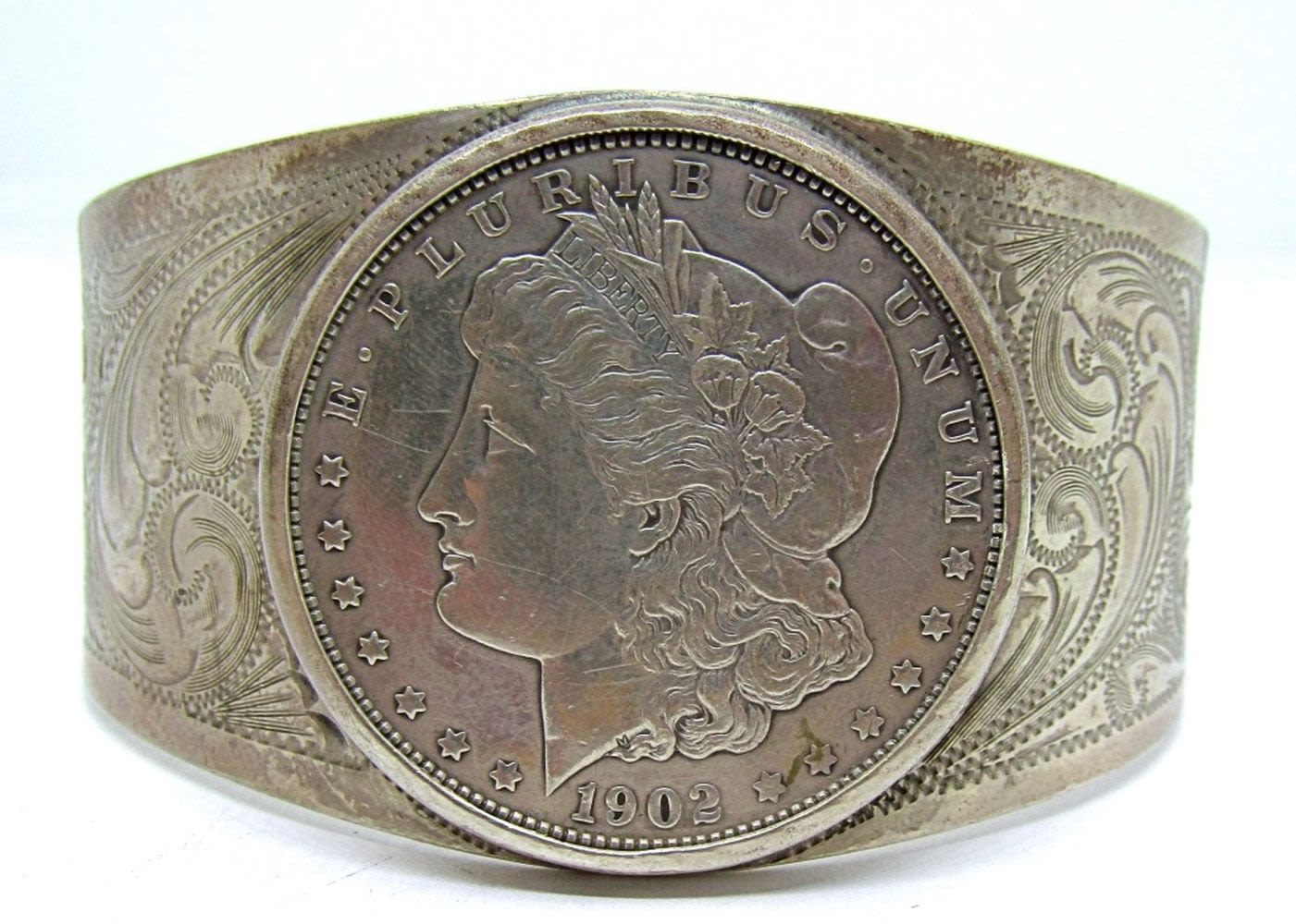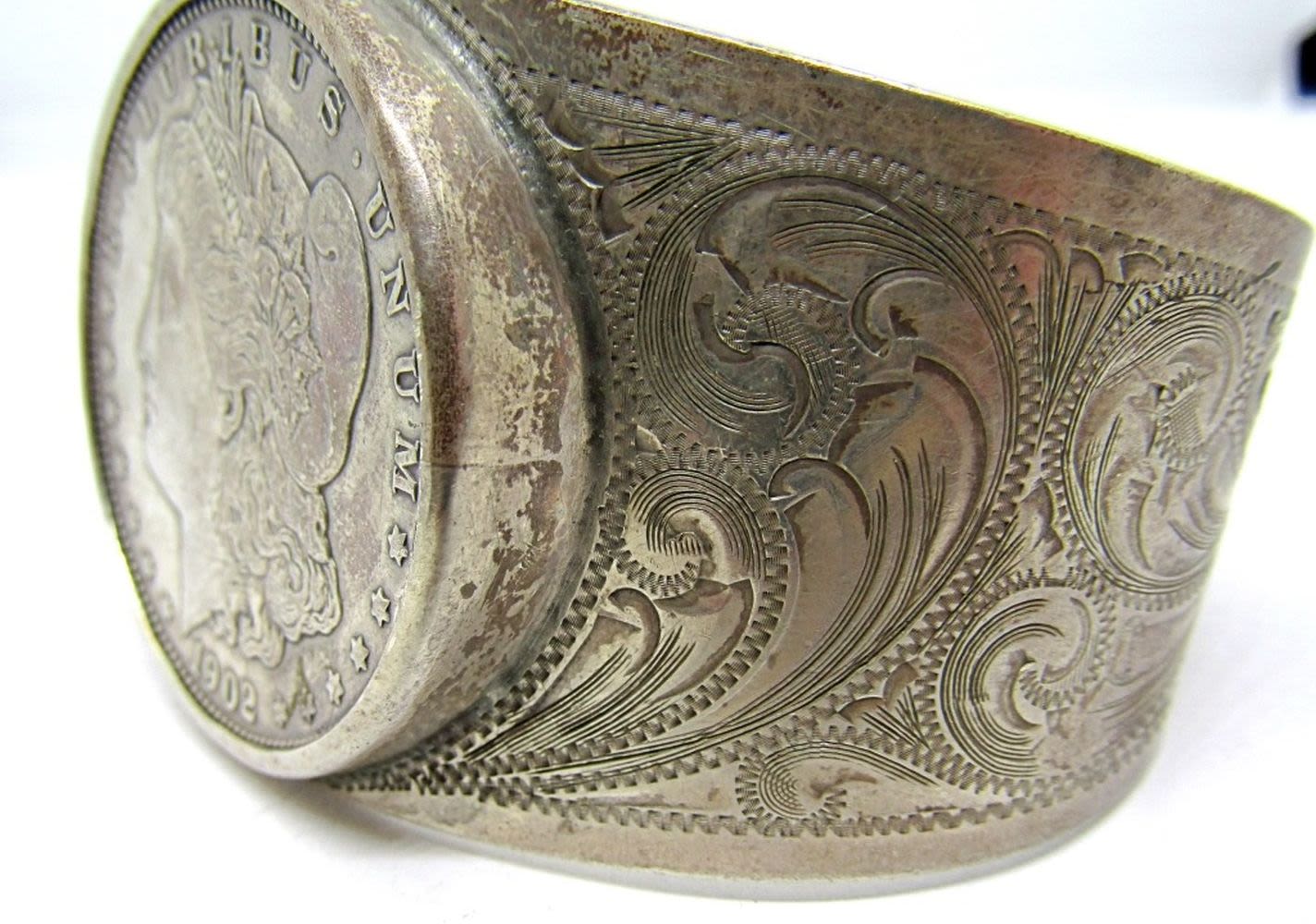1902 MORGAN SILVER DOLLAR in THICK STERLING CUFF BRACELET – STAMPED MORGAN SMITH – 7 1/4″ including GAP ( 50 dwt)