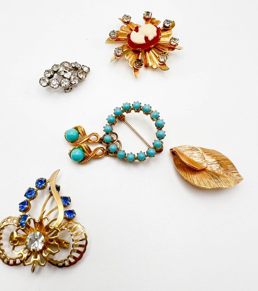 CAMEO, TURQUOISE COLOR STONES, GOLD TONE, SILVER TONE, LEAVES, BLUE RHINESTONE, CLEAR RHINESTONES