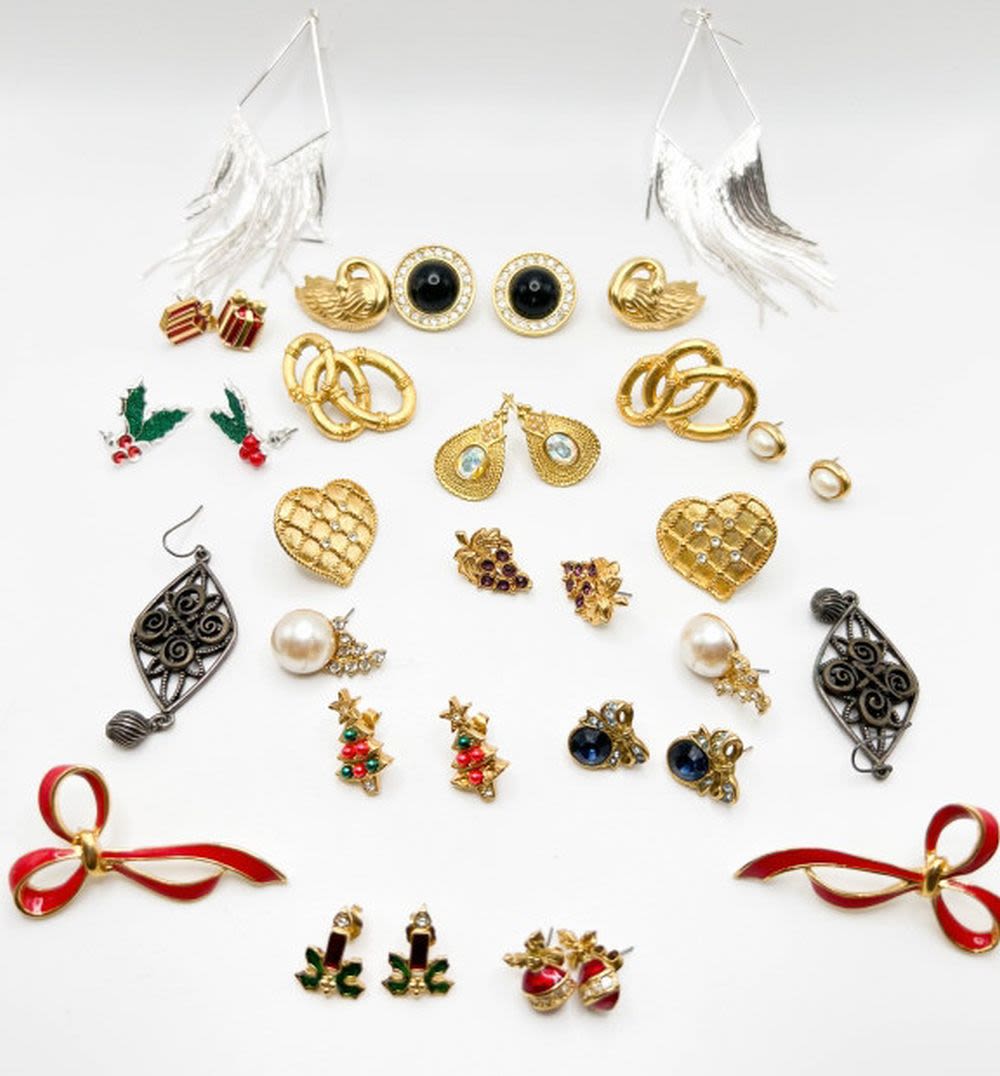 MULTIPLE CHRISTMAS EARRINGS- BOWS, RHINESTONES, BLACK, RED, GOLD TONE, SILVER TONE
