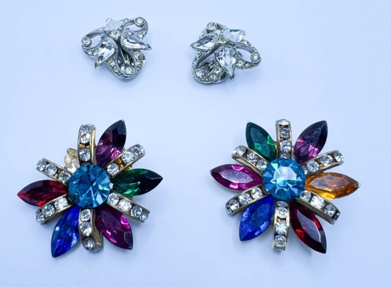 SILVERTONE RHINESTONE EARRINGS , COLORFUL EARRINGS (MISSING PIECE, INCLUDED IN BAG)