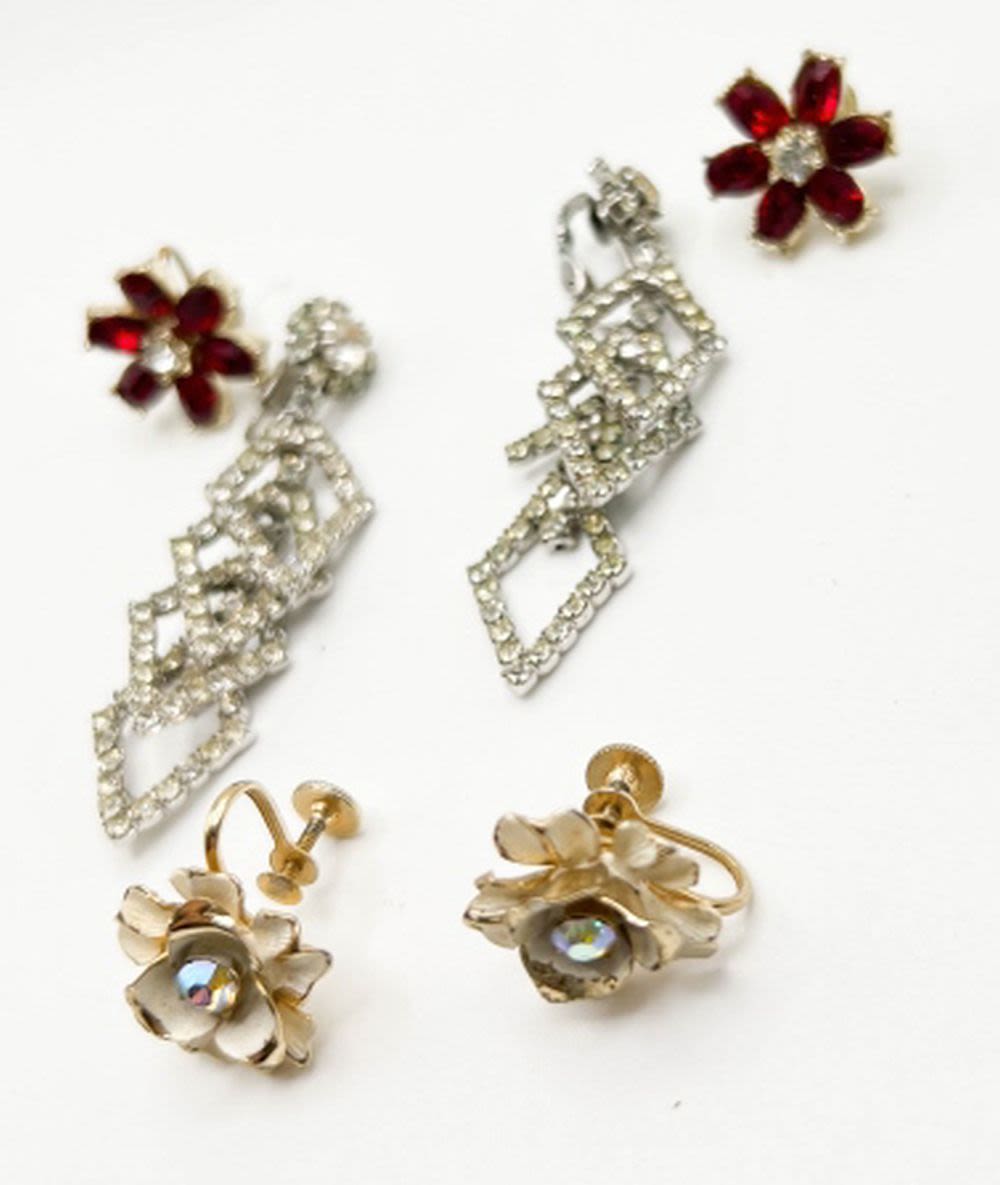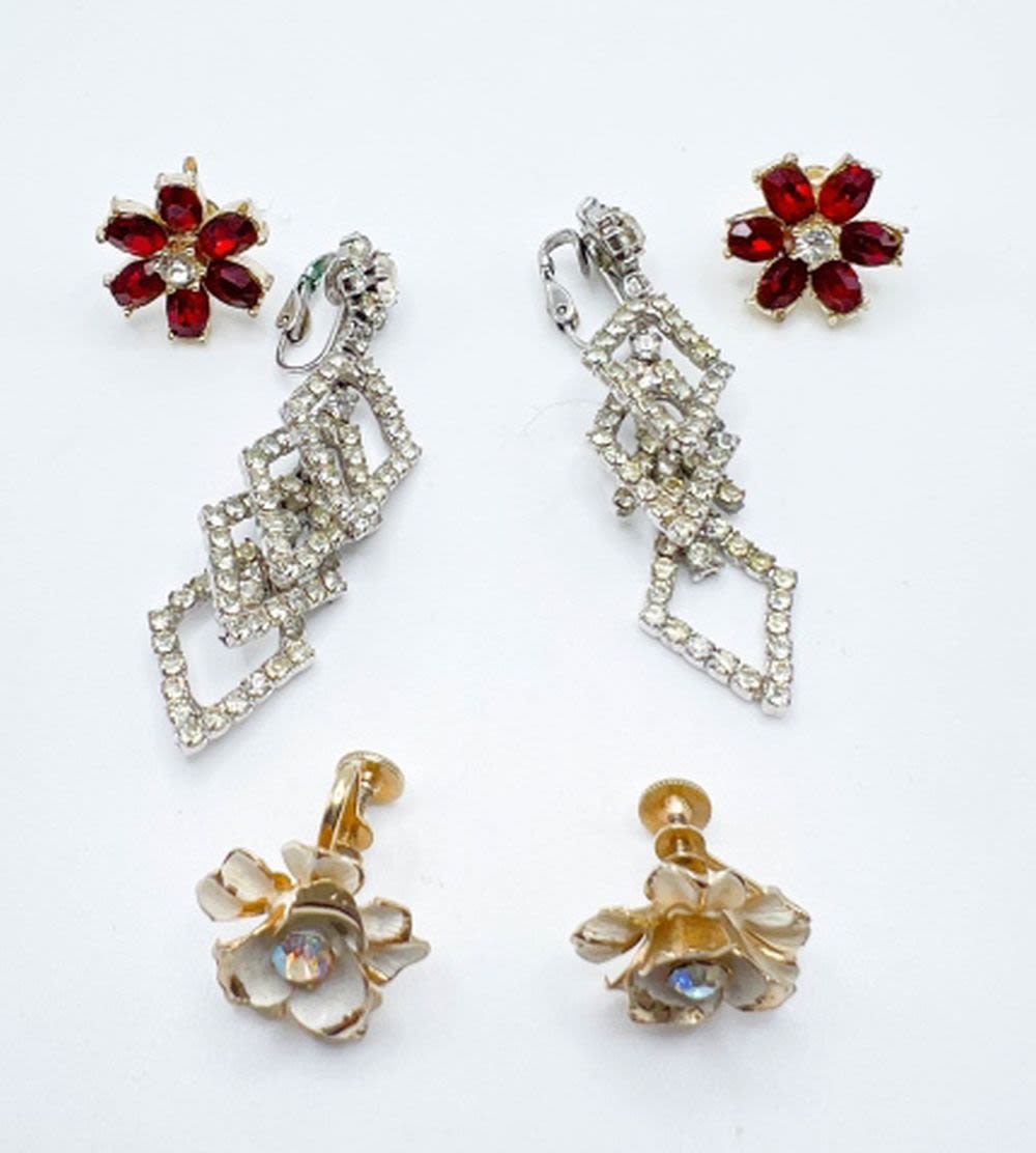 WEISS- LONG DANGLE CLEAR SILVER TONE SET, 2 CORO FLORAL SET EARRINGS, RED