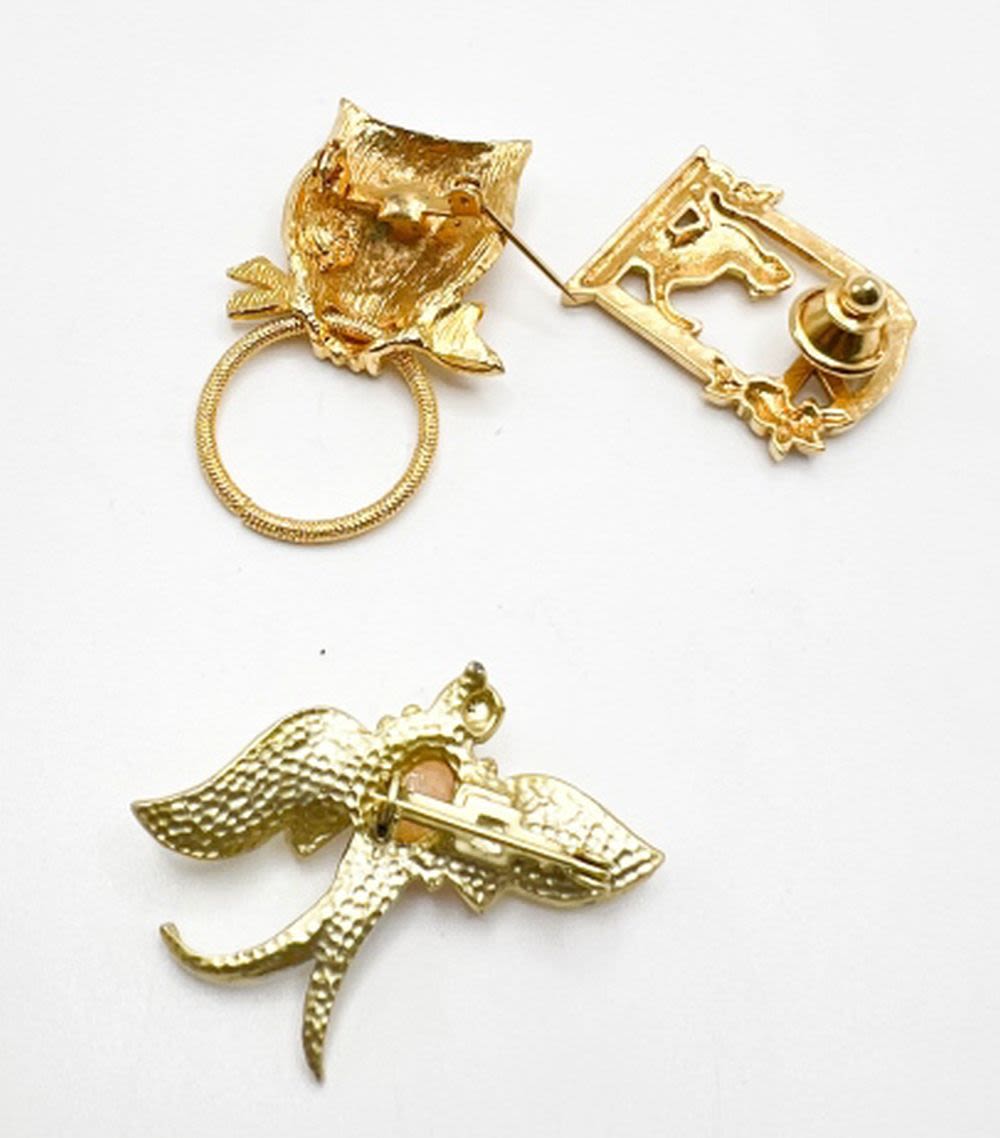CAT AND MOUSE BROOCH, OWL BROOCH WITH RED RHINESTONE EYES, POSSIBLY JELLY BELLY BIRD PINK W GREEN EYES