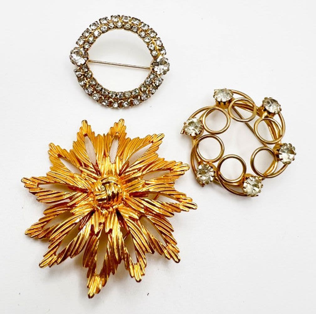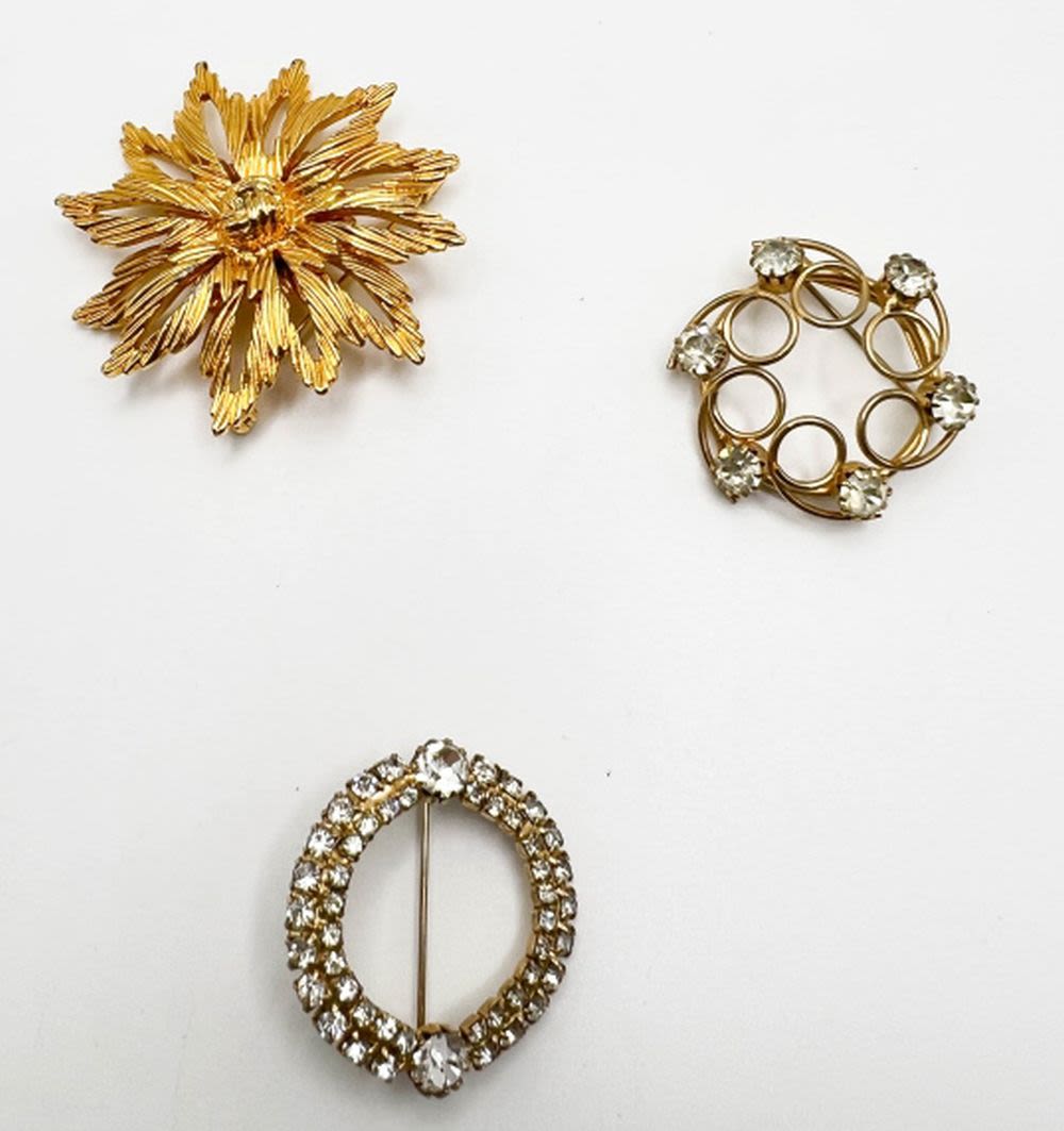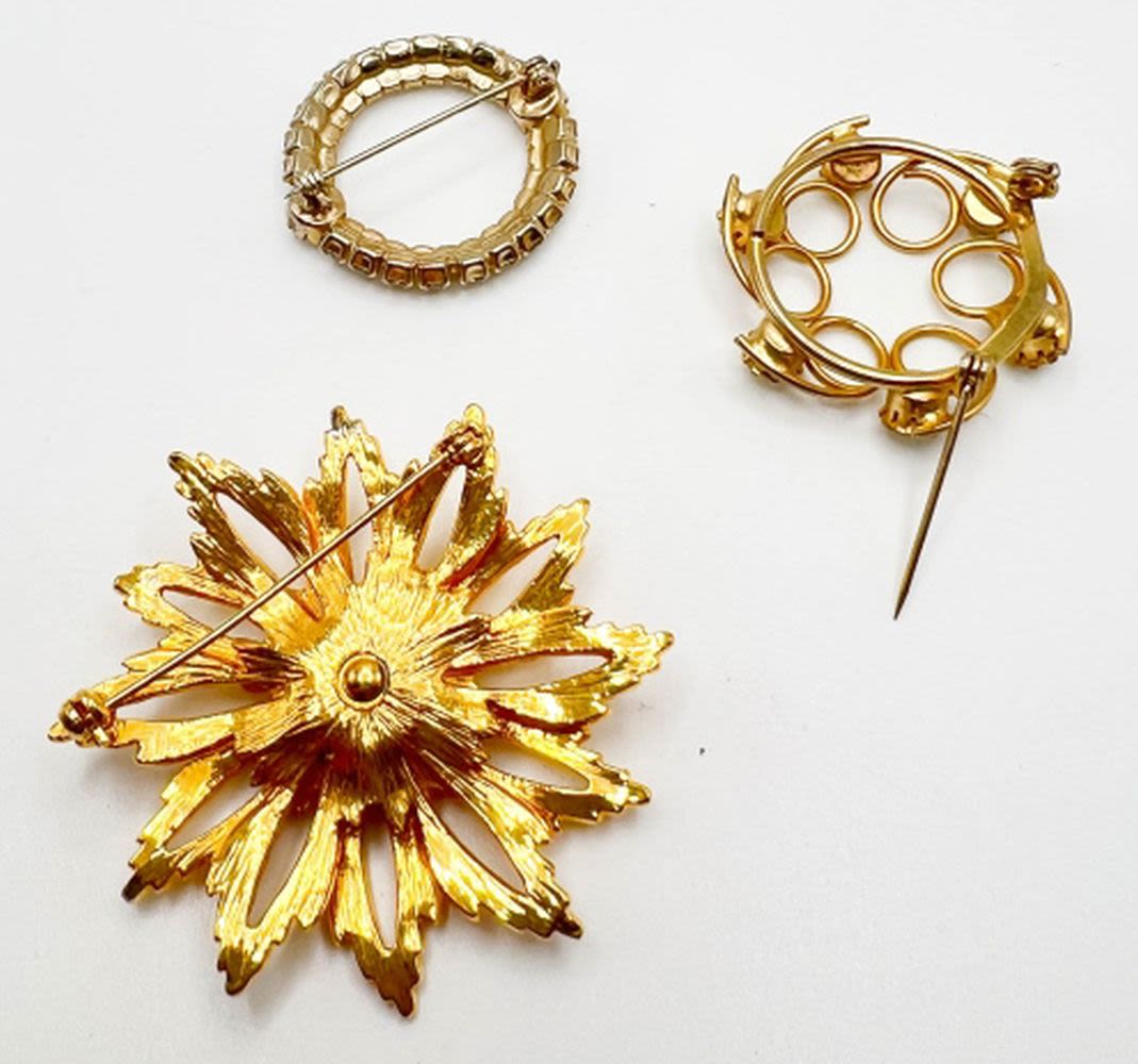1 LARGE GOLD TONE FLOWER, 1 CLEAR RHINESTONE CIRCLE, ONE SWIRL CIRCLE WITH STONES