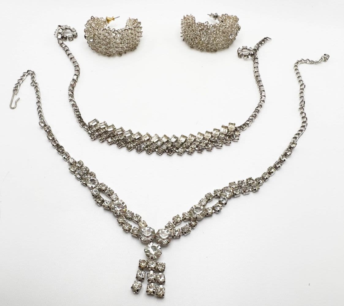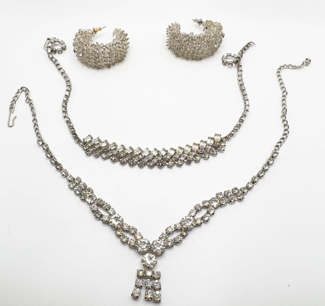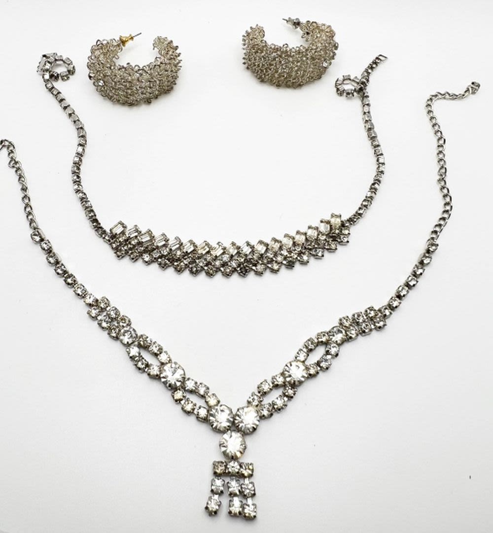 2 NECKLACES, AND WIRE MESH STYLE EARRINGS W. STONES