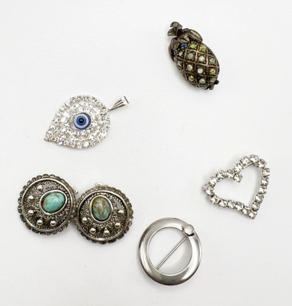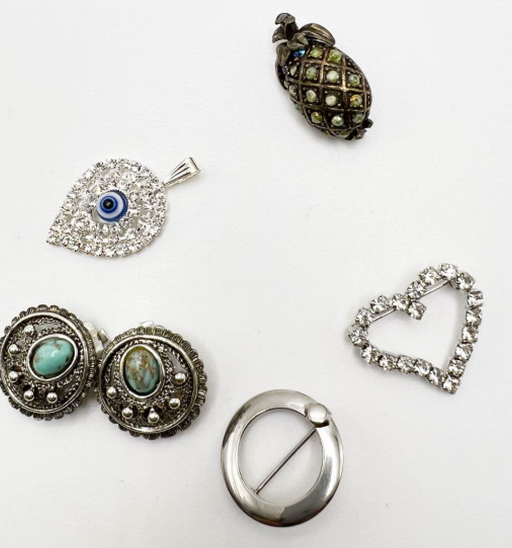 1 PAIR SARAH COVENTRY EARRINGS, 1 HEART BROOCH, PINEAPPLE BROOCH, CIRCLE BROOCH, 1 PENDANT