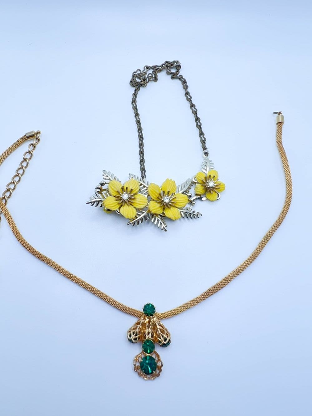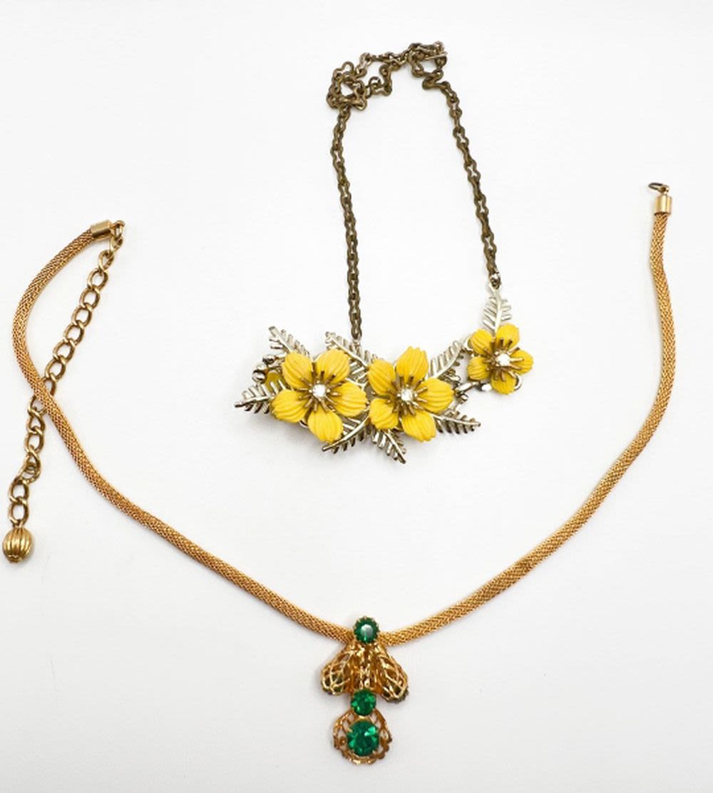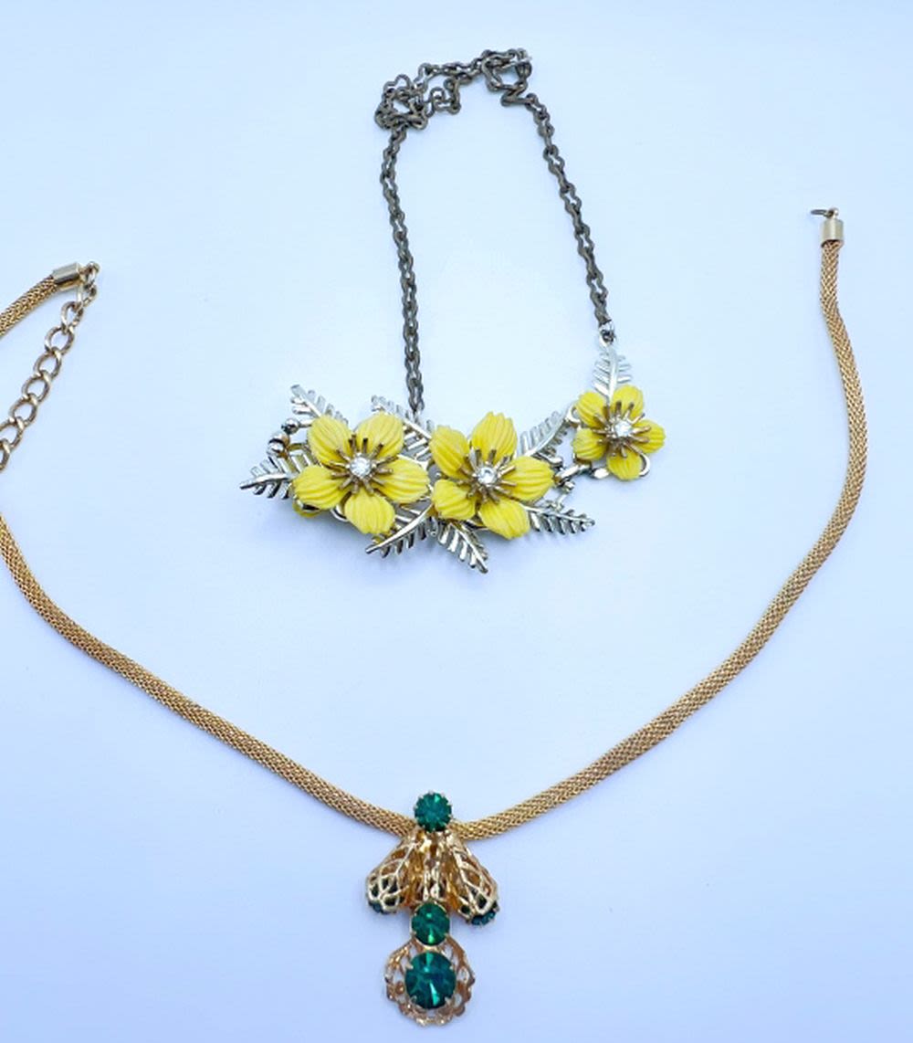 1 PLASTIC LEAVES, 1 W GREEN STONES ON GOLD TONE