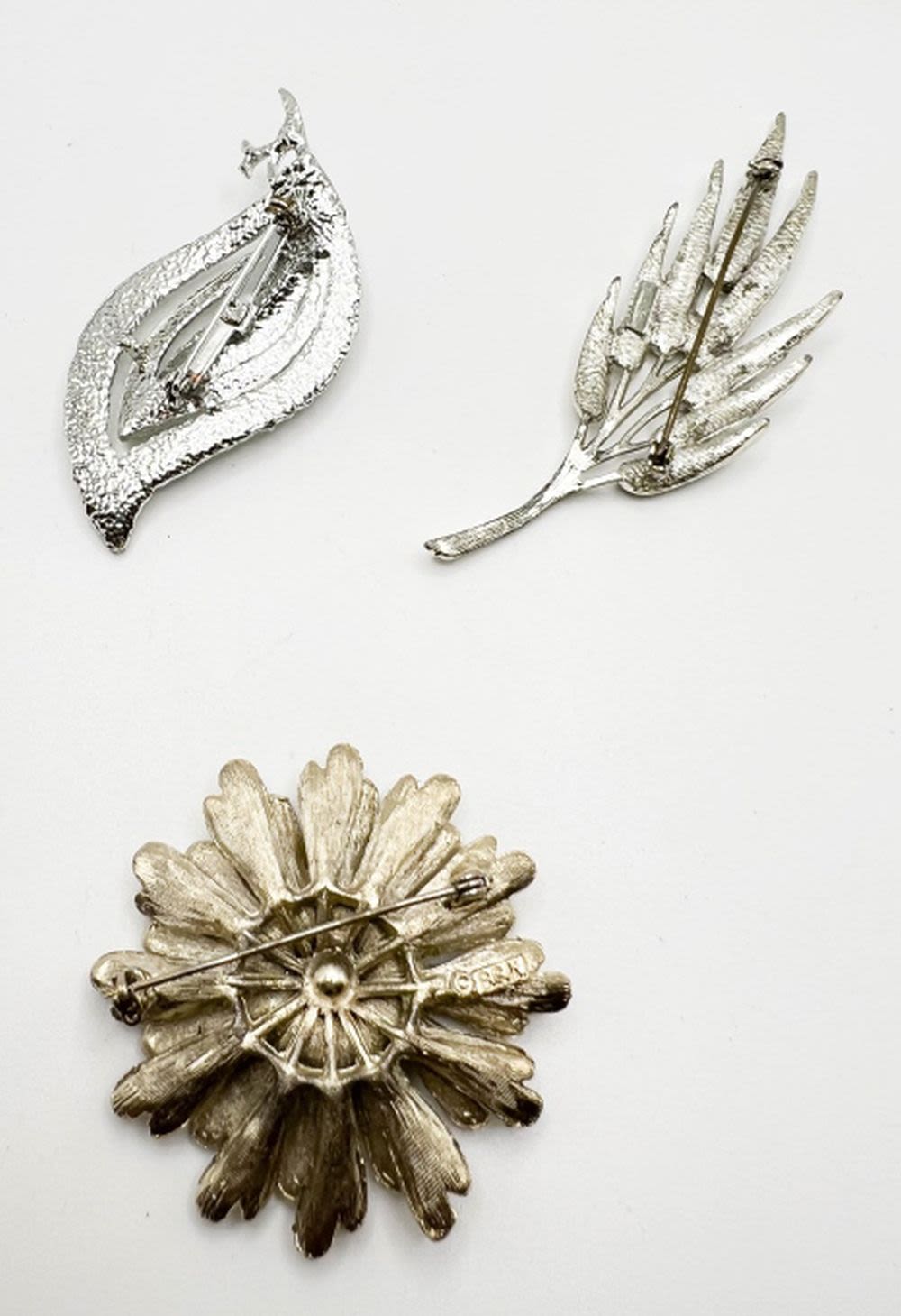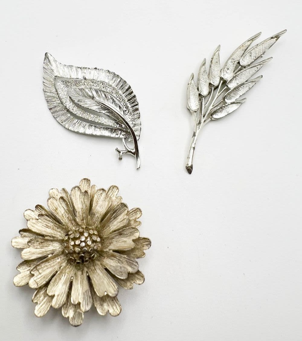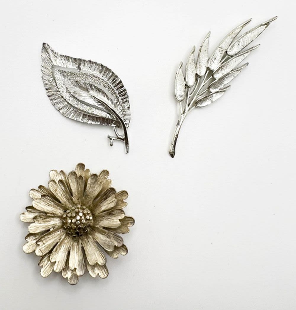 FLORAL AND LEAF BROOCHES, SILVER TONE