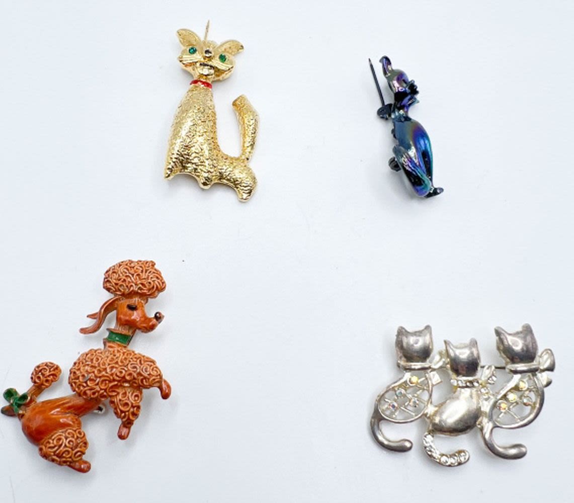 1 GERRY’S POODLE DOG, MEESCO CAT WITH GREEN EYES , 2 OTHER CAT W. STONE BROOCHES