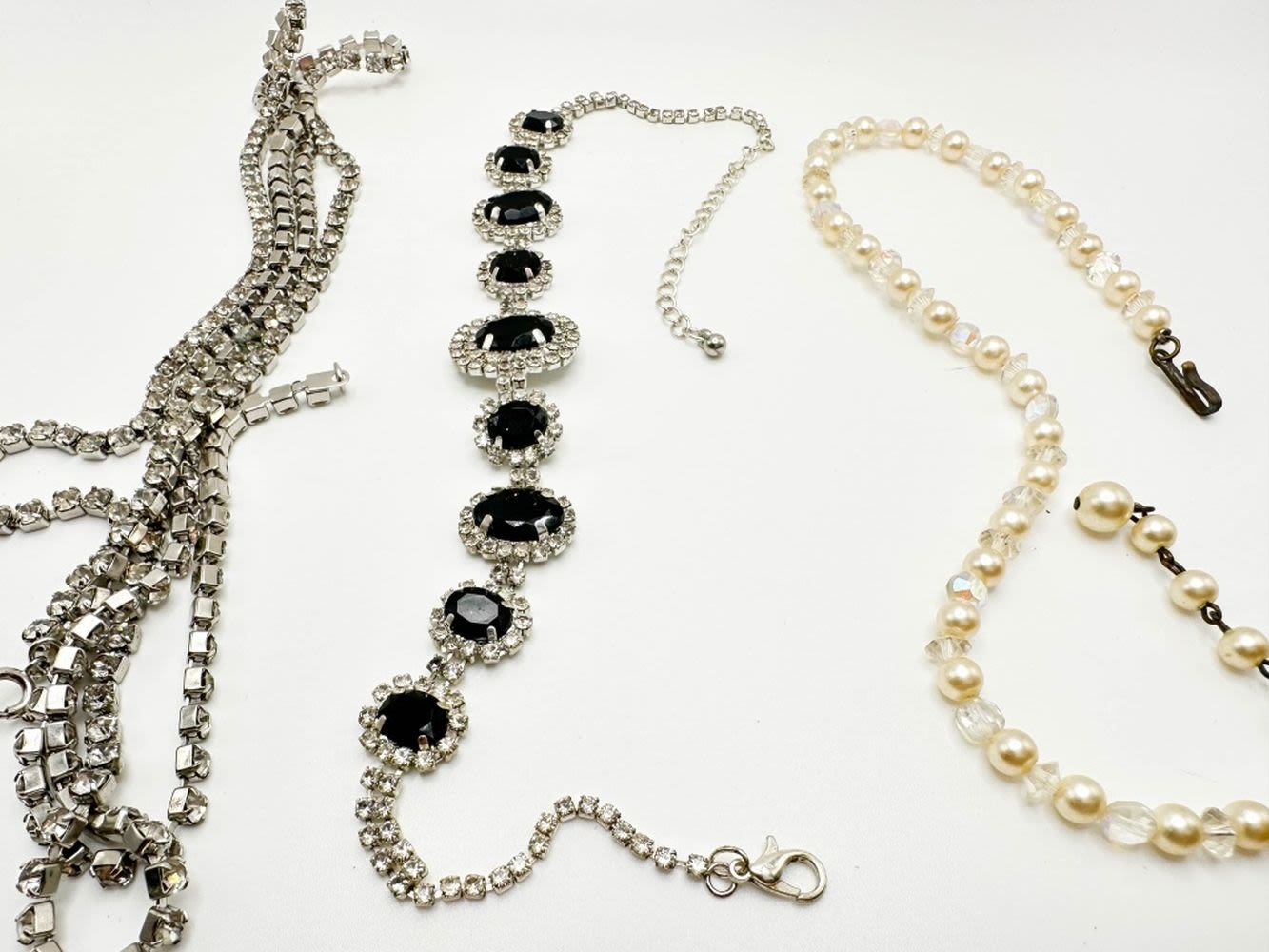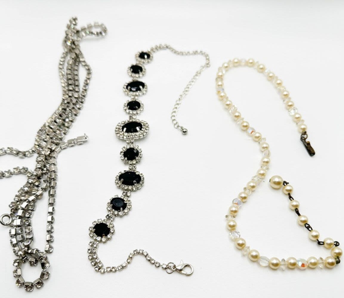 3 VINTAGE NECKLACE AND BLACK STONE BROOCH