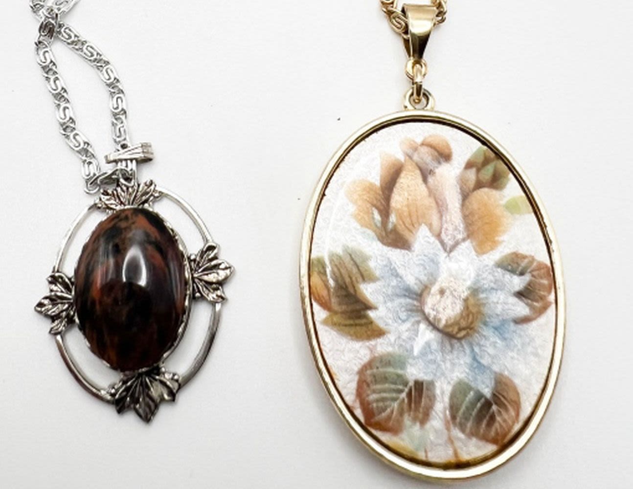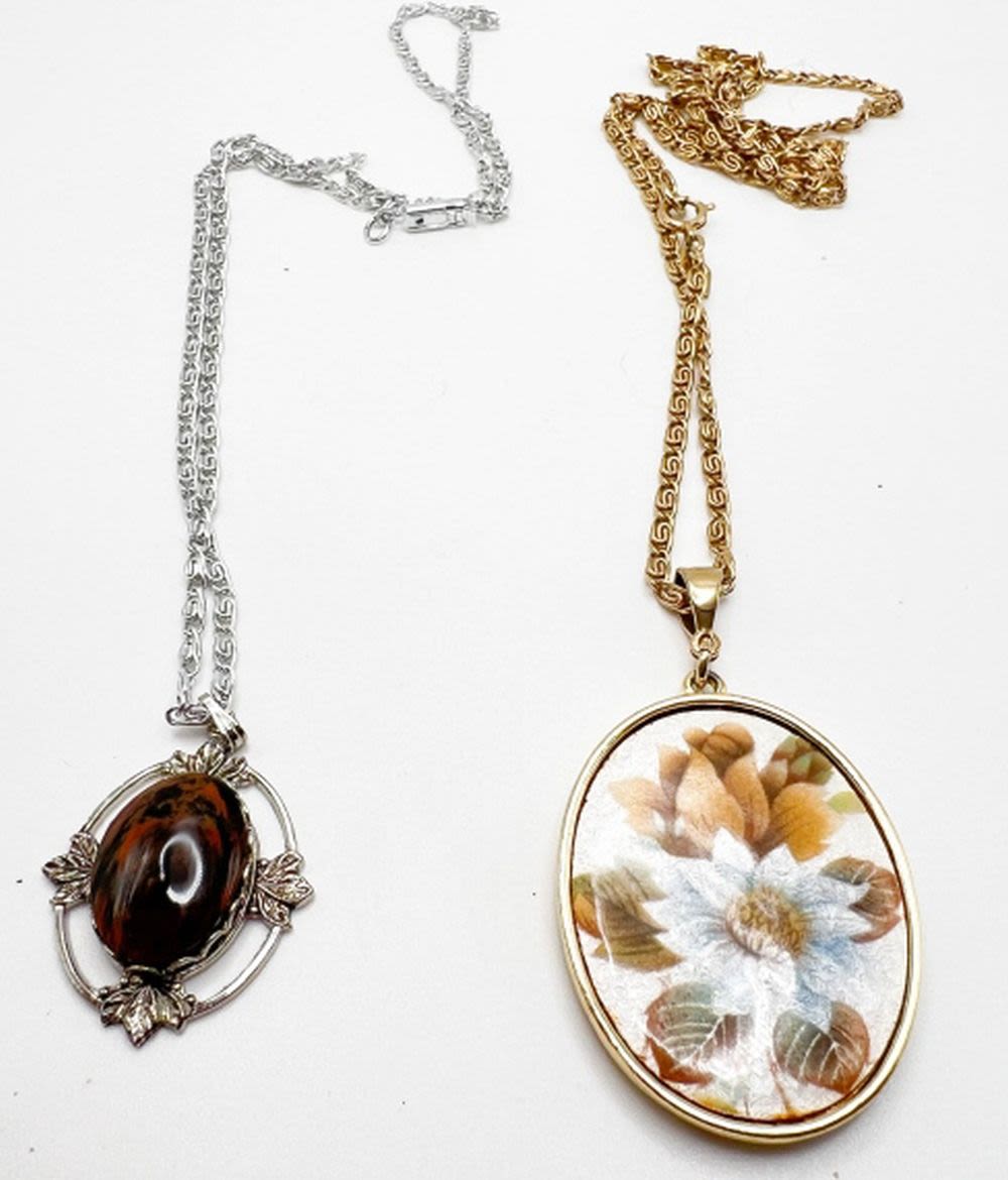 2 PENDANTS NECKLACES, FLORAL PAINTED AND STONES