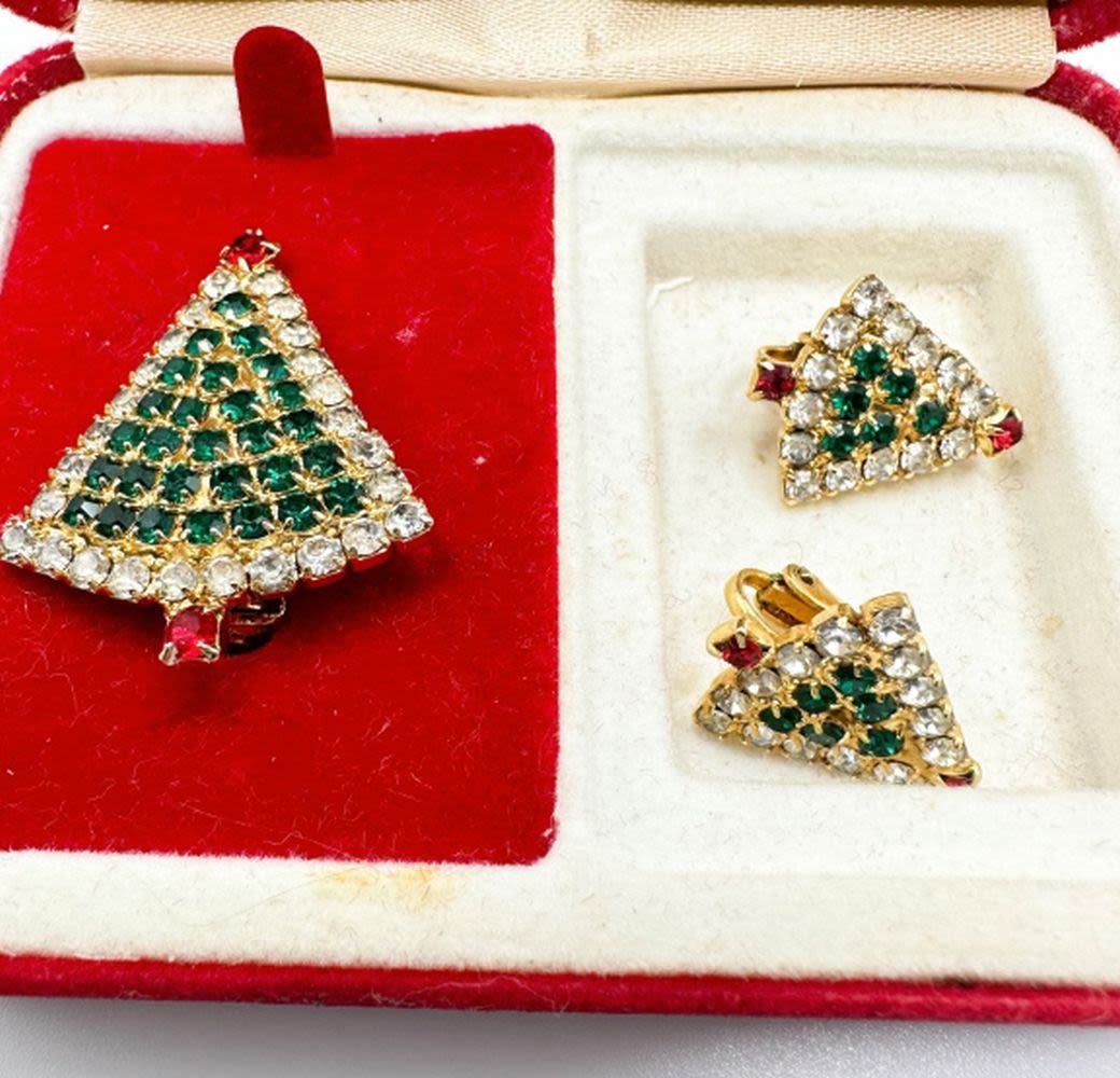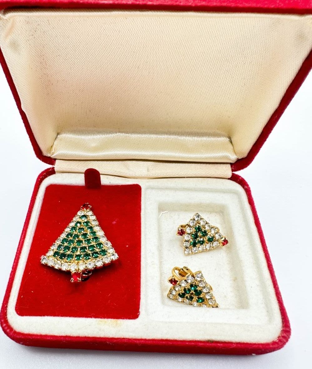 VINTAGE CHRISTMAS BROOCH TREE SET IN CLEAR, RED , GREEN RHINESTONES WITH CASE