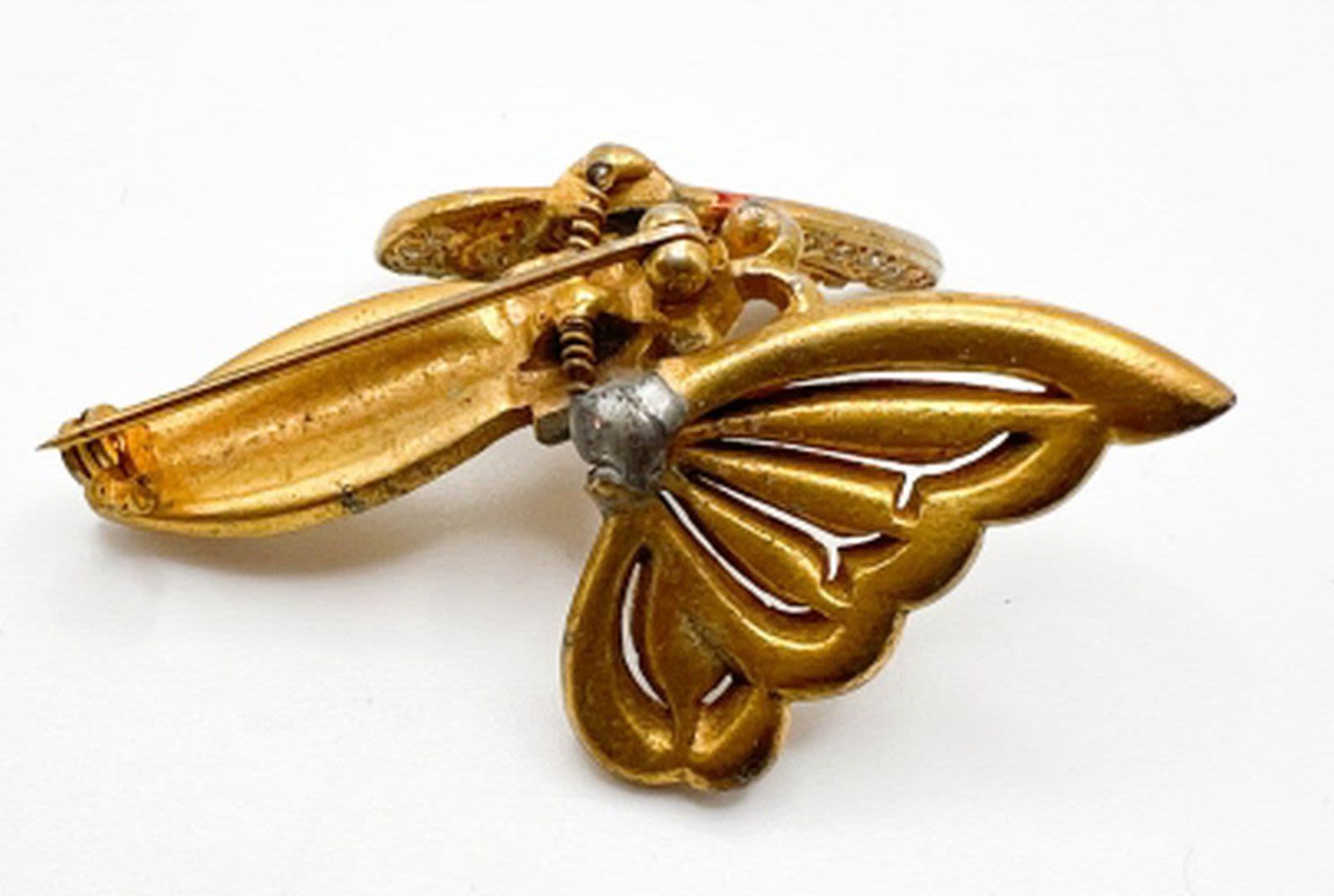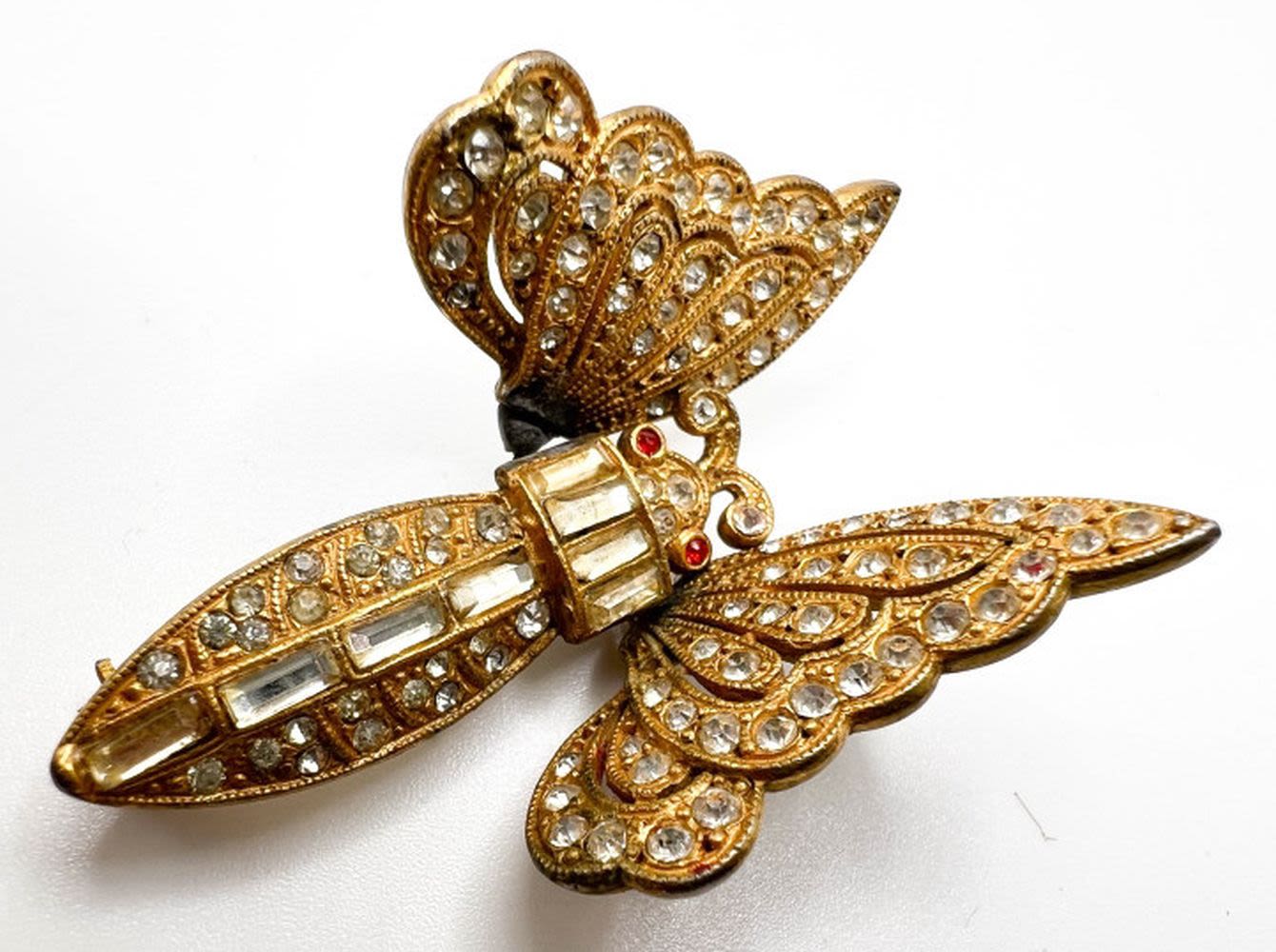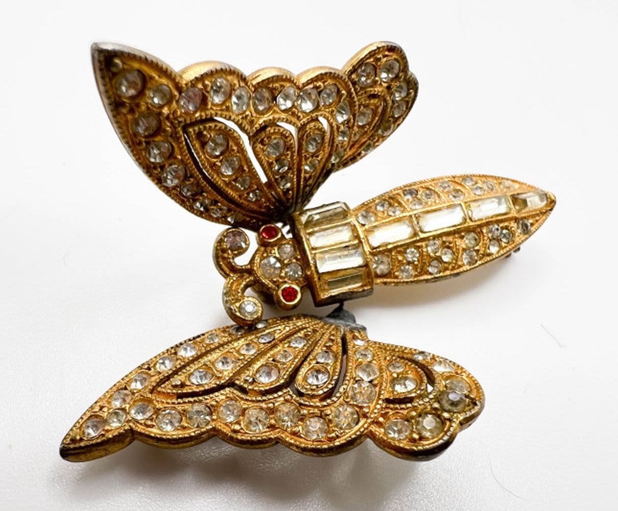 STUNNING HINGED WINGS BUTTERFLY WITH CLEAR STONES AND RED STONE EYES, BOTH WINGS MOVE !