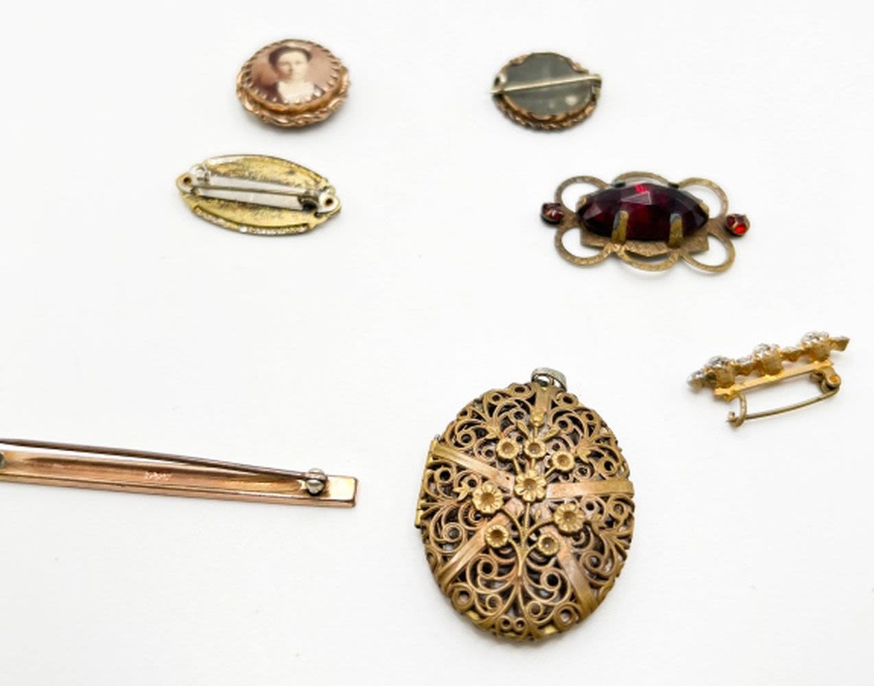 C CLASP BROOCHES, W STONES, CAMEO PORTRAITS, LARGE PENDANT, LARGE FILIGREE PENDANT, 1 SMALL MOTHER OF PEARL(?), 1 LARGE RUBY RED STONE PENDANT(?)