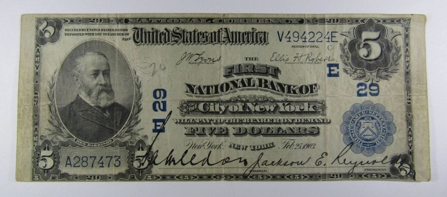 NICE CONDITION – THE FIRST NATIONAL BANK OF THE CITY OF NEW YORK, NY – FIVE DOLLAR NATIONAL CURRENCY