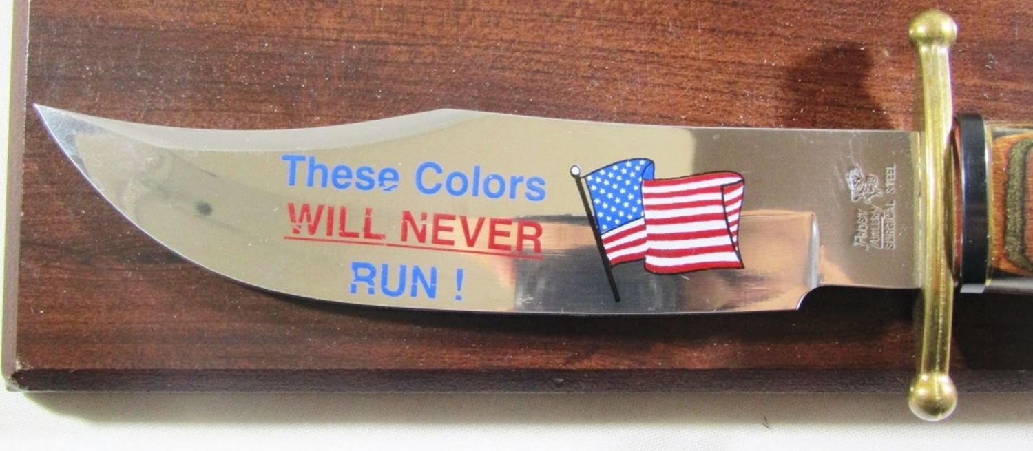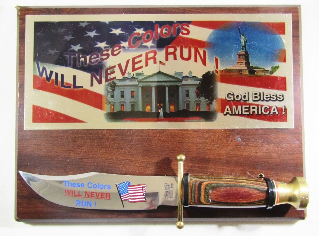 “These Colors Will Never Run!” Stamped on Blade and on Display Plaque!