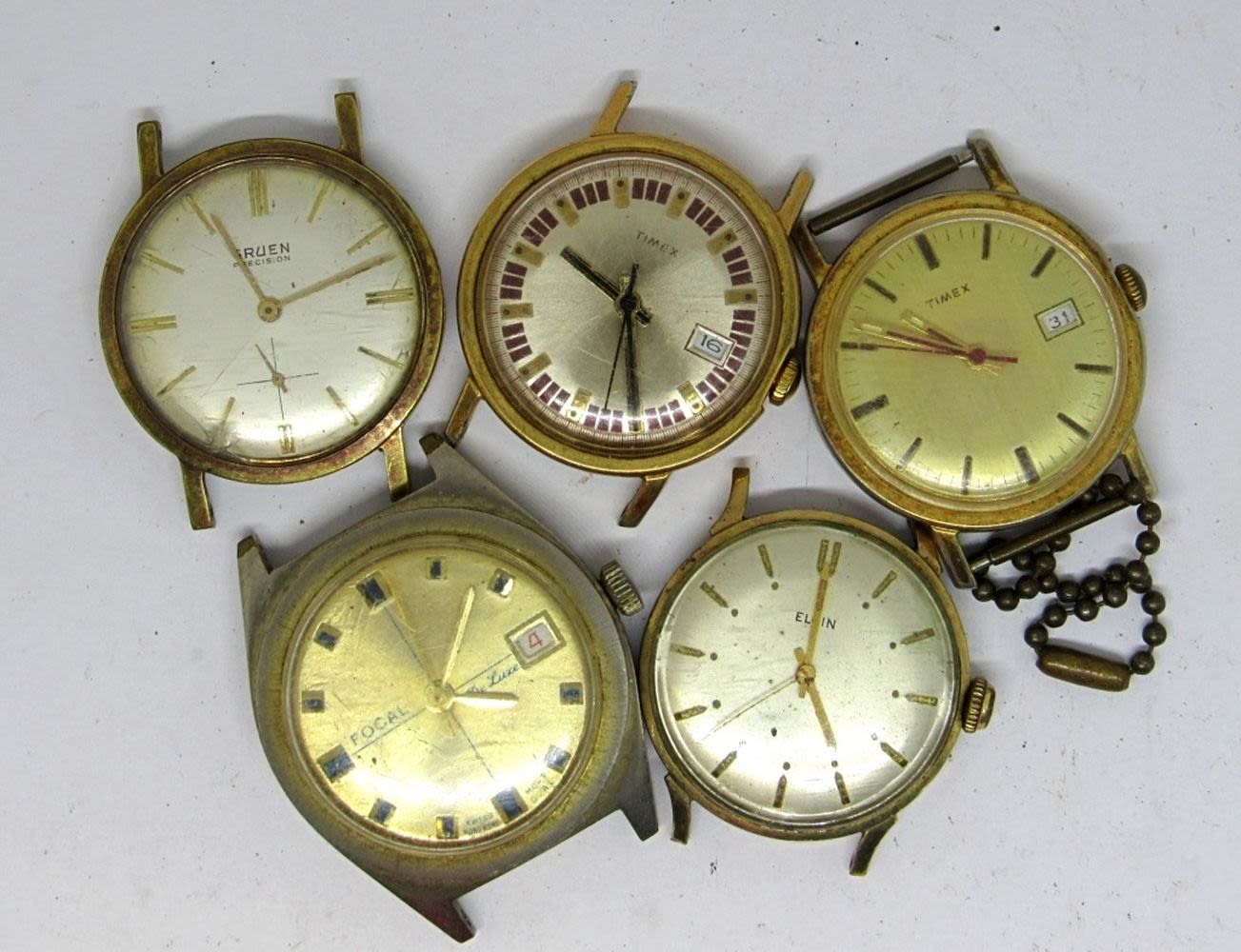 ELGIN, 2 TIMEX, FOCAL, GRUEN. UNTESTED.