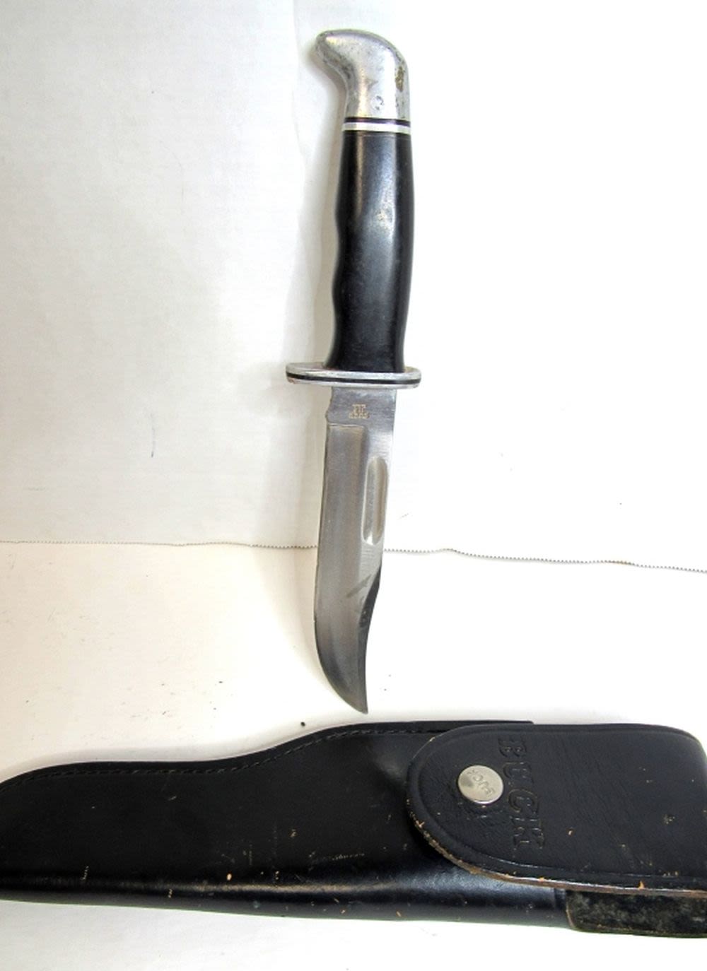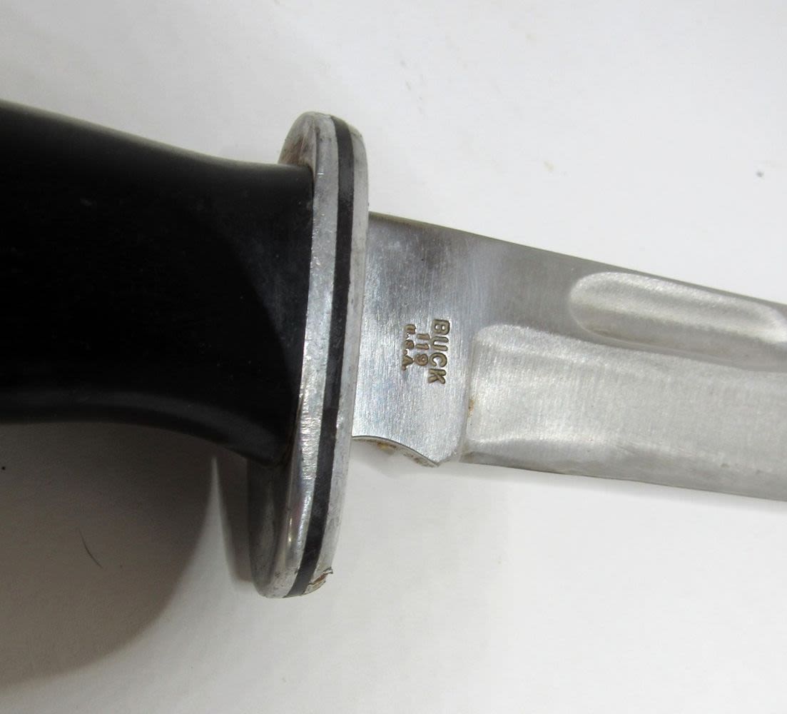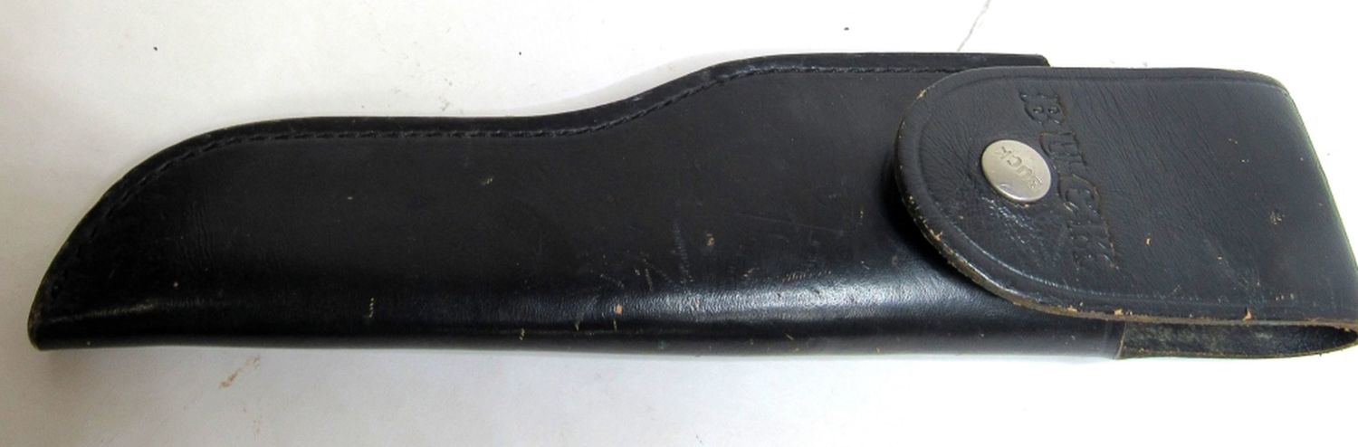 SMALL CRACKS IN HANDLE; SHEATH IS MARKED BUCK 119;