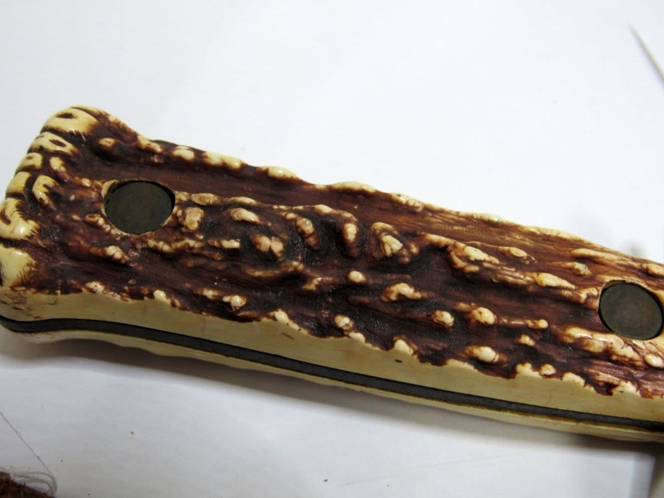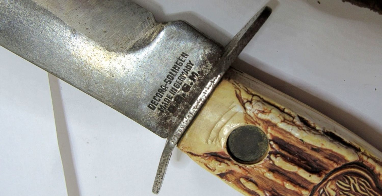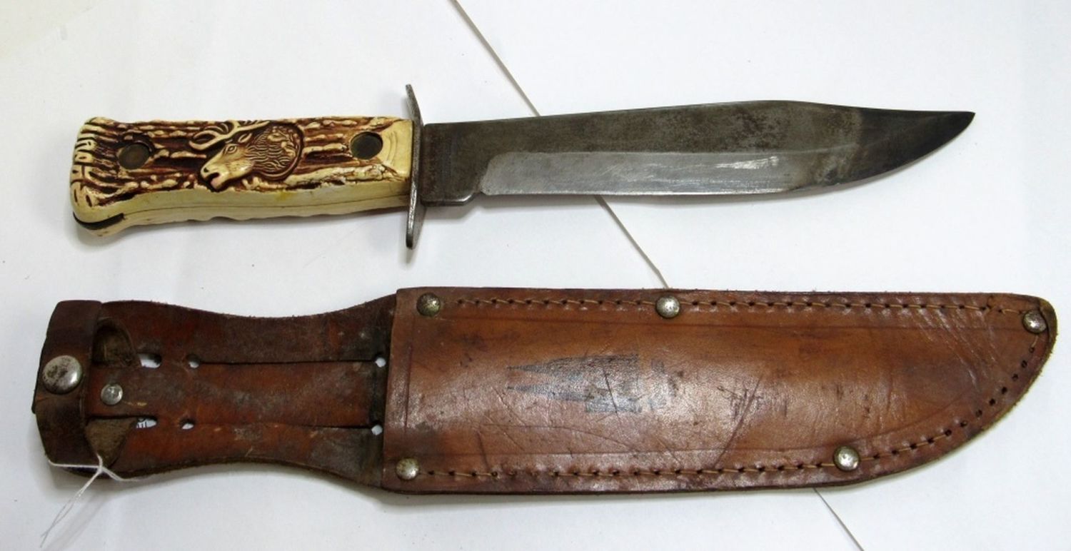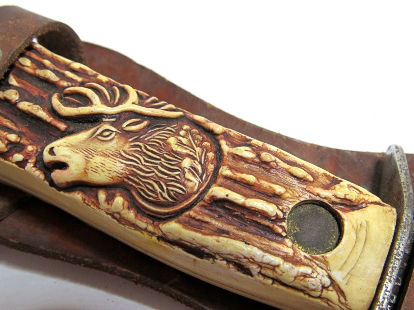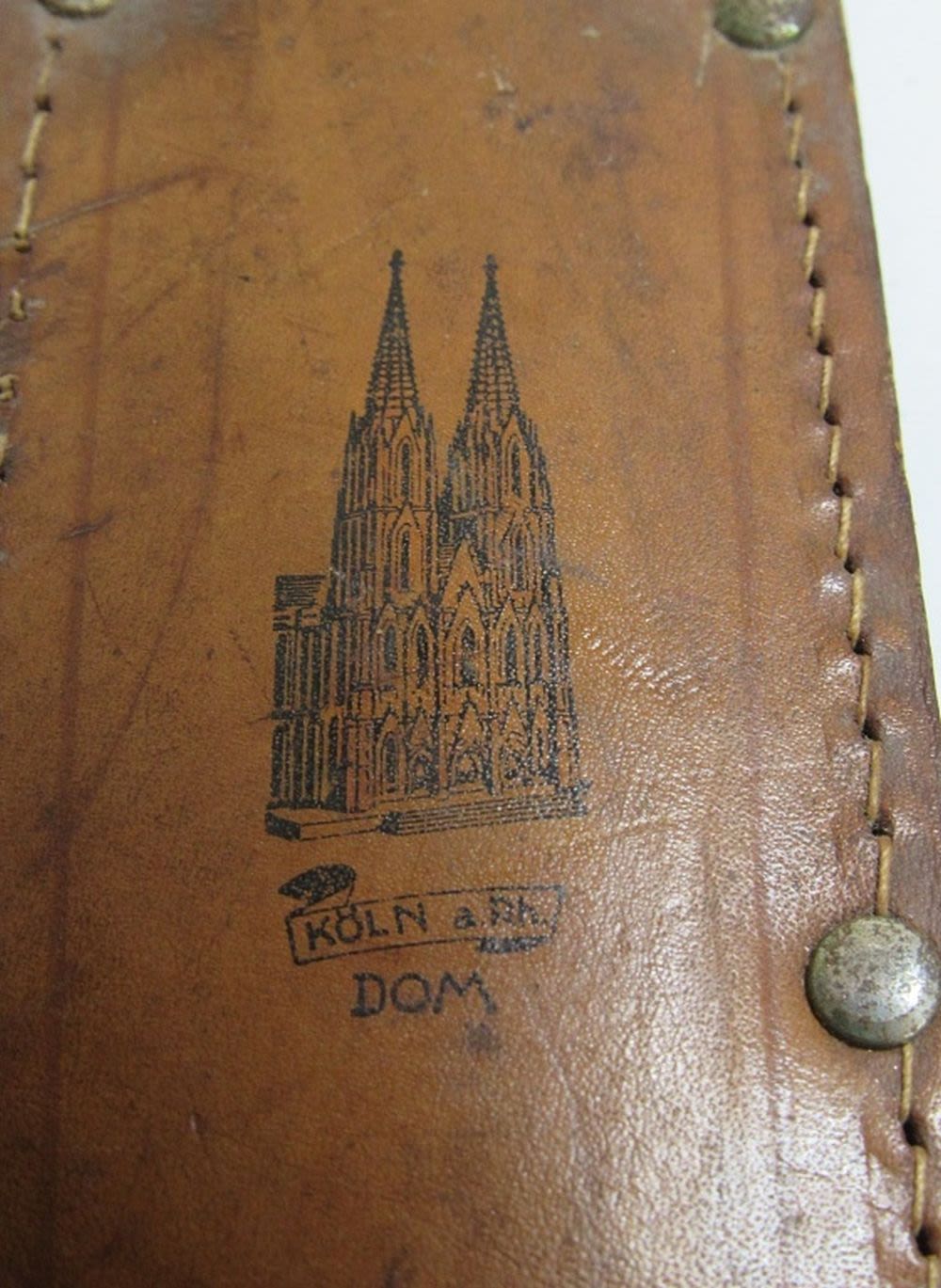 GERMANY CARVED ELK HANDLE AND LEATHER SHEATH MARKED “KOLN A. RH DOM” WITH PRINT OF THE CATHEDRAL!
