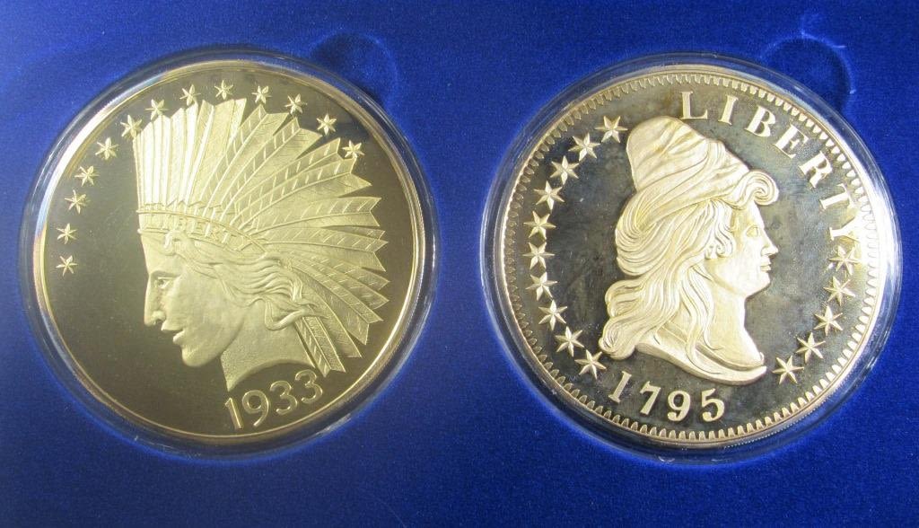 TWO 16 TROY OZ SILVER ROUNDS LAYERED IN 24K GOLD, 200TH ANNIVERSARY COLLECTION 1795 AND 1933 US $10 GOLD EAGLE REPLICAS, IN CASE WITH COA.