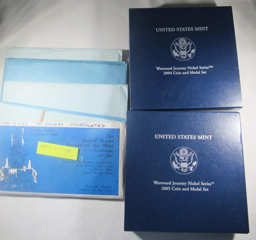 NICKEL COIN & MEDAL SETS, 1980 S.B.A SOUVENIR SET, AND 3-1981 MINT SOUVENIR SETS EACH WITH DENVER AND PHILADELPHIA SETS.