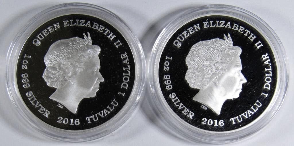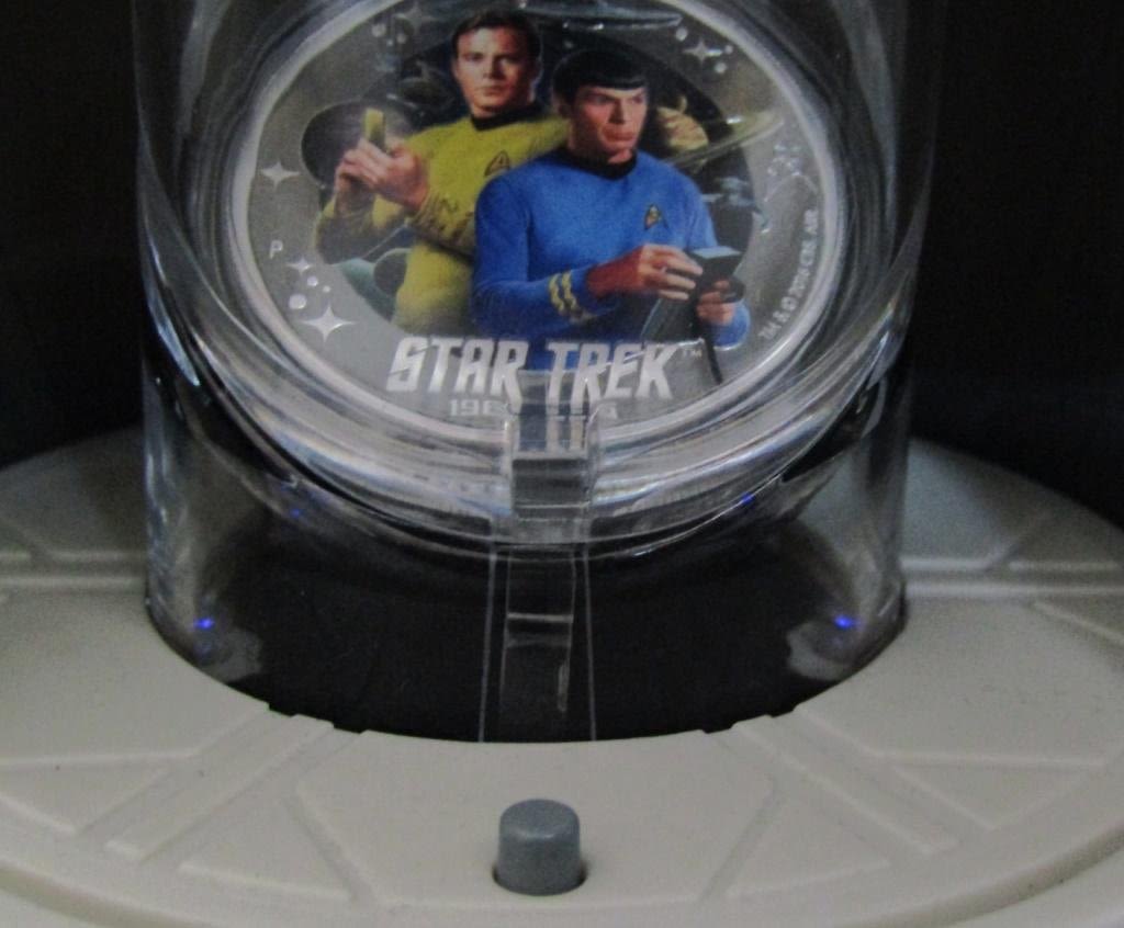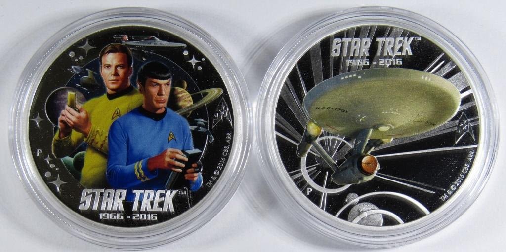 2 TUVALU 1oz SILVER COINS, KIRK & SPOCK AND USS ENTERPRISE NCC-1701, 50TH ANNIVERSARY, WITH ORIGINAL BOX, DISPLAY, AND COA.