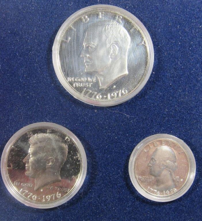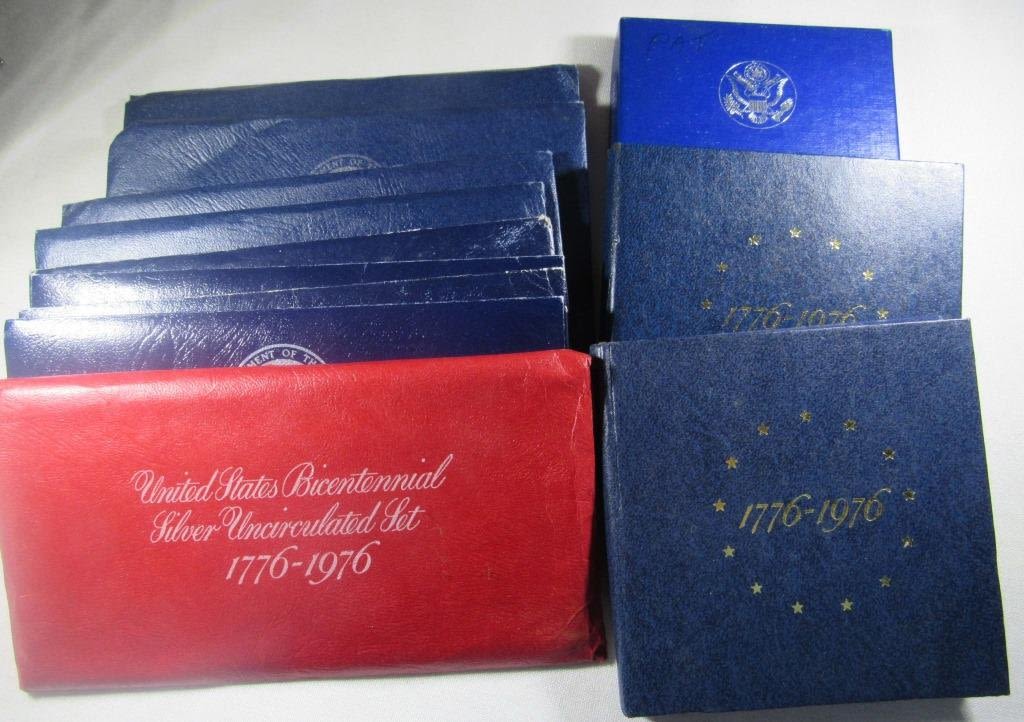IN ORIGINAL PACKAGING, 1976 BICENTTENNIAL SILVER MINT SET IN ORIG PACKAGING, 2-1976 BICENTENNIAL SILVER PROOF SETS, AND 1986 LIBERTY HALF DOLLAR