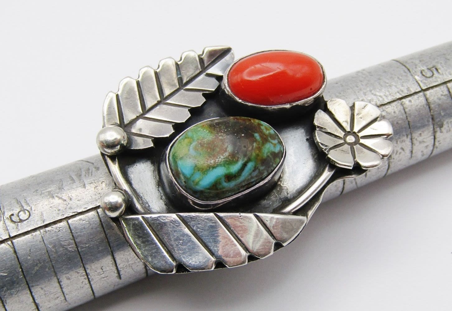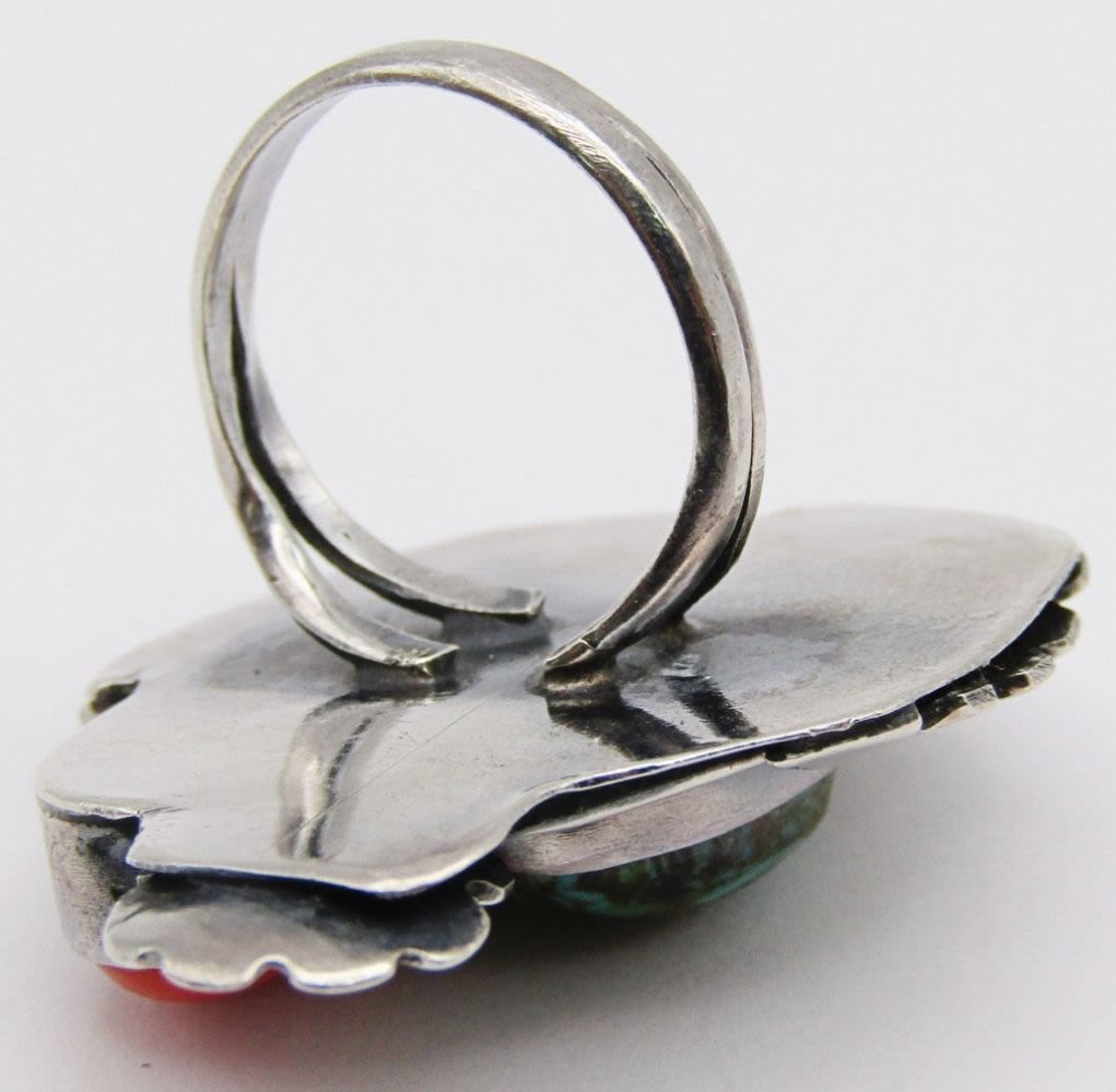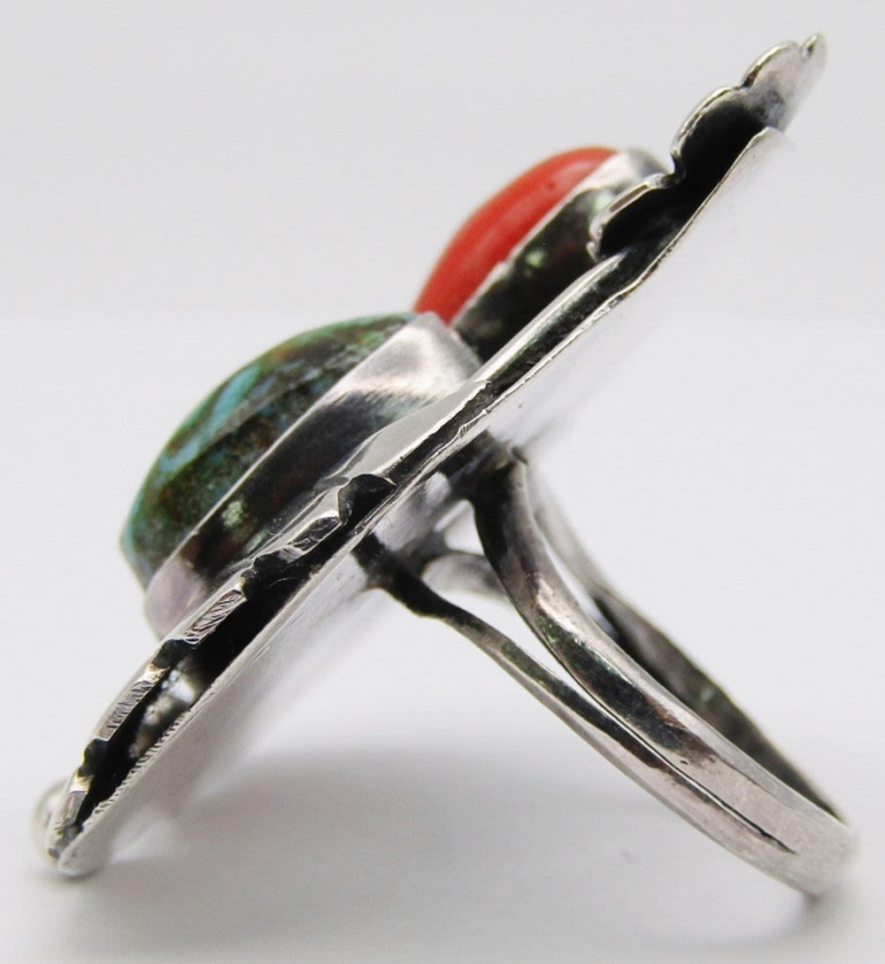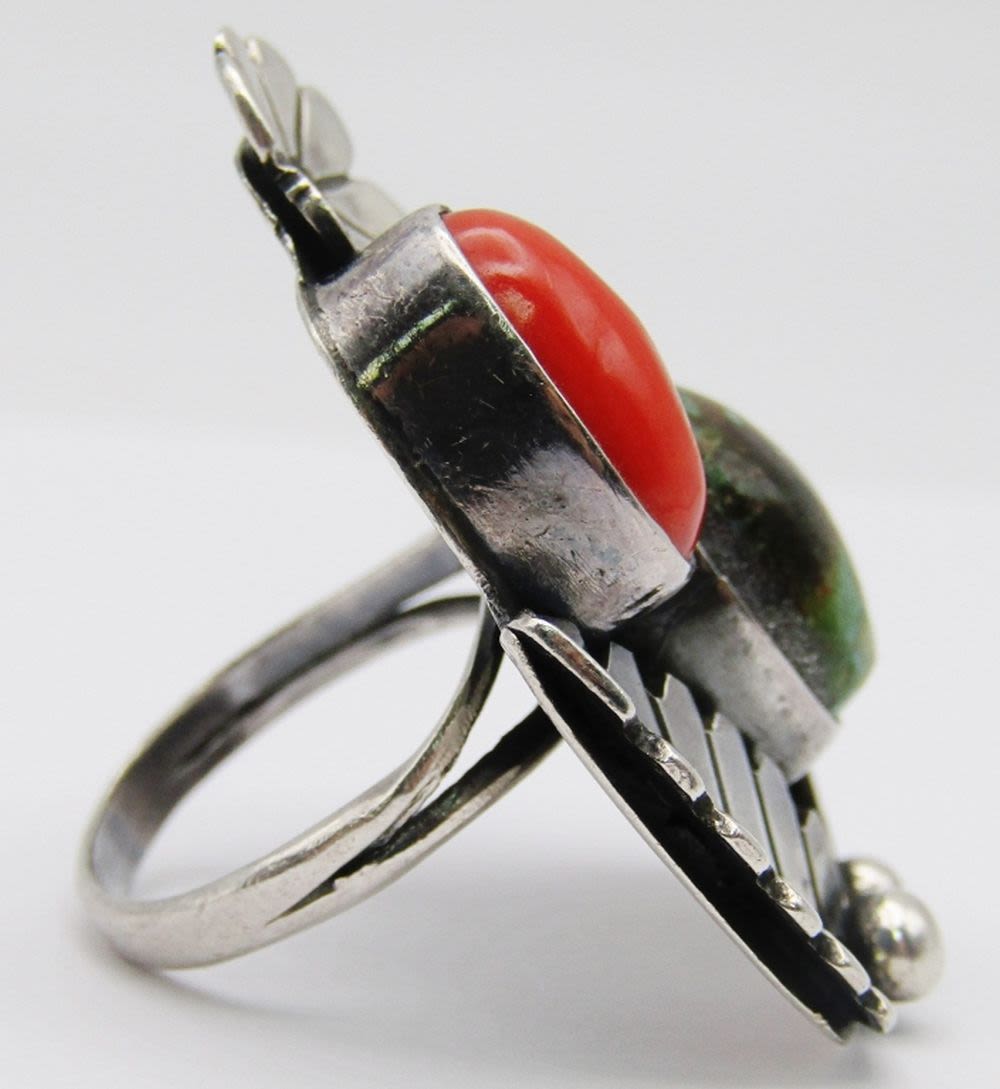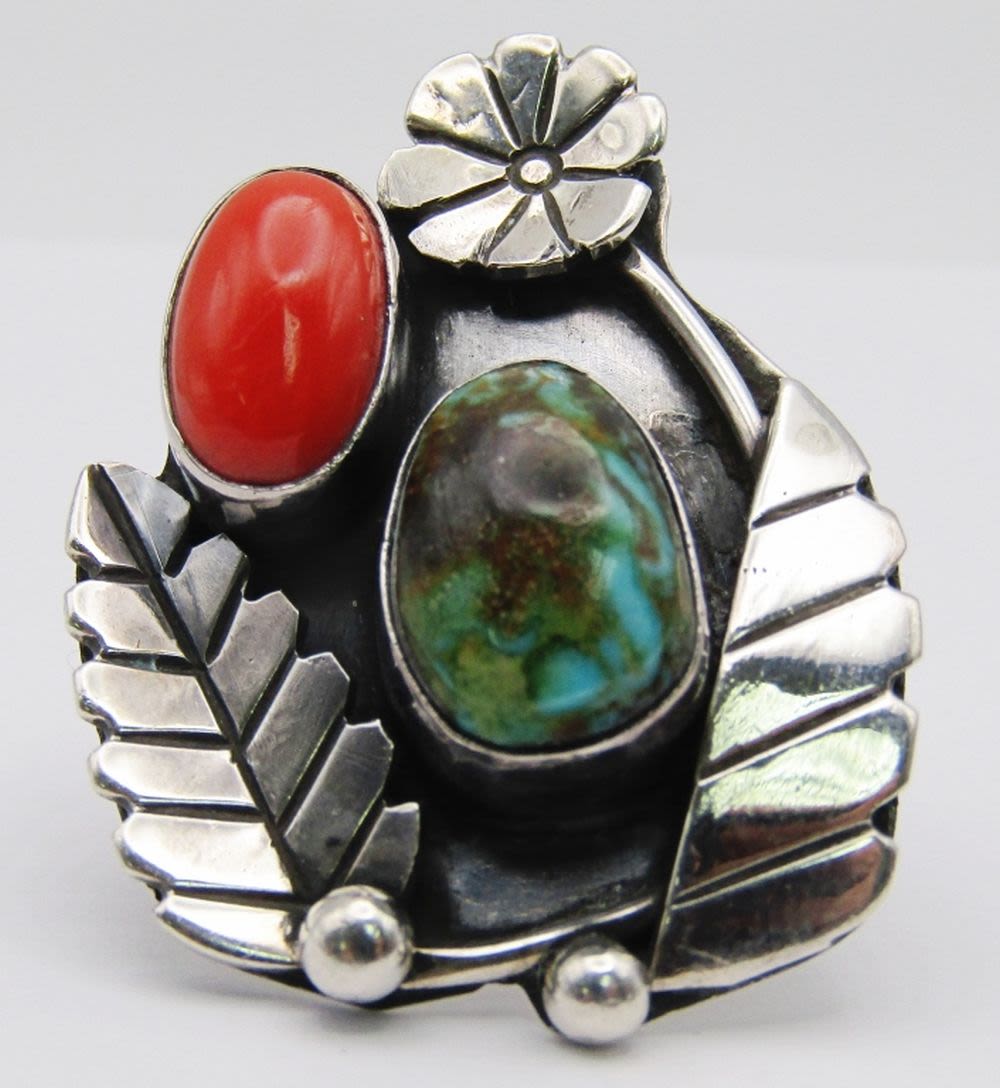 RED CORAL AND GREEN TURQUOISE STONES-LEAF DESIGN-RING SIZE 7.5-TOTAL 8 DWT