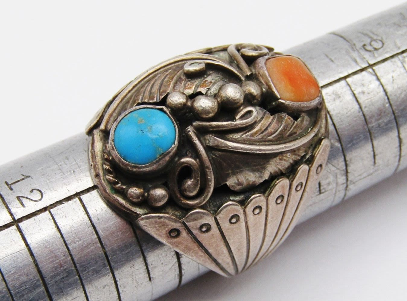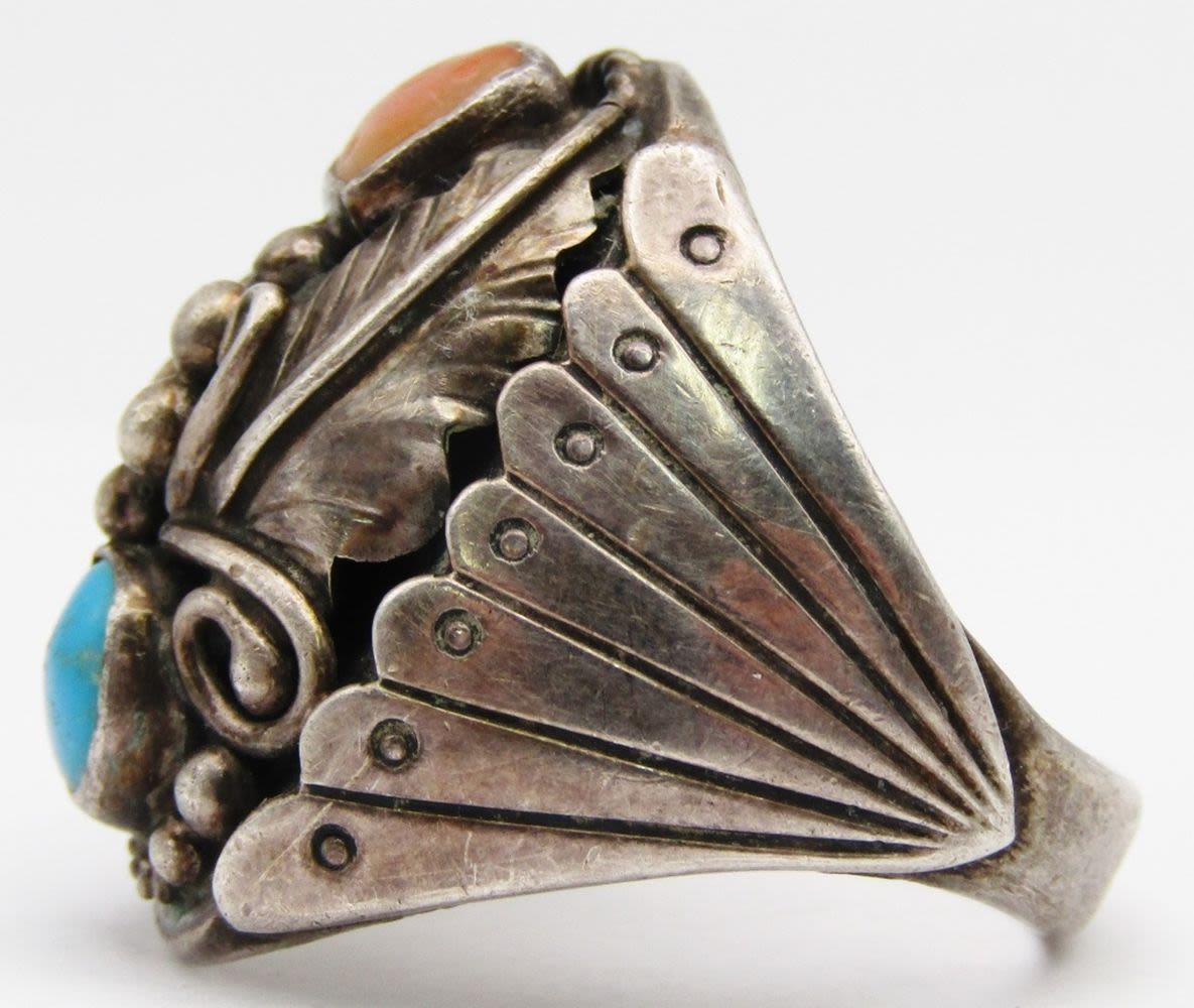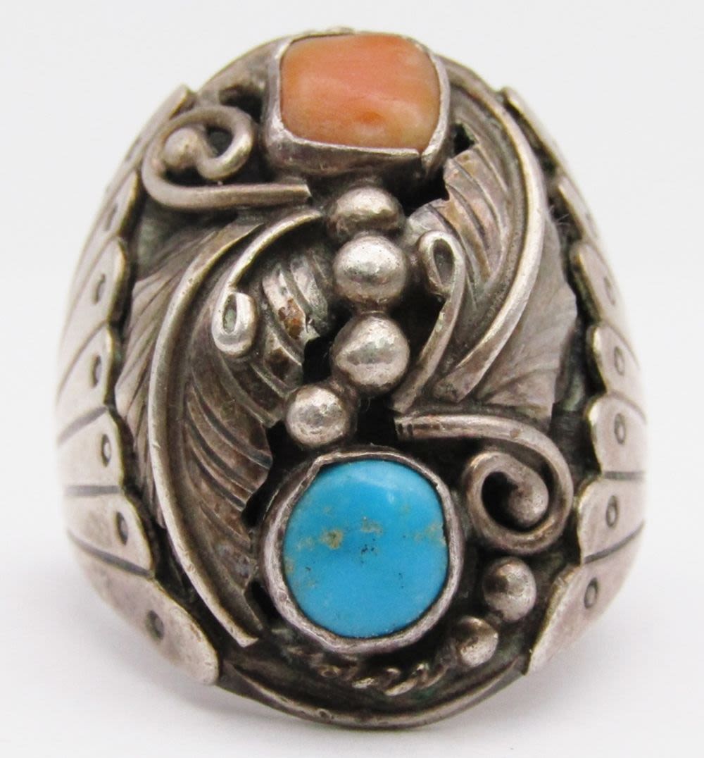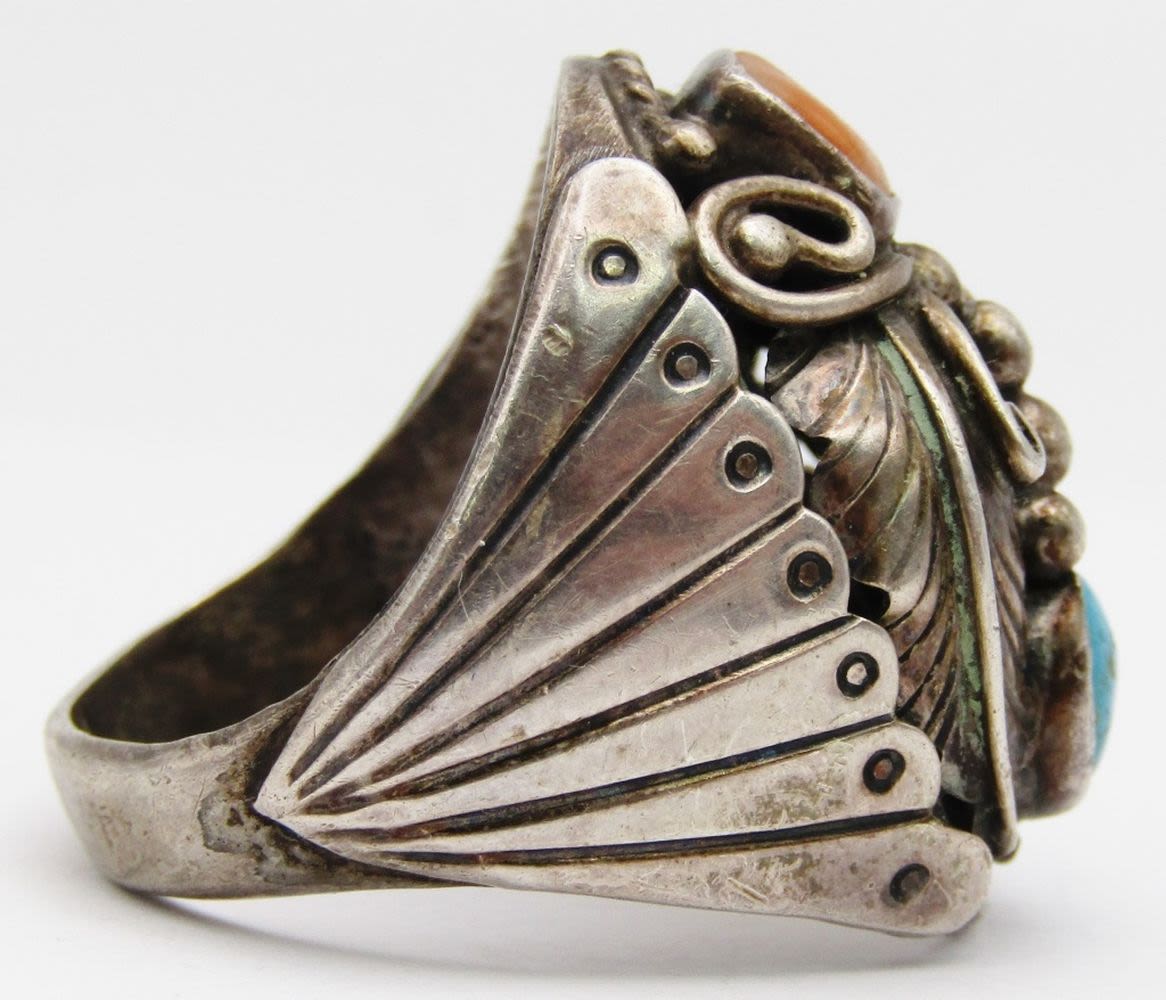 CORAL AND TURQUOISE STONES-GORGEOUS DESIGN-RING SIZE 10.5-TOTAL 15 DWT