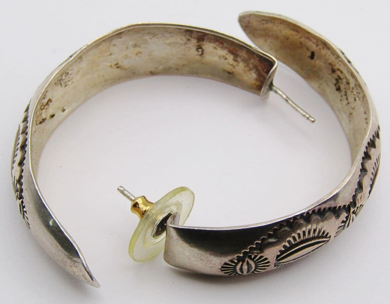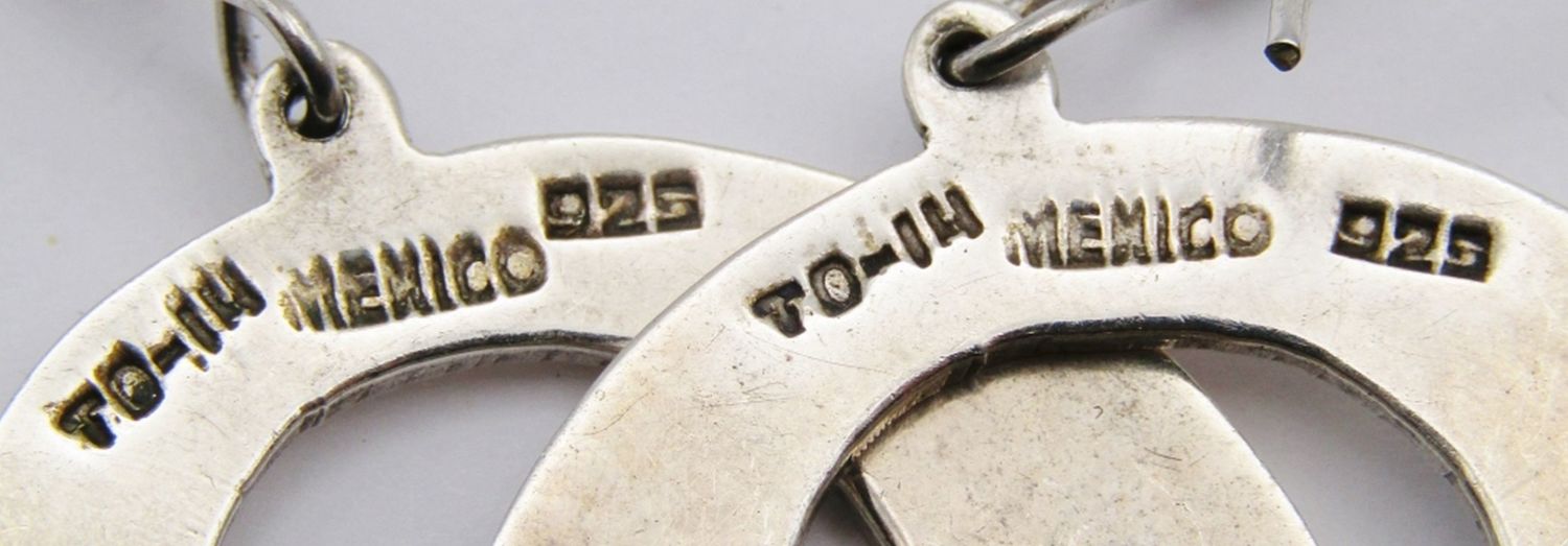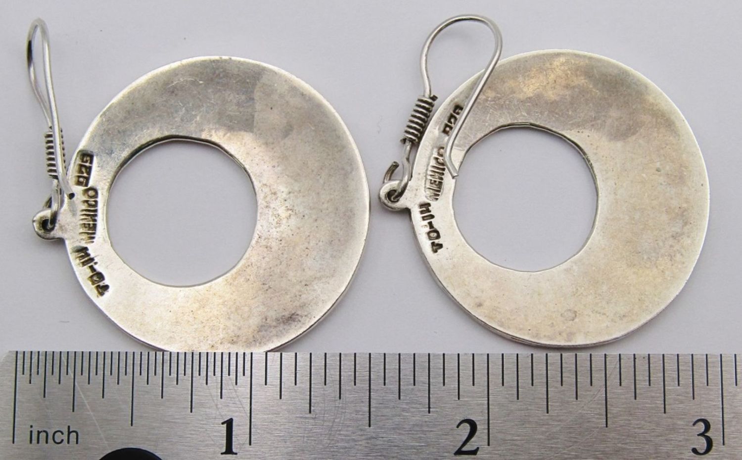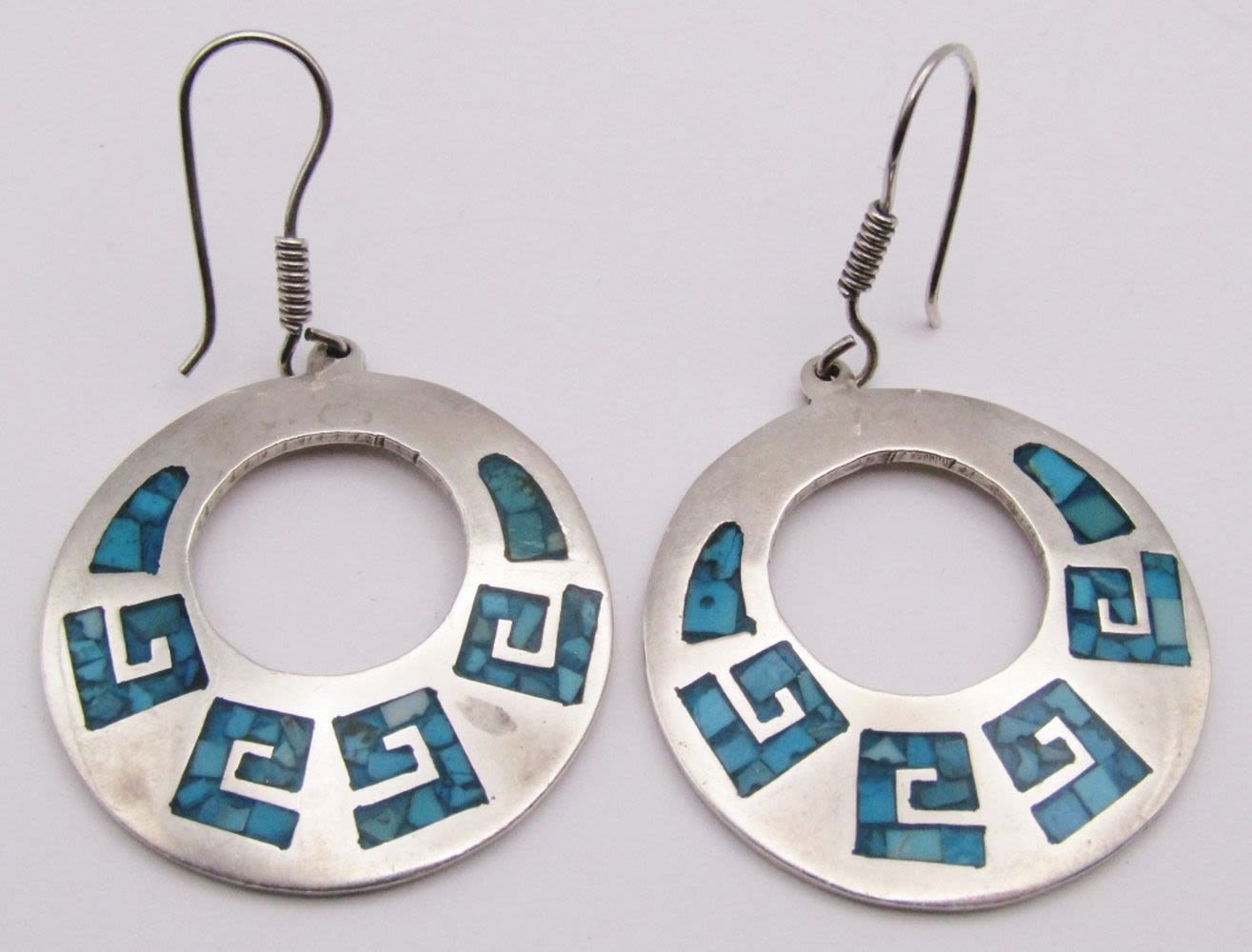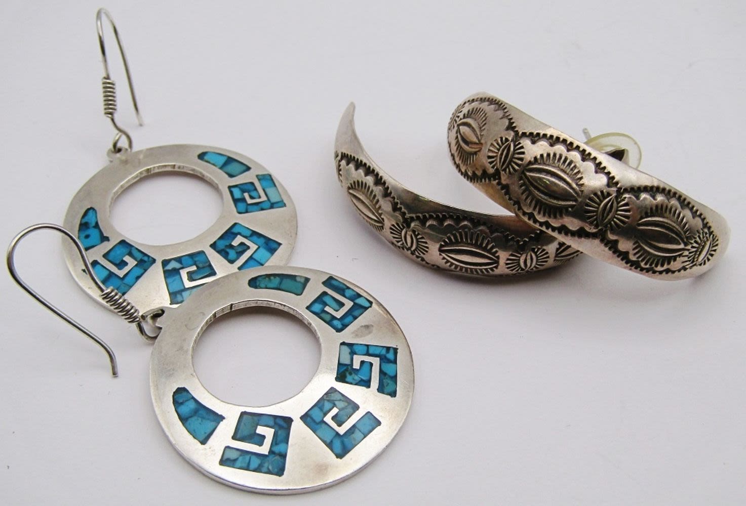 EARRINGS: (1)W TRACY MARKED HOOPS & (1)TD-14 MEXICO CIRCULAR DANGLY WITH CHIPPED TURQUOISE INLAY DESIGN-TOTAL 18 DWT