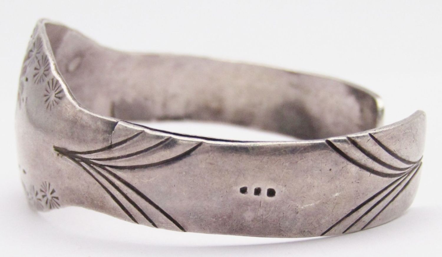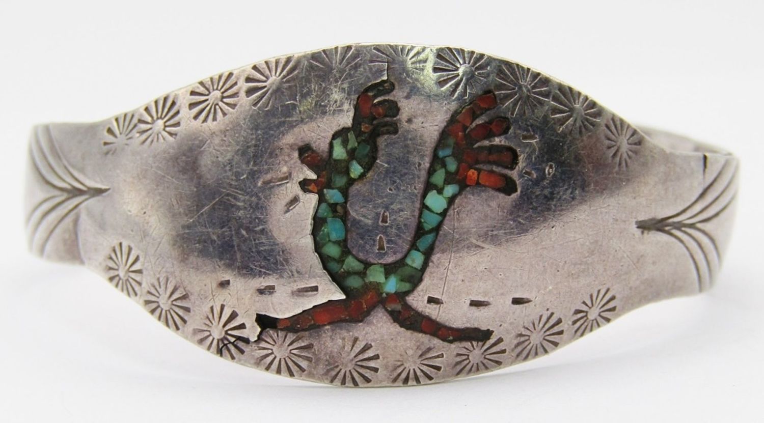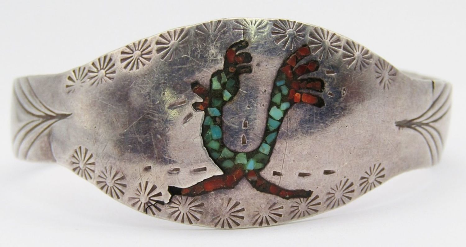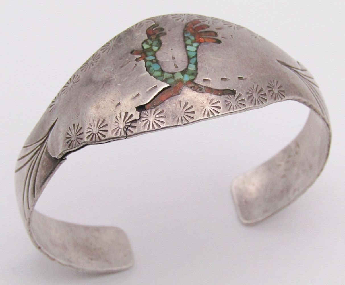TURQUOISE & RED CORAL ROADRUNNER INLAY DESIGN-BAND COULD USE SLIGHT REPAIR-MEASURES 6.5 INCHES WITH GAP-TOTAL 11 DWT